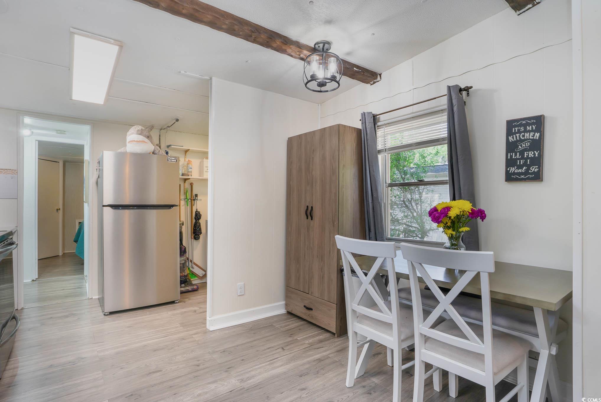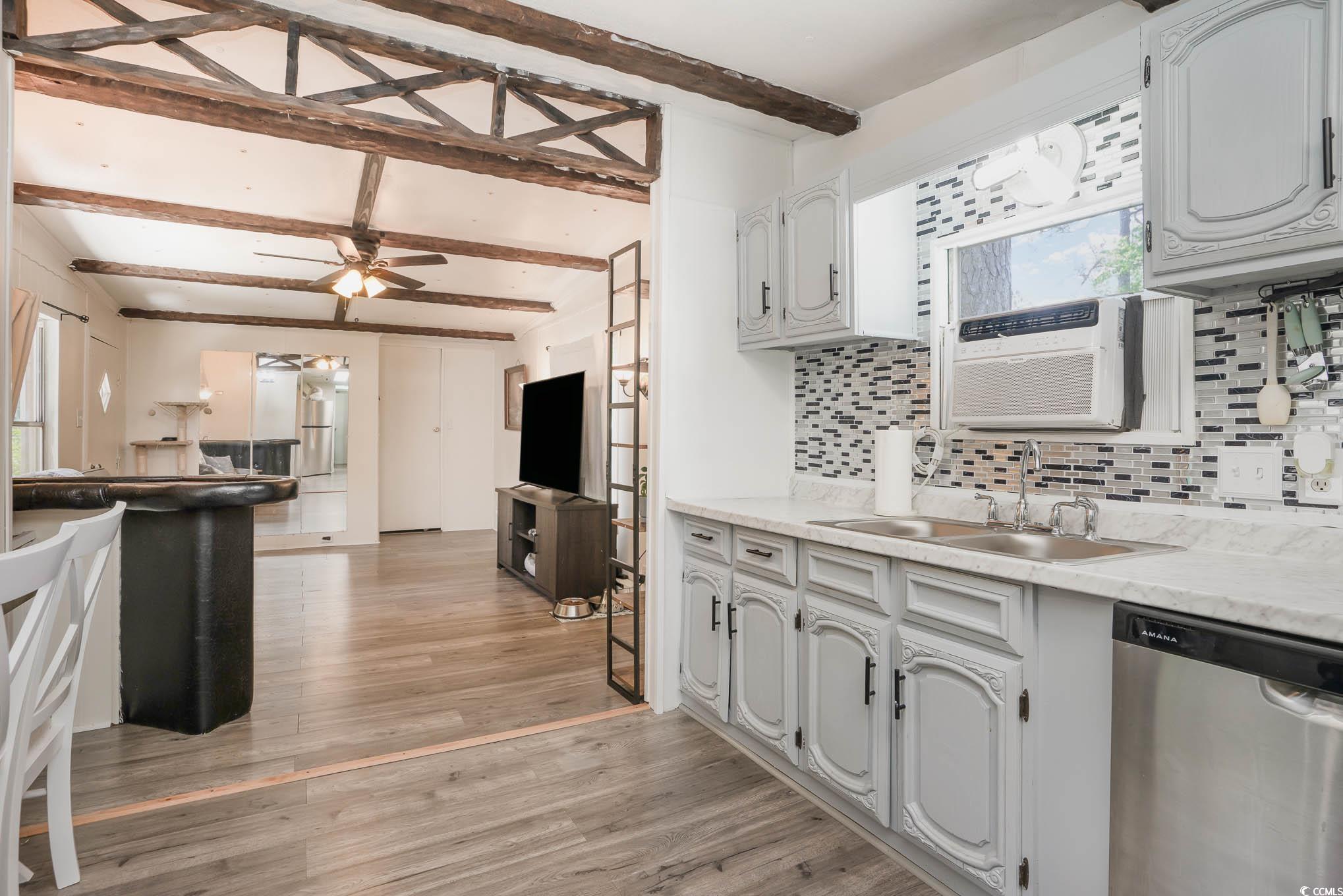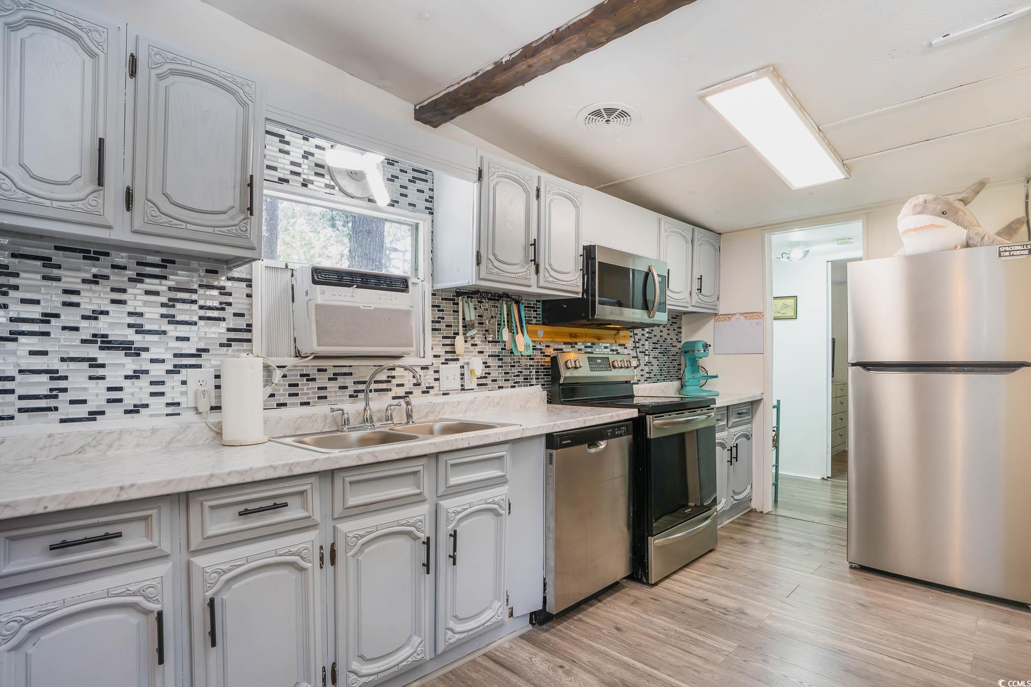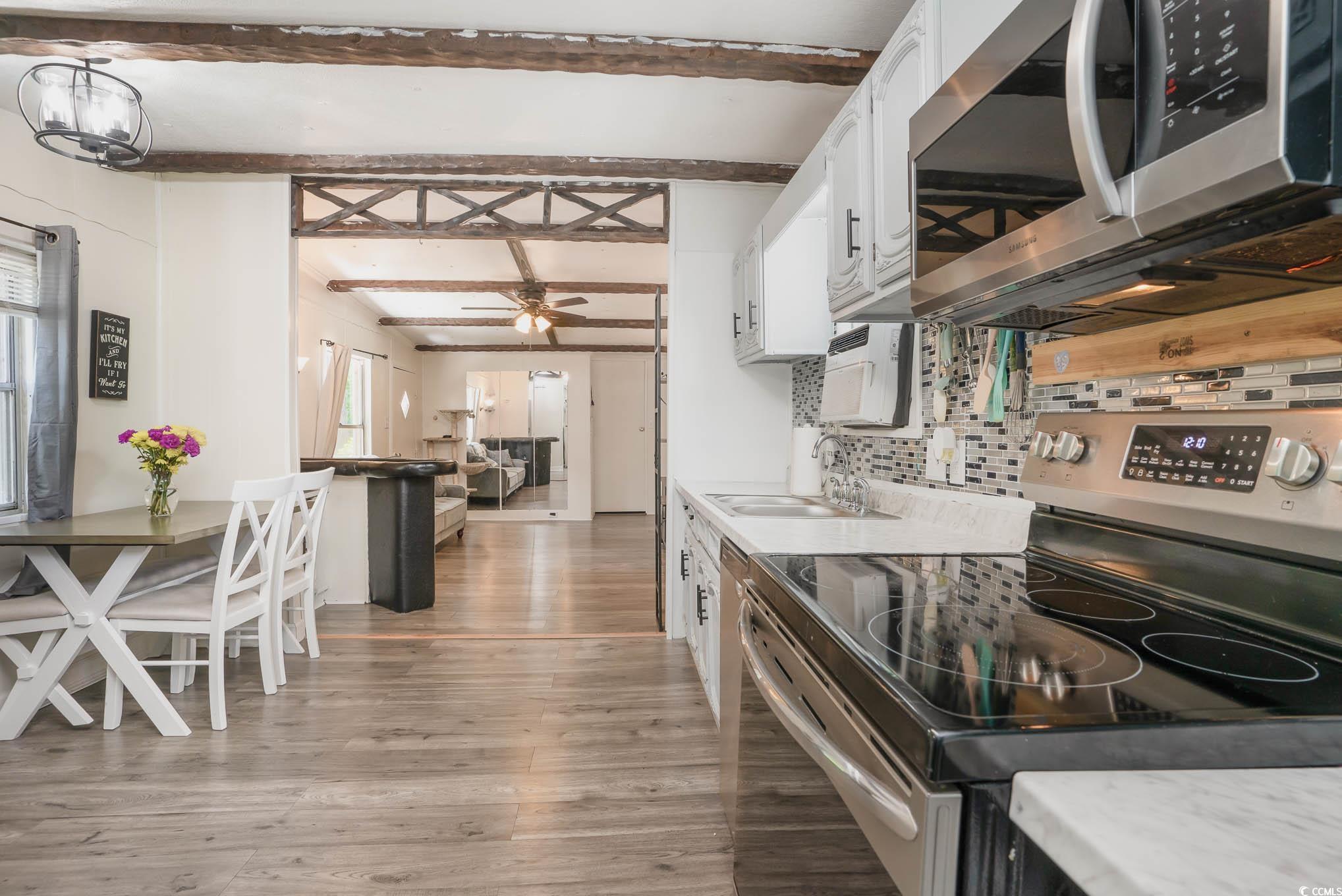 Welcome to this fully renovated and fully furnished 2-bedroom, 2-bathroom mobile home located on leased land in the highly desirable Murrells Inlet, South Carolina. This home has been completely remodeled from end to end—inside and out—offering a fresh, modern feel with thoughtful updates throughout. Major exterior improvements include a metal roof, vinyl siding and underpinning, and new window units in both the kitchen and master bedroom. Inside, the entire subflooring was replaced in 2020, and the living room, kitchen, and guest bedroom now feature beautiful hardwood floors, while the master bedroom, both bathrooms, and closets were updated with vinyl flooring . The kitchen was fully remodeled and is equipped with newer appliances including a stove, refrigerator, and dishwasher. The dryer was replaced in, adding to the home’s functionality. Both bathrooms were completely renovated in 2023, bringing in modern finishes and improved layouts. Additional updates include fresh paint, new molding, and stylish light fixtures, giving the home a bright and cohesive look throughout. Being sold fully furnished with new furnishings. Located in the heart of Murrells Inlet, this home offers convenient access to the Marsh Walk, great restaurants, shopping, and the beautiful South Carolina coastline. Whether you're searching for a primary home, a vacation retreat, or a turnkey investment property, this move-in-ready home has everything you need. Schedule your showing today and discover all the charm and value this home has to offer! Motivated Seller.