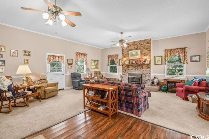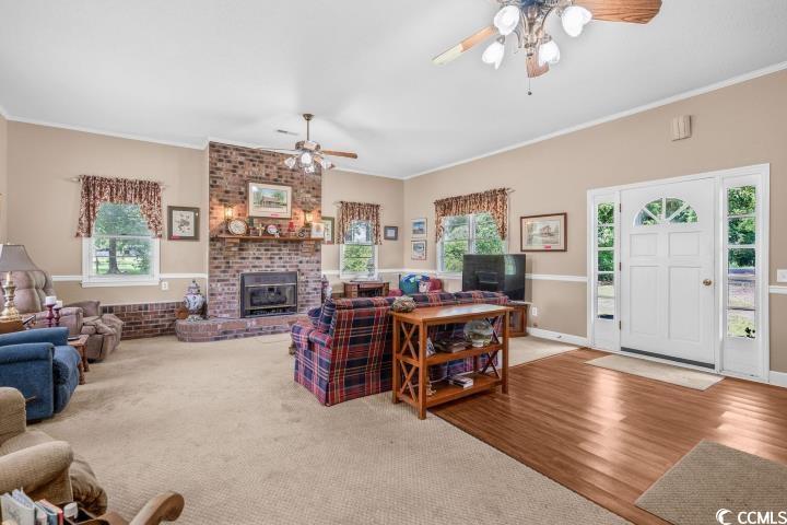 Welcome to this charming and spacious home that blends comfort, character, and functionality throughout. Located in the highly desirable Pleasant Hill community, this property offers the perfect blend of peaceful country living and modern convenience. The exterior features a combination of classic brick and low-maintenance vinyl siding, offering timeless curb appeal. Step inside to discover a unique sunken living room accented by a beautiful brick fireplace with gas logs—perfect for cozy evenings—and double ceiling fans that enhance comfort and airflow. The home boasts a mix of carpet and vinyl flooring, detailed with molding throughout. The kitchen is equipped with quality Kenmore appliances, warm wood cabinets, a convenient double sink, and a ceiling fan to keep the space breezy while you cook. Adjacent, the dining room also includes a ceiling fan and provides an inviting space for meals and gatherings. Storage is plentiful with built-in shelving in the formal living room, a spacious linen closet, and an organized laundry area featuring vinyl flooring, storage cabinets, and a practical mud sink. The sunroom, complete with a ceiling fan, offers a tranquil spot to unwind year-round. The home includes two comfortable bedrooms. Bedroom 1 offers cozy carpeting, a ceiling fan, and built-in shelving, while Bedroom 2 also includes carpet and a ceiling fan. The full bath features vinyl flooring, a vanity sink, a walk-in shower with sleek glass doors, and another linen closet for added convenience. A large walk-in closet with built-in shelving ensures ample storage for your wardrobe and more. Outside, a two-car carport located at the rear of the house provides protected parking and easy access to the home. Don’t miss your chance to own this well-maintained and versatile home—schedule your showing today!