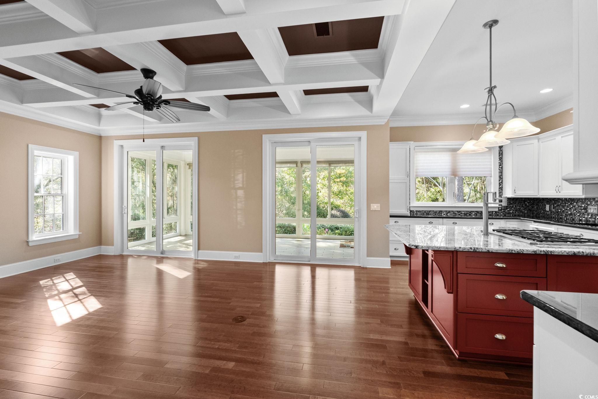 Set on a beautiful homesite in the sought-after Collins Creek Landing community, this 4-bedroom, 3.5-bath home blends thoughtful design with an elevated, modern-coastal feel. Wide hallways, spacious rooms, and intentional details make everyday living feel effortless. From impact-resistant windows to the hybrid HVAC with multiple zones, this home was built with longevity and comfort in mind. The kitchen is a standout—layered in texture and contrast with custom cabinetry, granite counters, a walk-in pantry, and high-end Thermador appliances. It's the kind of space that looks as good as it performs. The open family room features a coffered ceiling and flows into a 3-season sunroom where mornings hit different. Enjoy quiet views of the protected natural backdrop and a fenced yard finished with a paver patio and manicured Zoysia lawn. The primary suite offers privacy and calm, complete with custom closet systems and its own climate control. All baths feature upscale finishes with generous counter space and tilework. A mud room with built-in shelving keeps daily life organized, and the oversized garage includes a 50 amp/220V outlet ready for EV charging. Collins Creek Landing offers resort-style amenities including pool, clubhouse, nature trails, basketball courts, a community boat launch, and day dock access to the Waccamaw River. The home itself offers balance—style and substance, comfort and quality, all within one of Murrells Inlet’s most desirable gated enclaves. Arrange a tour today - don't delay!