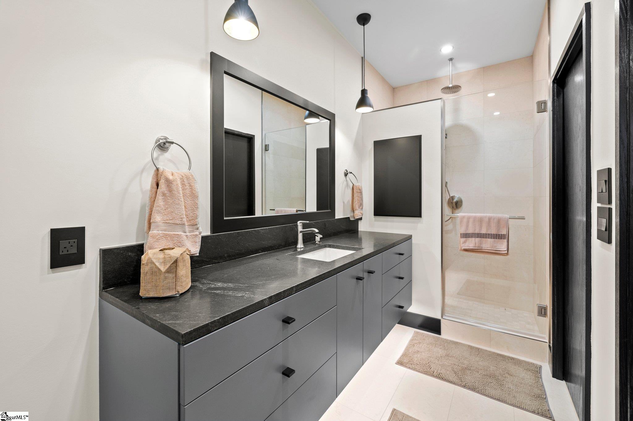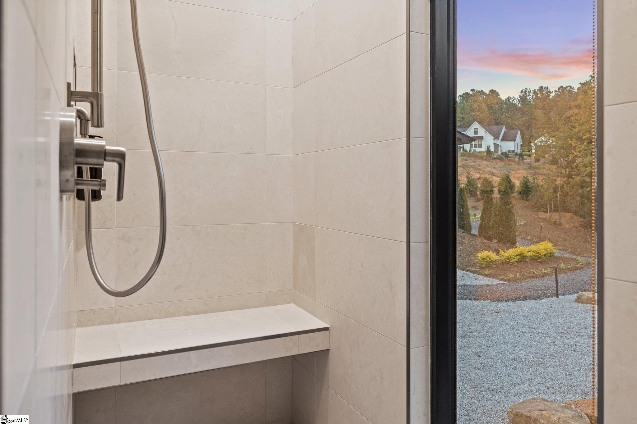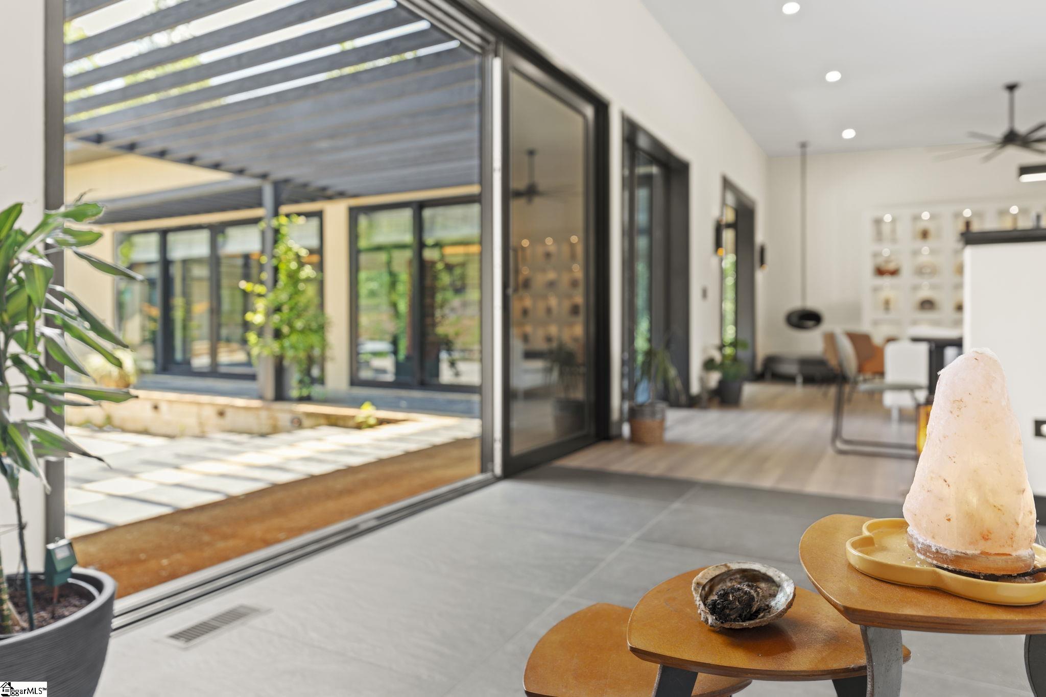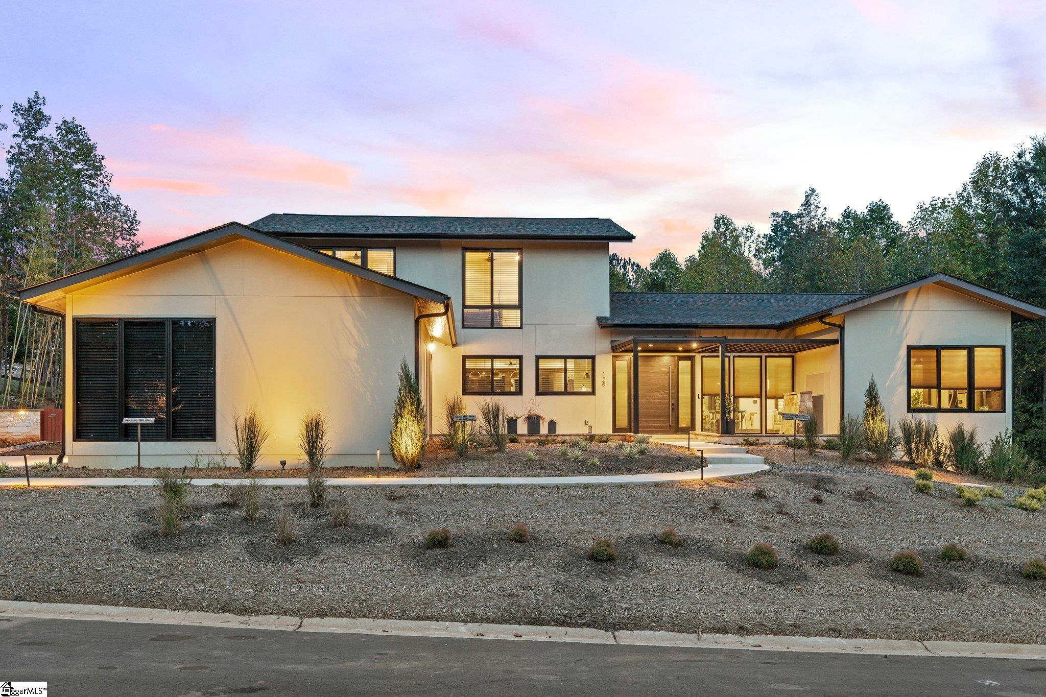 Welcome to 128 Sanctuary Lane, an extraordinary custom-designed residence nestled within the exclusive Sanctuary of Greenville in Taylors, South Carolina. This architecturally crafted, one-of-a-kind modern home, completed in 2023, blends refined, understated luxury indoors with natural serenity outdoors, across 4,088 square feet of thoughtfully designed living space. The main residence features four bedrooms and four and a half bathrooms, including an owner’s suite. Complemented by a beautifully finished one-bedroom, one-bath detached guest house—perfect for hosting guests, creating a private retreat, or offering as an Airbnb-ready income opportunity. Positioned on a Japanese-inspired landscaped and forested 1.08-acre lot, the home is surrounded by mature trees. A natural walking path winds through the wooded portion of the property, leading to a natural stream tucked away for quiet reflection. The landscape includes a meditative walking path and labyrinth, creating a serene environment ideal for Relaxation. At the heart of the residence lies a stunning central courtyard with an outdoor fireplace and patio, surrounded by full-height glass doors connecting the indoors and outdoors. Multiple gathering spaces, both inside and outside, provide the perfect setting for intimate get-togethers or larger events of up to 50 guests. The collaborative kitchen and outdoor dining area open beautifully through the patio doors, offering a natural flow for entertaining and culinary experiences. The entrance opens to a stunning view of the courtyard and guest house. The open-concept floor plan is bathed in natural light from expansive picture windows that capture the home’s east-west orientation and full southern exposure. The gourmet kitchen is a showpiece, featuring a massive central island, wall to wall counterspace with granite countertops, walk-in pantry, and top-of-the-line stainless steel appliances by Bosch and Electrolux. Elegant fixtures throughout the home include premium selections from Toto, Grohe, and Legrand, ensuring every detail feels elevated and intentional. The patio off the kitchen can easily be screened to create an inviting extension of the kitchen’s sitting area—ideal for relaxed mornings or evening gatherings. The primary suite is on the main level, serves as a luxurious sanctuary with a walk-in custom closet and a spa-inspired bath, offering expansive three-sided views of the outdoors. The large dining and living room area opens on one side into a functionally designed corner home office or study and library with all built-ins. It opens on the other side into a truly unique Japanese tea room—a custom-designed, intimate space that evokes peace, tradition, and elegance. This beautiful space lined with wood panel shoji screens is bathed in sunlight can also be converted to extend the main living area or reimagined for multiple uses such as an artist studio, yoga or meditation room, additional family room, or creative workspace. Just steps away, a Japanese-style healing and meditation suite awaits, complete with a steam room, sauna, shower, and private bath—designed to restore and rejuvenate both body and mind. The detached guest house mirrors the craftsmanship and finish of the main home and includes its own private bedroom, bathroom, and entrance. It is fully furnished and thoughtfully designed, ready for guests or use as a short-term rental or AirBnb. Every inch of this residence has been curated with attention to detail—from custom closets, built-in shelving, wall art niches, and abundant storage solutions. Flooring throughout the home includes warm bamboo wood, wool berber carpet, and natural slate, supplemented by natural fiber window treatments, adding texture and timeless character. Professionally landscaped with a Japanese rock garden, meditative labyrinth, and soothing water features in both the front and back yards, the setting feels grounded and inspirational. Solar and electric landscape lighting enhance