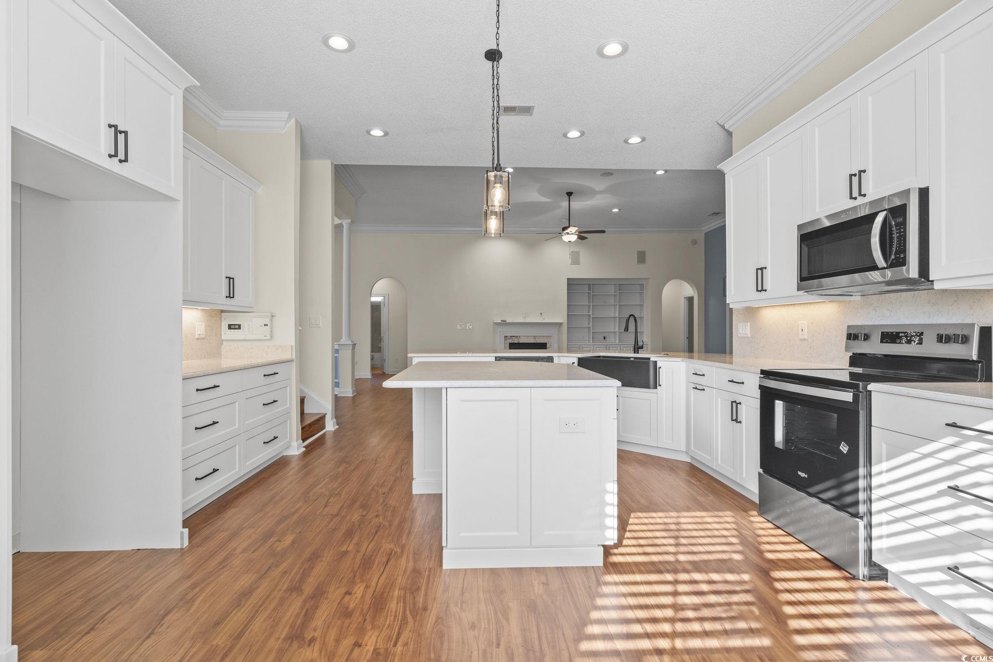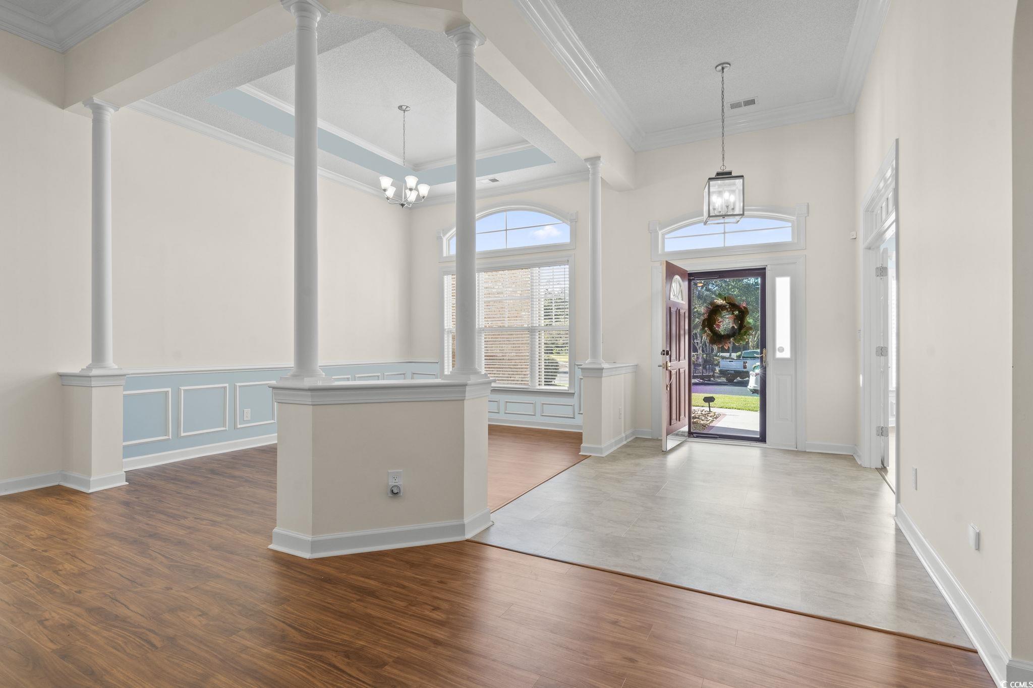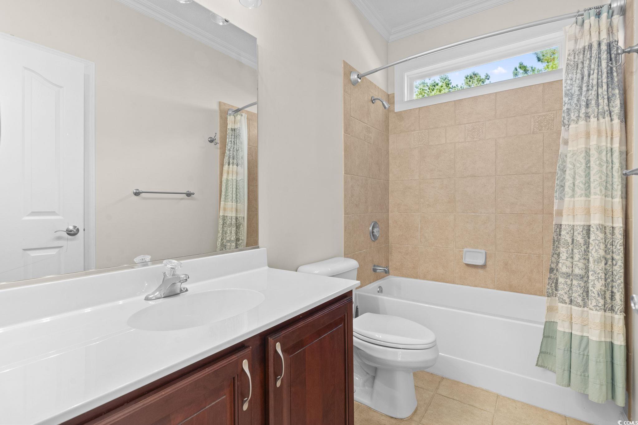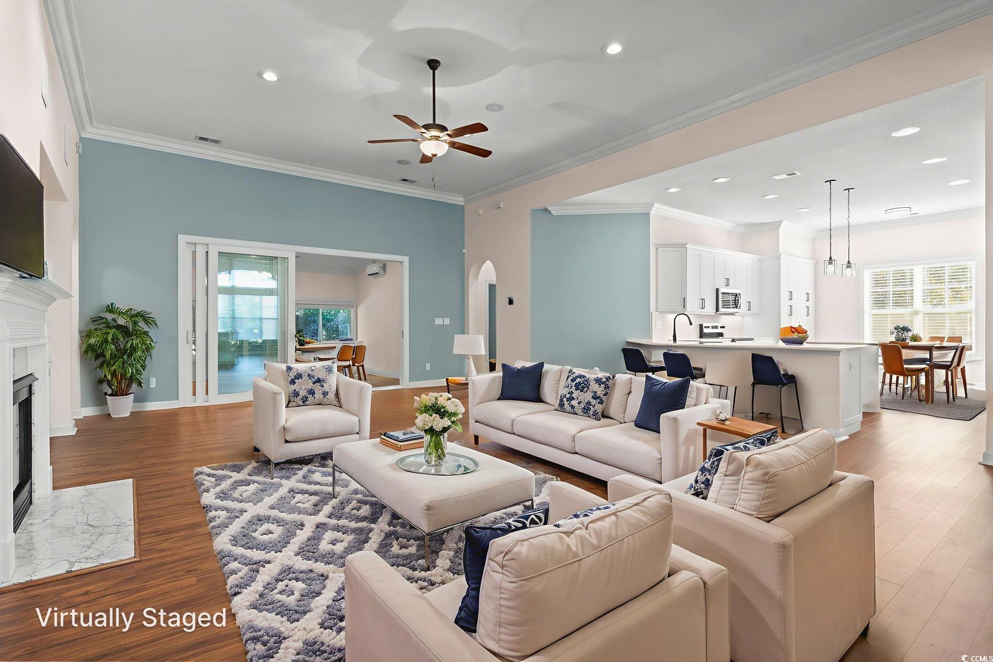 Welcome to LinksBrook and this beautifully renovated home. This top-selling Nantucket floorplan, once a model home, sits on a half-acre lot adjacent to wetlands and a preserve. If you need extra room, this home has it: two primary suites, an additional bedroom, a convertible den, a spacious bonus room with closet which can be used as a bedroom, two living areas, formal dining, and a renovated eat-in kitchen. The kitchen highlights quartz countertops, custom made cabinetry, a huge island, with stainless microwave, range, and dishwasher. A quartz-topped area bordering the kitchen offers extra seating. Beautiful Coretec wide plank laminate flooring flows throughout the entire home. The owner's suite boasts two walk-in closets and en-suite bath with two separate vanities, jet tub, tiled shower, and floors. and addition tiled ½ bath is in the hall. The second suite features en-suite tiled bath, tiled tub with shower and a walk-in closet. An additional bedroom, completely tiled hall bath, two linen closets and den complete this wing. The formal dining room, huge living room with gas fireplace flows into the Carolina room, complete with mini-split heating and air system, giving an additional living area. There is also a central vacuuming system throughout the house. Custom crown molding flanks every room. The main HVAC was replaced 3 years ago. An 80-gallon hot water heater was replaced last year. The oversized two car attached garage has a sink for easy clean up. A beautiful, stamped driveway fits an additional four cars. All custom-made hurricane shutters come with this home. A 12 x 35 concrete patio with gas hook-up flanks the back of the home. The in-ground propane tank was replaced two years ago. Beautiful Tennessee river rock landscaping with Curbscape borders are in the bedded areas. The home also contains a 10 zone Irrigation system, which has a separate water meter. The HOA fee includes access to the community pool, tennis and pickle ball courts and a recreation center with a gym. It is just short drive from the beautiful ocean beaches of the area. Plus, it is centrally located to take advantage of the many options for golfing, dining, entertainment, and shopping nearby in Myrtle Beach and surrounding communities.