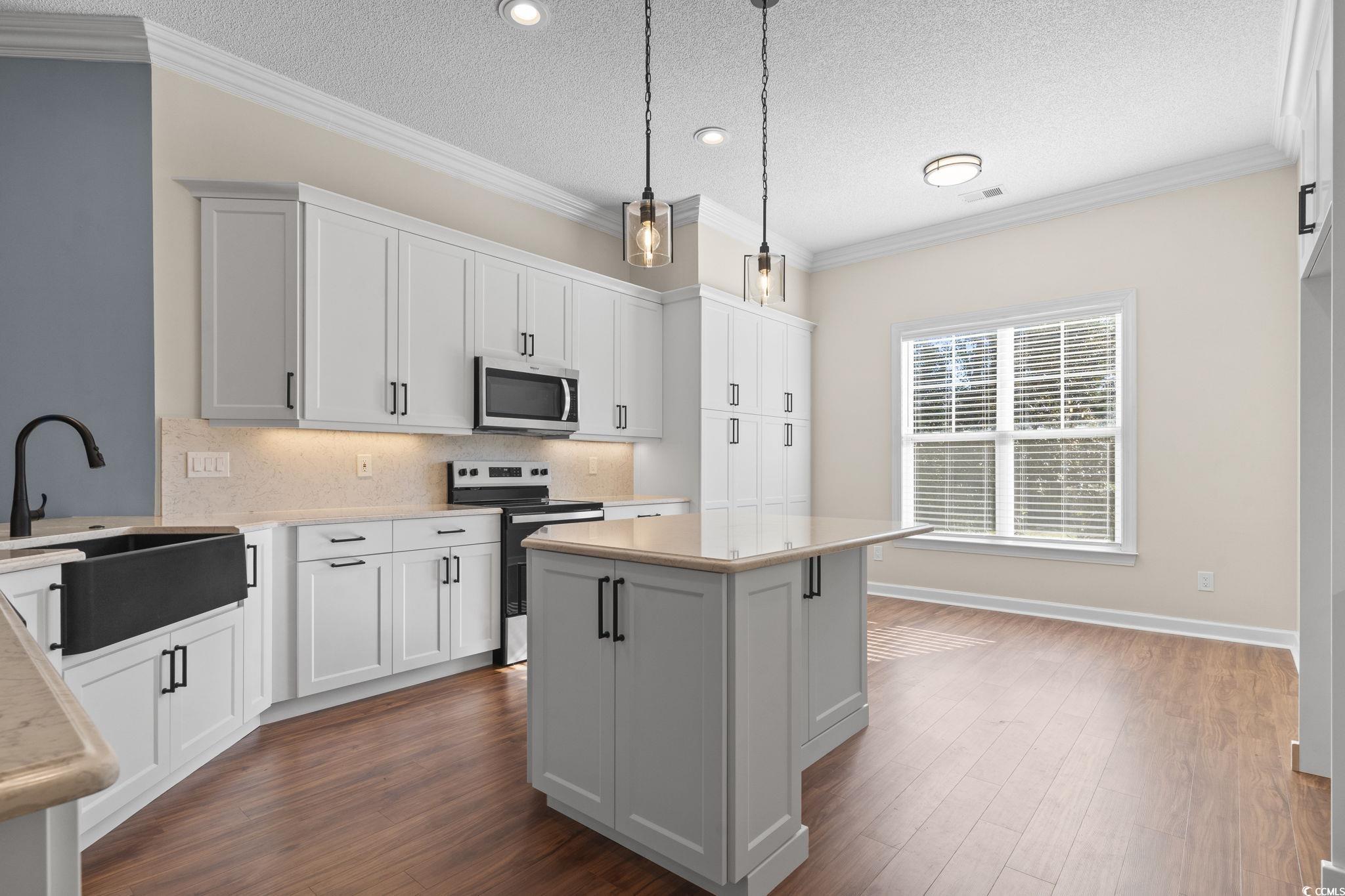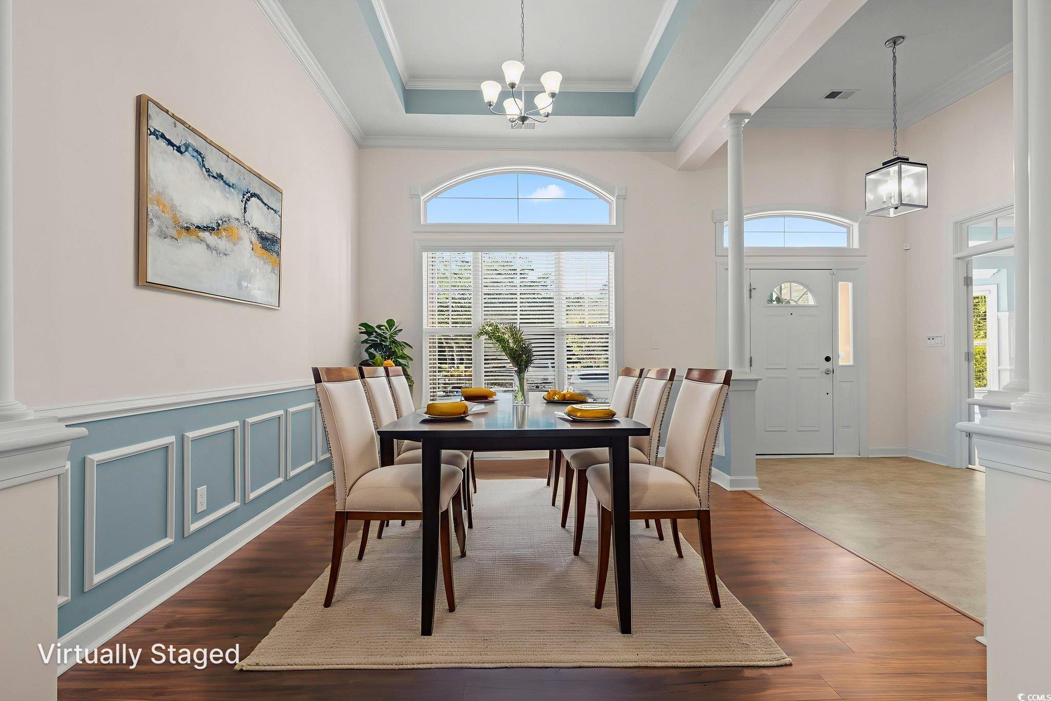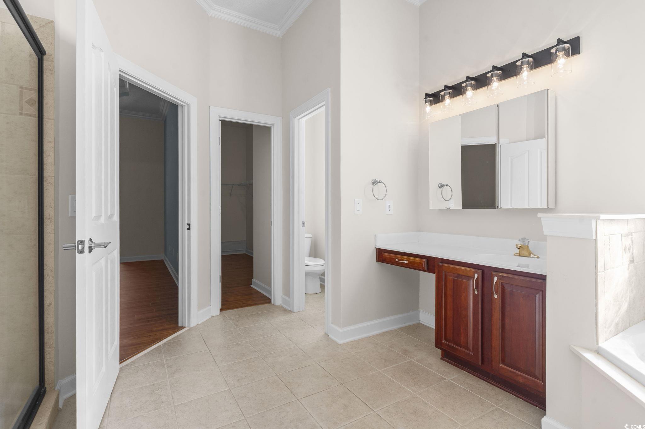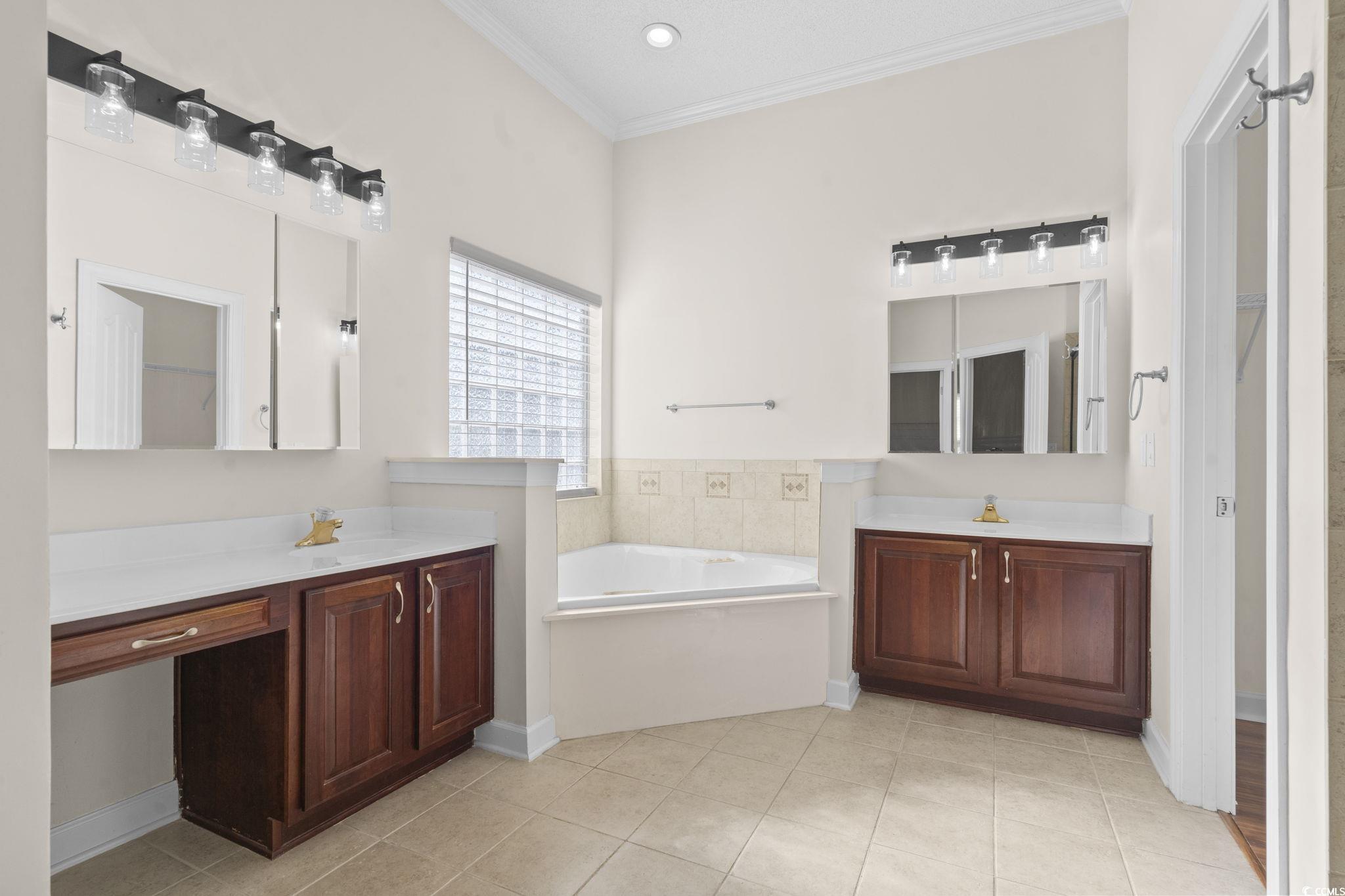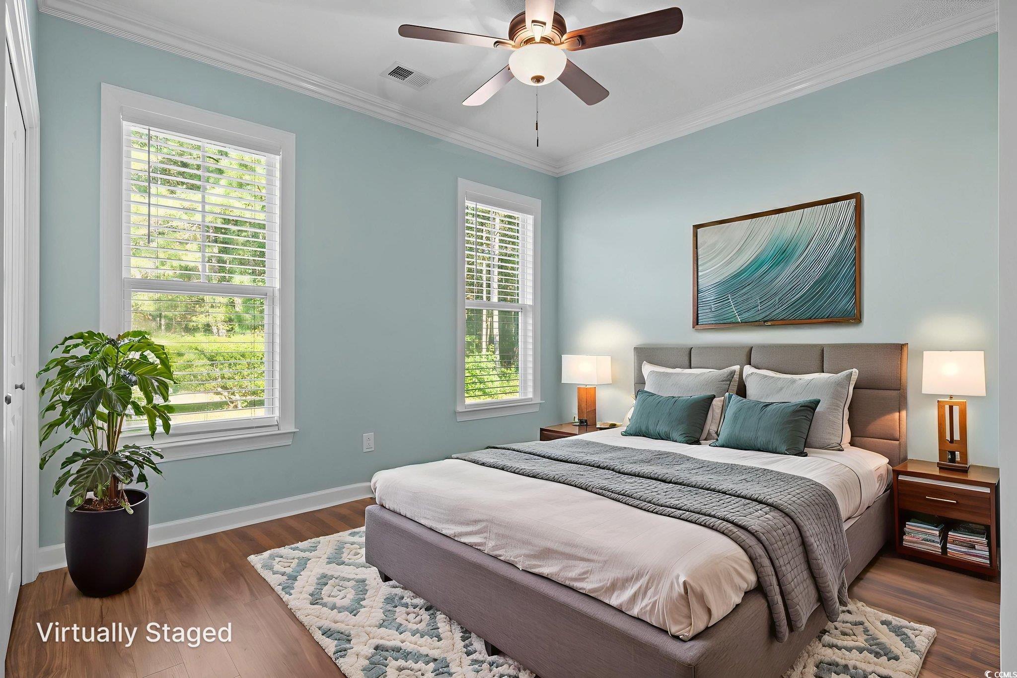 Welcome to LinksBrook and this beautifully renovated home. This top-selling Nantucket floorplan, once a model home, sits on a half-acre lot adjacent to wetlands and a preserve. If you need extra room, this home has it: two primary suites, an additional bedroom, a convertible den, a spacious bonus room with closet which can be used as a bedroom, two living areas, formal dining, and a renovated eat-in kitchen. The kitchen highlights quartz countertops, custom made cabinetry, a huge island, with stainless microwave, range, and dishwasher. A quartz-topped area bordering the kitchen offers extra seating. Beautiful Coretec wide plank laminate flooring flows throughout the entire home. The owner's suite boasts two walk-in closets and en-suite bath with two separate vanities, jet tub, tiled shower, and floors. and addition tiled ½ bath is in the hall. The second suite features en-suite tiled bath, tiled tub with shower and a walk-in closet. An additional bedroom, completely tiled hall bath, two linen closets and den complete this wing. The formal dining room, huge living room with gas fireplace flows into the Carolina room, complete with mini-split heating and air system, giving an additional living area. There is also a central vacuuming system throughout the house. Custom crown molding flanks every room. The main HVAC was replaced 3 years ago. An 80-gallon hot water heater was replaced last year. The oversized two car attached garage has a sink for easy clean up. A beautiful, stamped driveway fits an additional four cars. All custom-made hurricane shutters come with this home. A 12 x 35 concrete patio with gas hook-up flanks the back of the home. The in-ground propane tank was replaced two years ago. Beautiful Tennessee river rock landscaping with Curbscape borders are in the bedded areas. The home also contains a 10 zone Irrigation system, which has a separate water meter. The HOA fee includes access to the community pool, tennis and pickle ball courts and a recreation center with a gym. It is just short drive from the beautiful ocean beaches of the area. Plus, it is centrally located to take advantage of the many options for golfing, dining, entertainment, and shopping nearby in Myrtle Beach and surrounding communities.