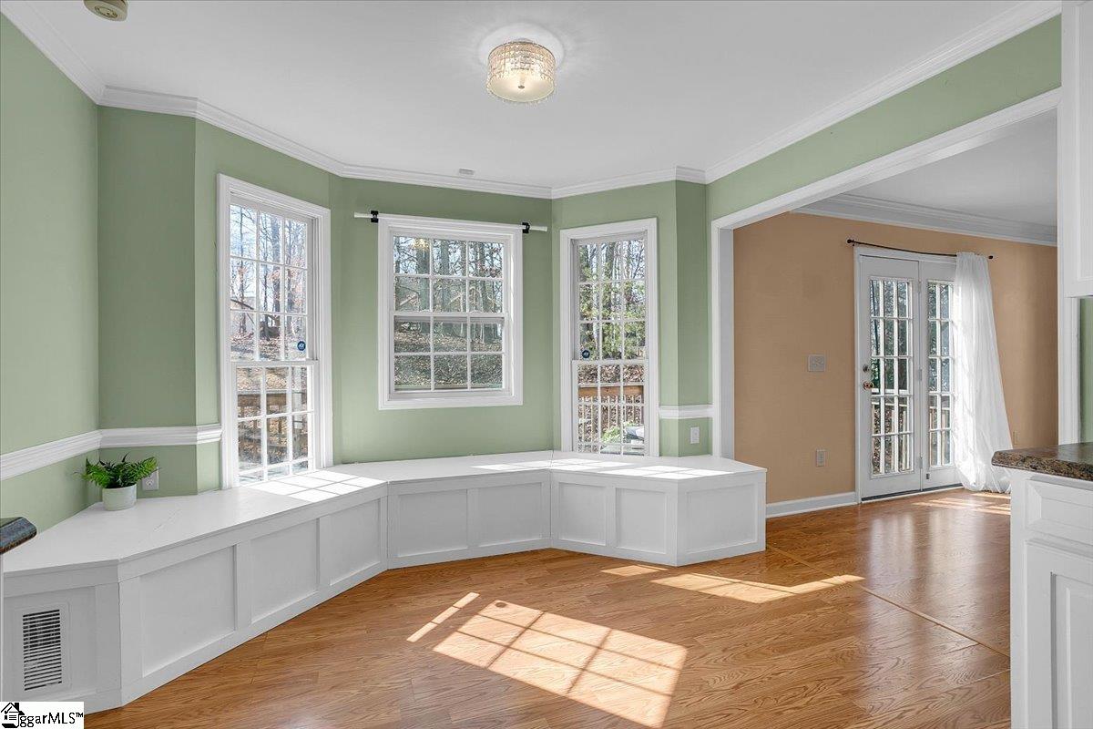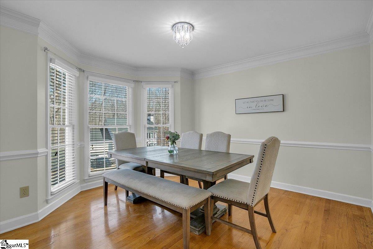 Located in the well-established Martins Grove neighborhood, this traditional two-story home offers space, character, and an unbeatable location close to a wide variety of shopping and dining with easy access to I-385. A charming front porch welcomes you into a two-story foyer that opens to a comfortable living room featuring a wood-burning fireplace and built-in cabinetry perfect for a beverage server when entertaining. The layout flows seamlessly into the spacious kitchen, thoughtfully designed with white cabinetry, a beautiful wood range hood, stainless steel appliances, tiled backsplash, pantry, and ample counter and cabinet space. A sunlit breakfast nook with a bay window highlights the custom built-in bench seating with hidden storage, adding both charm and everyday functionality. A large laundry room just off the kitchen includes a pocket door and functions as a convenient drop zone from the roomy two-car garage. The laundry/drop-zone leads to a full bathroom for added guest convenience. The elegant, front dining room with bay window completes the main floor. Upstairs, you will find three bedrooms and two full baths, including a spacious primary suite with walk-in closet, dual vanity, jet tub, and separate shower, plus a flex room or study just off the suite. Outdoor living is easy with a large deck overlooking a private backyard—ideal for barbecues and gatherings. With classic details like crown molding, chair railing, thoughtful design elements, and almost no carpet throughout, this traditional home delivers character, space to grow, and outstanding value—do not miss the opportunity to make it yours.