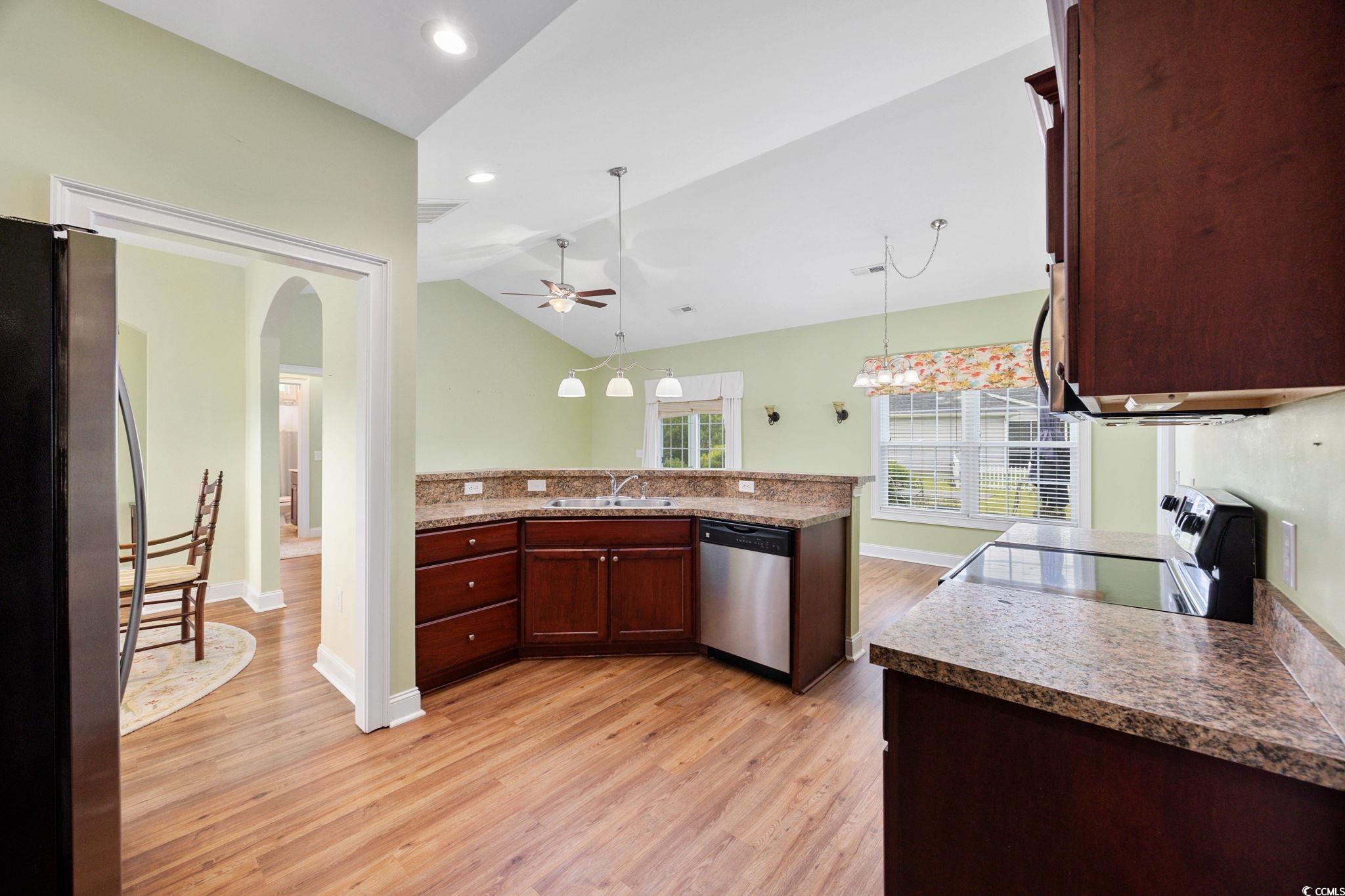 Wake up every day to peaceful lakefront living and enjoy the simple pleasure of catch-and-release fishing right in your own backyard. Located in the charming Sedgefield community, 1304 Marley Street offers stunning water views, plenty of room for entertaining, and a lifestyle centered around comfort and connection with nature. This beautifully maintained 3-bedroom, 2-bathroom home is thoughtfully designed with an open, airy layout that makes gatherings effortless. The spacious living area features luxury vinyl plank flooring, vaulted ceilings, and an abundance of natural light—all while offering tranquil lake views from the main living spaces and the primary bedroom. Soft carpeting in the bedrooms adds warmth and comfort. The kitchen is equipped with stainless steel appliances and opens to a formal dining area, perfect for hosting friends or enjoying family dinners. Just off the main living space, step out to a screened-in back porch with electric and a ceiling fan—an ideal setting to relax while taking in the lake view. The porch opens to a patio and private backyard, creating even more space for outdoor entertaining or peaceful moments by the water. The lakefront primary suite is your personal retreat, featuring vaulted ceilings, a large walk-in closet, and an ensuite bathroom complete with a garden tub, separate shower, and dual vanity. Two additional bedrooms offer flexible living options, whether for guests, a home office, or hobbies. The dedicated laundry room includes a washer and dryer, and the oversized two-car garage provides extra storage and convenience. With its serene setting, beautiful design, and easy access to both historic downtown Conway and the beach, this move-in-ready home is perfect for those seeking space, style, and the joys of lakefront living.