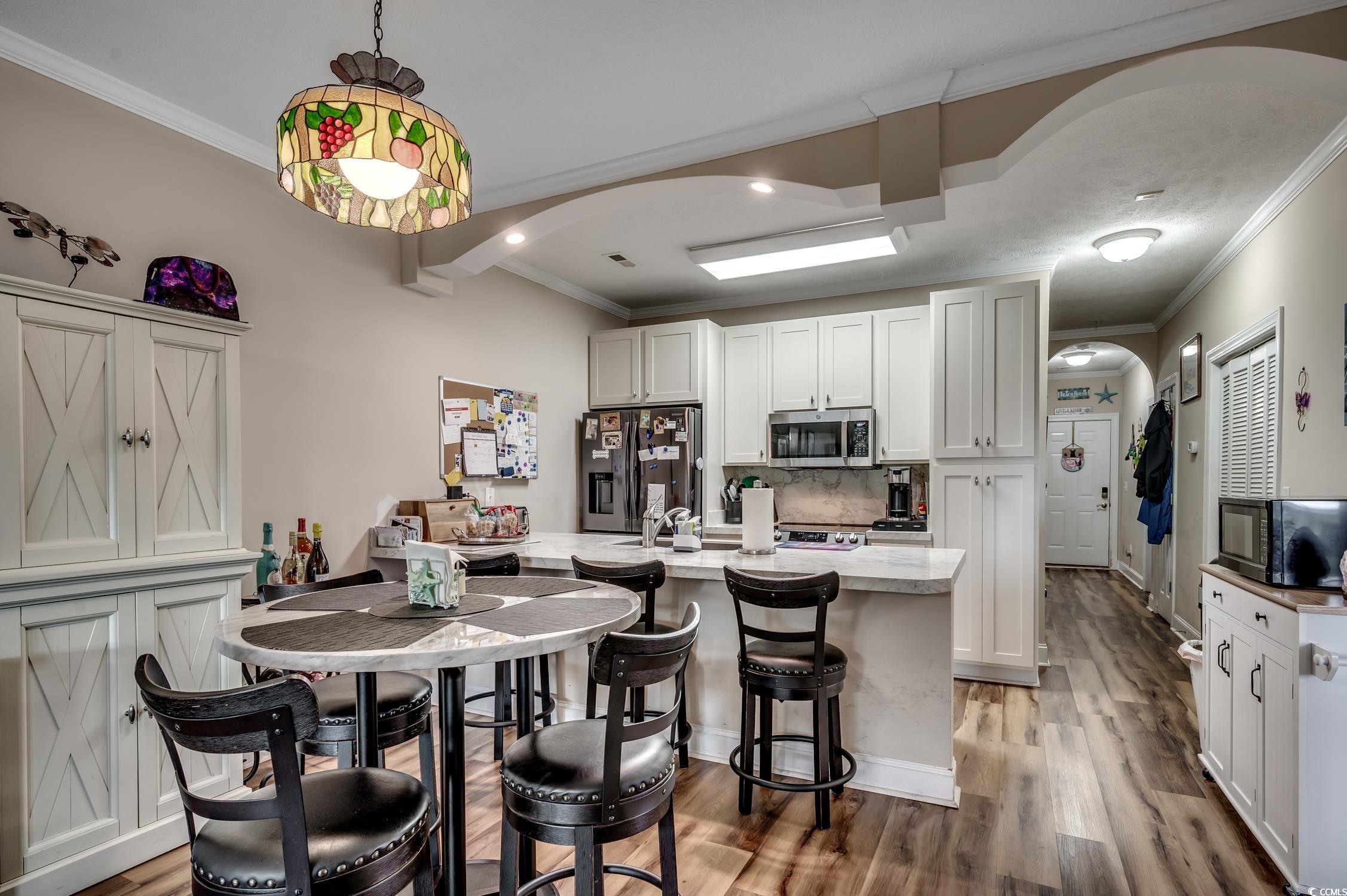 Welcome to the Waterway Community at Carolina Yacht Landing! This beautifully maintained 3 bedroom, 2 bath condo is located on the 3rd floor of and elevator building , offering both comfort and convenience. Step inside to find luxury vinyl plank flooring throughout, crown molding and high ceilings that create a spacious, inviting feel. The living room features new hurricane-rated bay windows overlooking a peaceful pond, filling the space with natural light, motorized shades for your comfort and ease. The kitchen has been tastefully updated with quartz countertops, refinished cabinetry and stainless steel appliances, seamlessly connecting to the open dining and living areas with access to the private balcony. The primary suite offers dual closets, balcony access and a private en suite bath. Two generously sized guest bedrooms provide plenty of space and storage for family or visitors. This home as only been used as a primary residence, never rented and is in excellent condition. Enjoy the convenience of being just steps from the pool. Carolina Yacht Landing is a gated waterfront community with resort style amenities, including two pools, a hot tub, fitness center, clubhouse, covered seating overlooking water, boat parking with day docks and annual slip rentals, plus RV and boat storage for an additional fee. All of this , just a short golf cart ride to the beach, shopping, dining and entertainment. Don't miss your chance to own this perfect full time home, beach retreat or investment property!