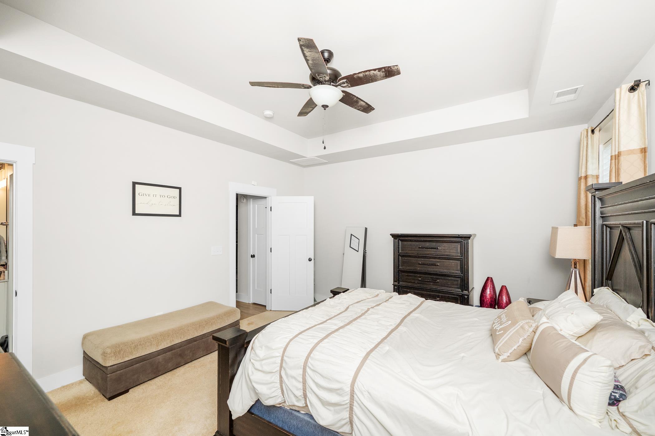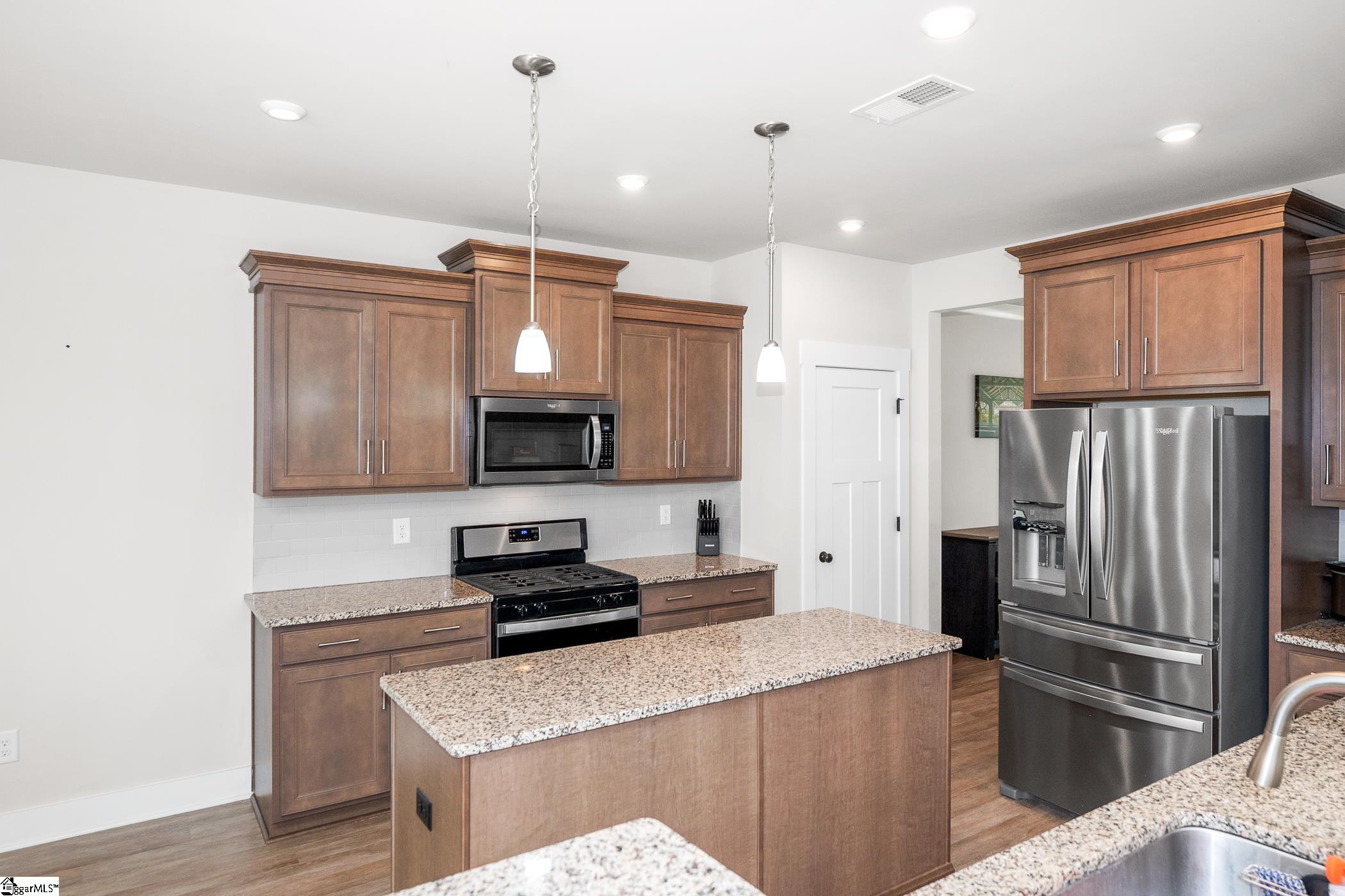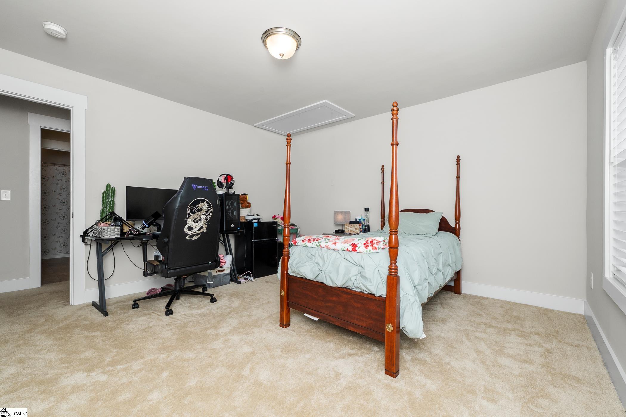 Looking for a newer home with breathing room and no HOA? This may be the one for you. This 2020 Craftsman Style home has 4 bedrooms, 3.5 baths, 2 car garage, fenced yard and large outbuilding. Enjoy the privacy of .68 acres yet convenient to Greenville/Spartanburg- minutes from BMW and I-85. The foyer entrance presents a quality feel that continues throughout the home with crown molding, vaulted/trey ceilings, luxury vinyl tile, 9 ft stone fireplace with raised hearth, surround sound system, upgraded kitchen cabinets with large island, spacious living area with oversized windows and a dining room that is perfect for family dinners or flex space The kitchen has beautiful dark cabinets with slide out trays, gas stove and open floor plan to living area. The master bedroom is a sanctuary with tray ceilings, private view windows, huge walk in closet and deluxe master bath with water closet, garden tub, dual sinks and shower. Upstairs is another massive bedroom that has a full bath with 3 closets - A walk in and 2 more that would be great for a small study area or play room. Additional 2 bedrooms upstairs share a dual access full bath that has 3 separate rooms for shower, sinks and toilet. Entire home has a lot of natural light and storage. A ton of additional storage is available in the 16x10 ft. outbuilding with loft shelving. Part of the acreage has white privacy fencing but there is a lot more room to explore behind this fence. A screened porch, large yard and patio make this a great entertainment home for outdoor activities. Well-maintained home that is only a few years old with over half an acre...don't miss this one!