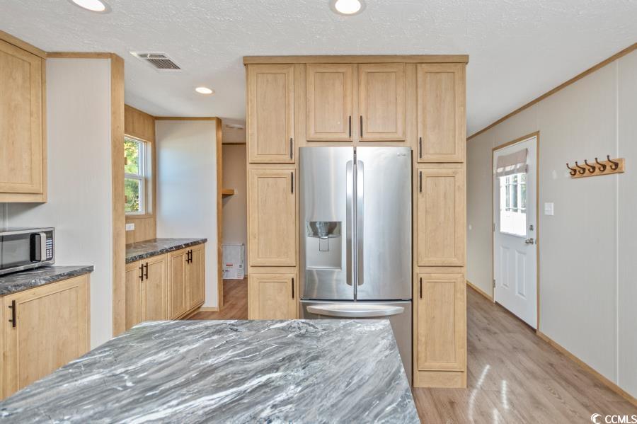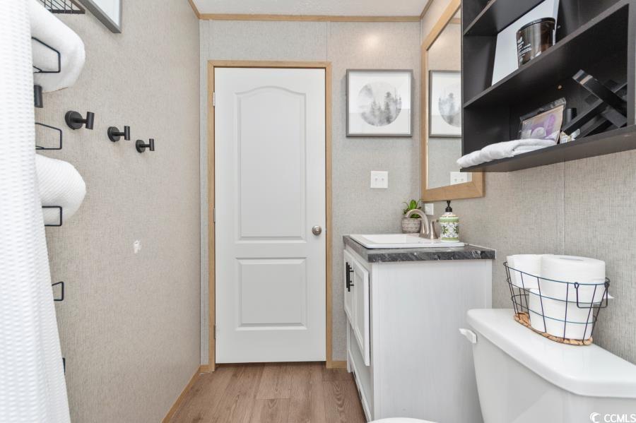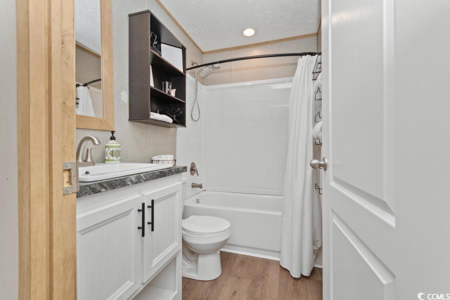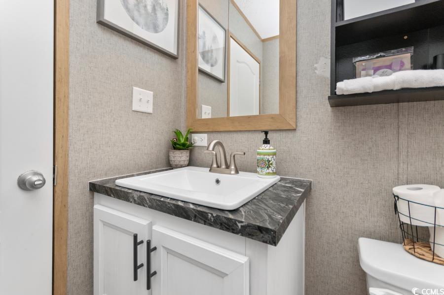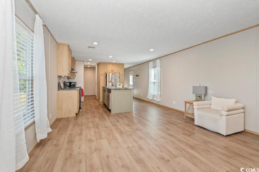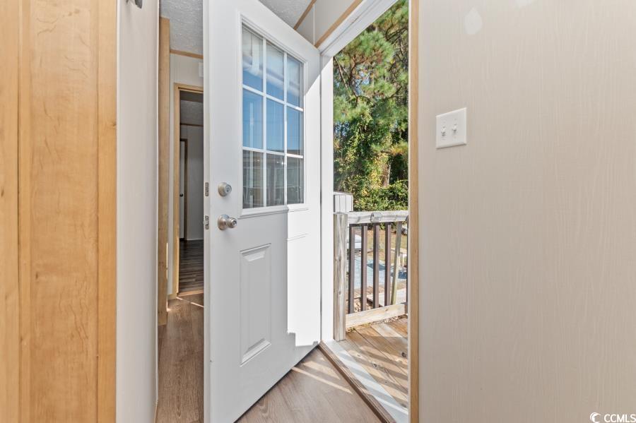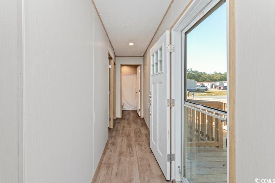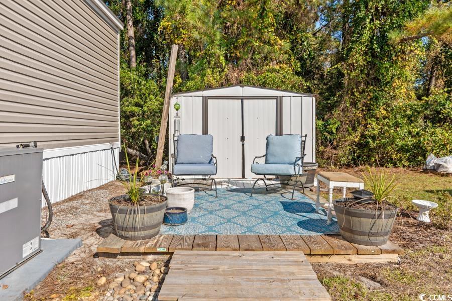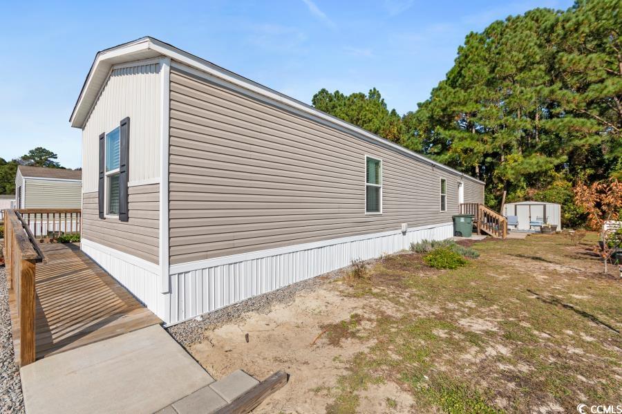 Come see this beautiful home! Like-new manufactured home built in 2021. Open floor plan with modern living! Kitchen is beautiful with a island, modern cabinets, coffee bar, and stainless steel appliances! The primary suite is spacious with a walk-in closet and dual vanities in the private bathroom. Many outdoor upgrades. Enter the home on a handicapped accessible walkway with a large beautiful deck. Enjoy evenings on the large deck on the back of the house! Partially fenced front yard. Community has a pool and is a great location with a short drive to Cherry Grove Beach!