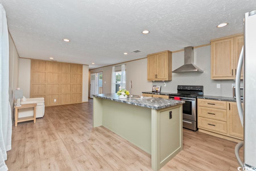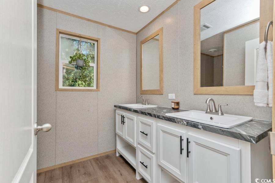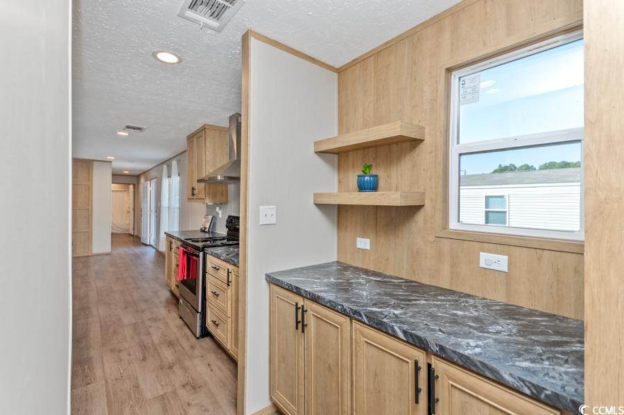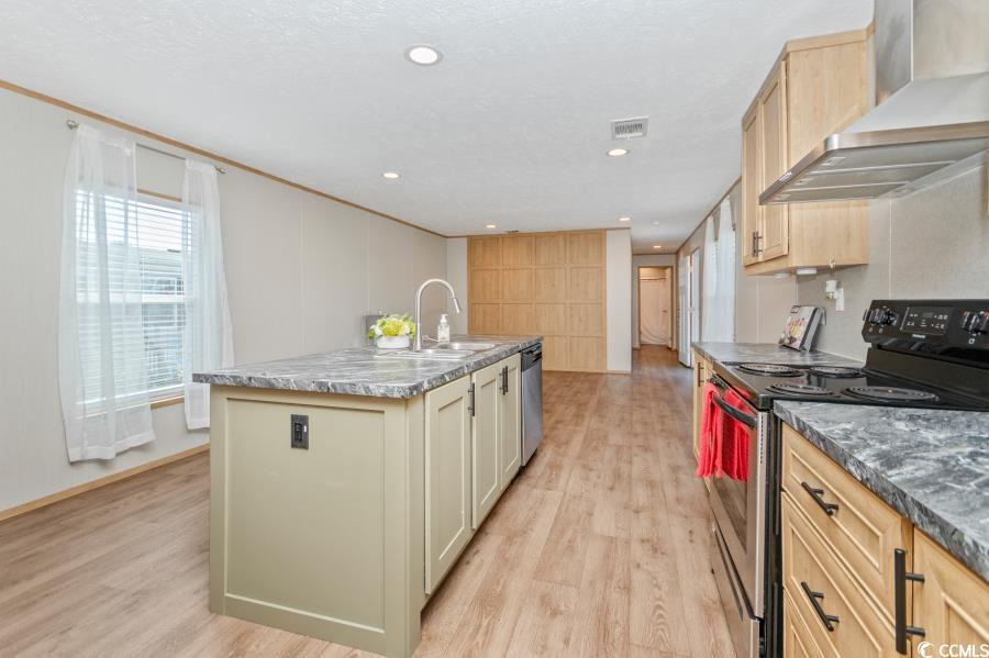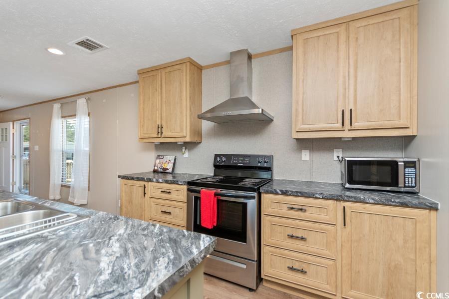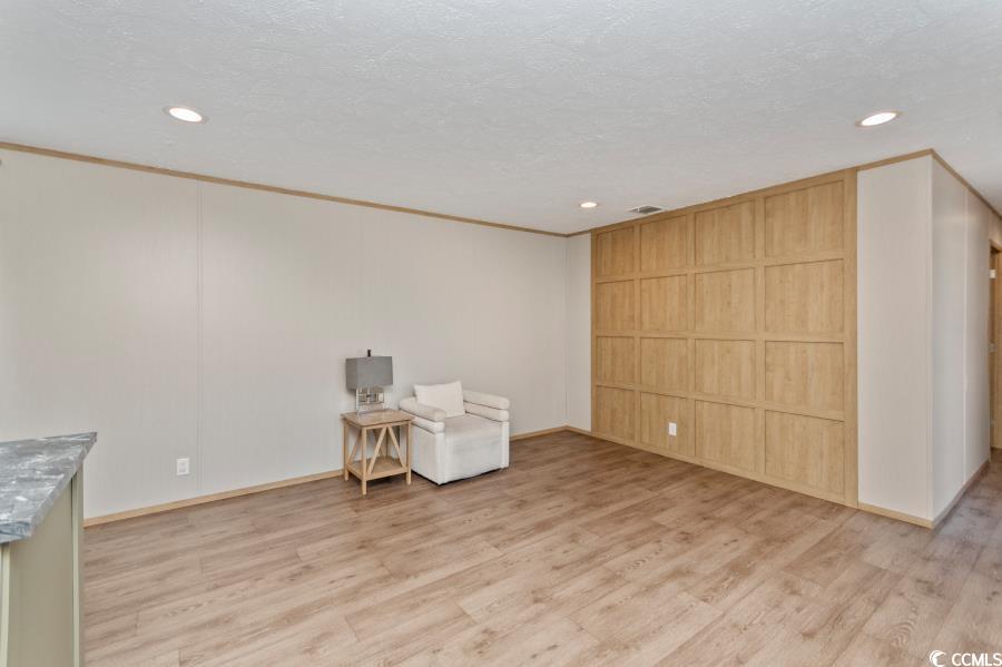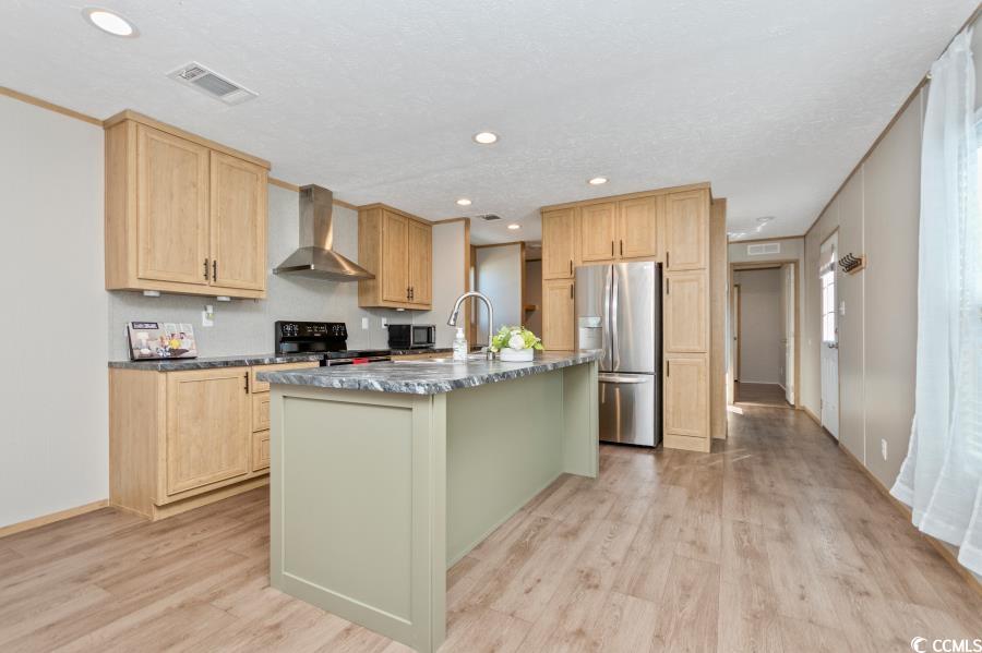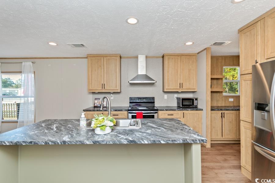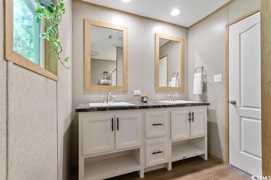 Come see this beautiful home! Like-new manufactured home built in 2021. Open floor plan with modern living! Kitchen is beautiful with a island, modern cabinets, coffee bar, and stainless steel appliances! The primary suite is spacious with a walk-in closet and dual vanities in the private bathroom. Many outdoor upgrades. Enter the home on a handicapped accessible walkway with a large beautiful deck. Enjoy evenings on the large deck on the back of the house! Partially fenced front yard. Community has a pool and is a great location with a short drive to Cherry Grove Beach!