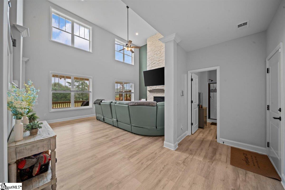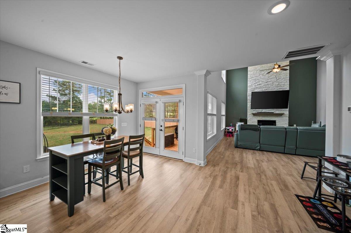 Nestled in the tranquil Alder Pond community of Campobello, South Carolina, this stunning 2024-built Craftsman-style residence spans approximately 3,800 square feet on a 0.81-acre lot, perfectly positioned to capture serene views of the community pond and distant Blue Ridge Mountain vistas. The exterior welcomes you with a charming covered front porch, durable Hardie Plank siding, and low-maintenance landscaping that enhances the home’s curb appeal. Step inside to an open-concept main level bathed in natural light through oversized windows. The spacious great room, anchored by a cozy gas fireplace, flows seamlessly into a state-of-the-art kitchen featuring a farm sink, sleek quartz countertops, stainless steel appliances, a large island, and a butler’s pantry for added convenience. Soft-close drawers throughout the home add a touch of luxury, while the kitchen window frames picturesque pond views, making every meal a scenic experience. The adjacent dining area is perfect for gatherings, large or small. The second-level primary suite is a private sanctuary, boasting multiple walk-in closets and a spa-like en-suite bathroom with dual vanities, a tiled walk-in shower, and elegant finishes. Four additional bedrooms, one on the main level and three upstairs, with access to well-appointed full baths, provide ample space for family, guests, or a home office. A versatile loft area upstairs serves as a flexible space for relaxation, play, or hobbies. Luxury vinyl plank flooring, ceramic tile, crown molding, and recessed lighting throughout reflect the home’s many upgrades, blending style with durability. Outside, the expansive backyard overlooks the serene Alder Pond, ideal for gardening, relaxation, or future additions like a play set. The attached three-car garage with epoxy floors includes a dedicated section perfect for a man cave, workshop, or extra storage, catering to hobbies and convenience alike. The Alder Pond community enhances daily life with its scenic pond for quiet strolls, a picnic shelter for neighborhood gatherings, and proximity to miles of trails near the Tryon International Equestrian Center. Minutes from Interstate 26, this home balances rural charm with easy access to Greenville’s vibrant dining and shopping or Asheville’s cultural attractions.