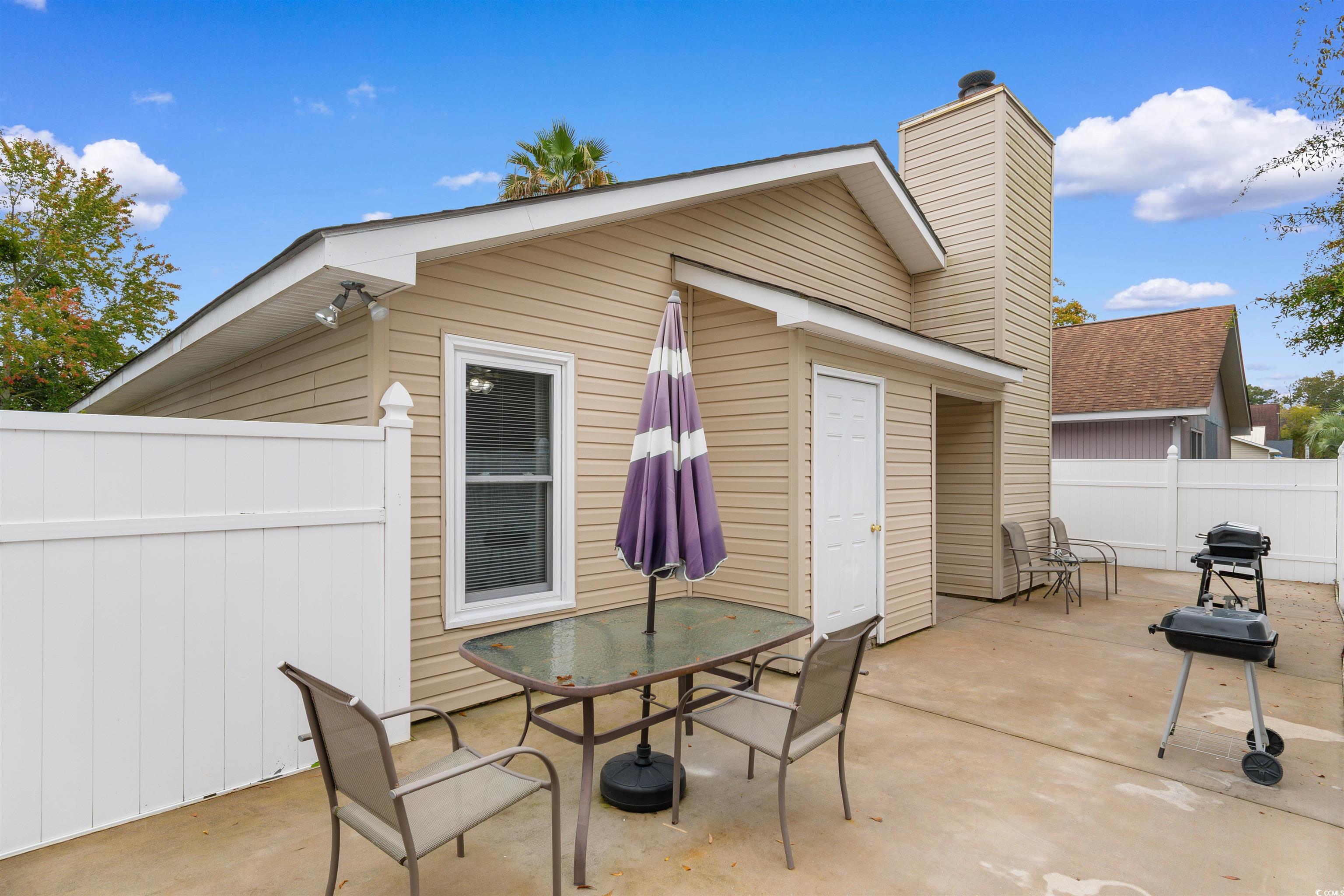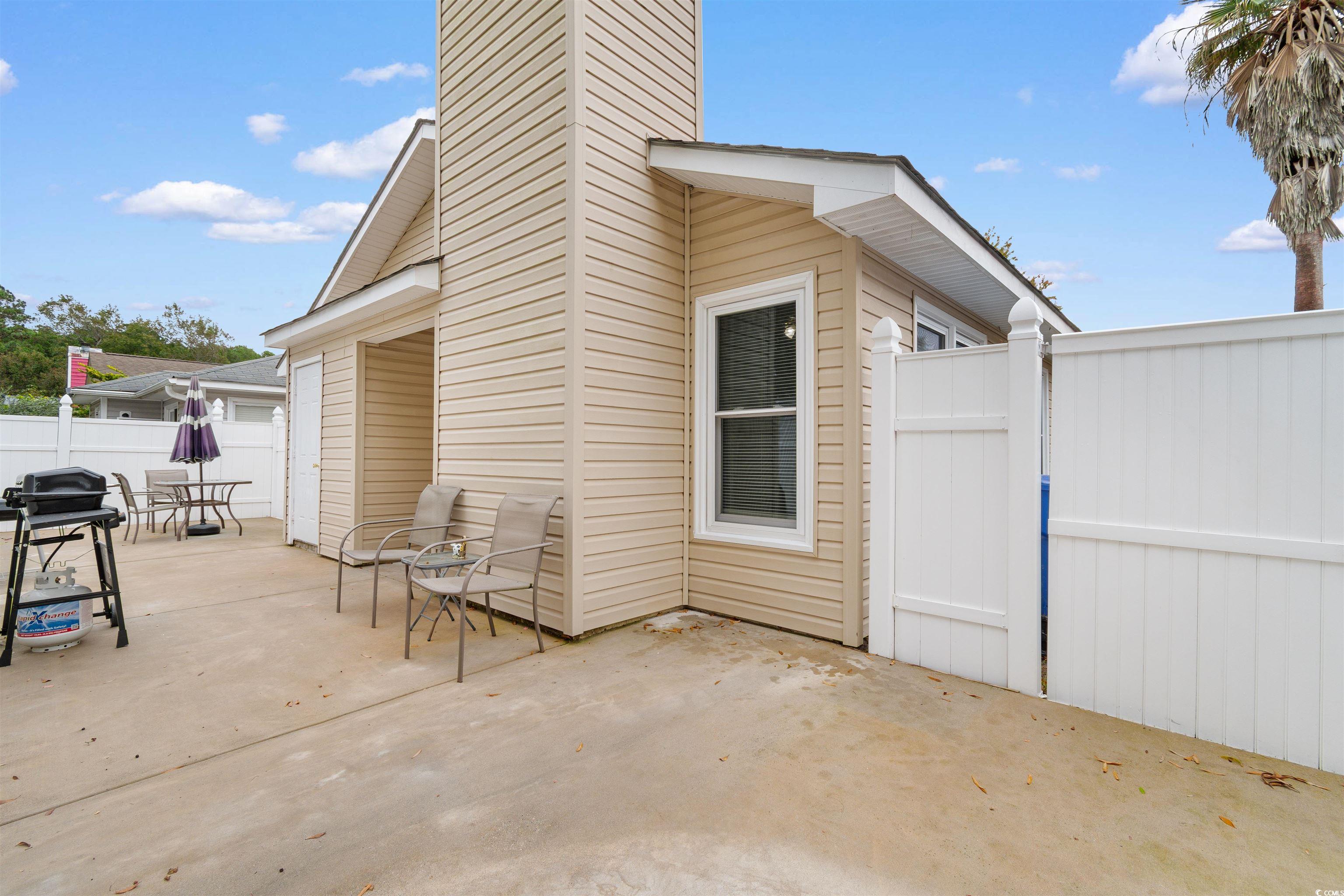 No HOA and just a mile from the beach! This charming 2-bedroom, 2-bath, one-level home combines convenience and low-maintenance living. Just a short golf cart or bike ride to the beach, with shopping, dining, and golf nearby. Inside, vinyl flooring runs throughout—no carpet—and the split-bedroom layout offers privacy. The primary bedroom features vaulted ceilings, a ceiling fan, a sunny bay window, and an ensuite or attached bath. The second bedroom is located at the back of the home next to the hall bathroom, ideal for guests or a home office. The living room boasts a brick fireplace and a back door that provides easy access to the fenced, low-maintenance concrete backyard—perfect for outdoor entertaining. The eat-in kitchen shines with stainless steel appliances, granite countertops, and a bright bay window. Washer and dryer convey for added convenience. Outside, relax on the rocking chair front porch or enjoy the backyard that backs up to a city-maintained playground. A storage room provides space for beach gear, tools, or gardening supplies. No HOA, move-in ready, and just a mile from the beach—schedule your showing today!