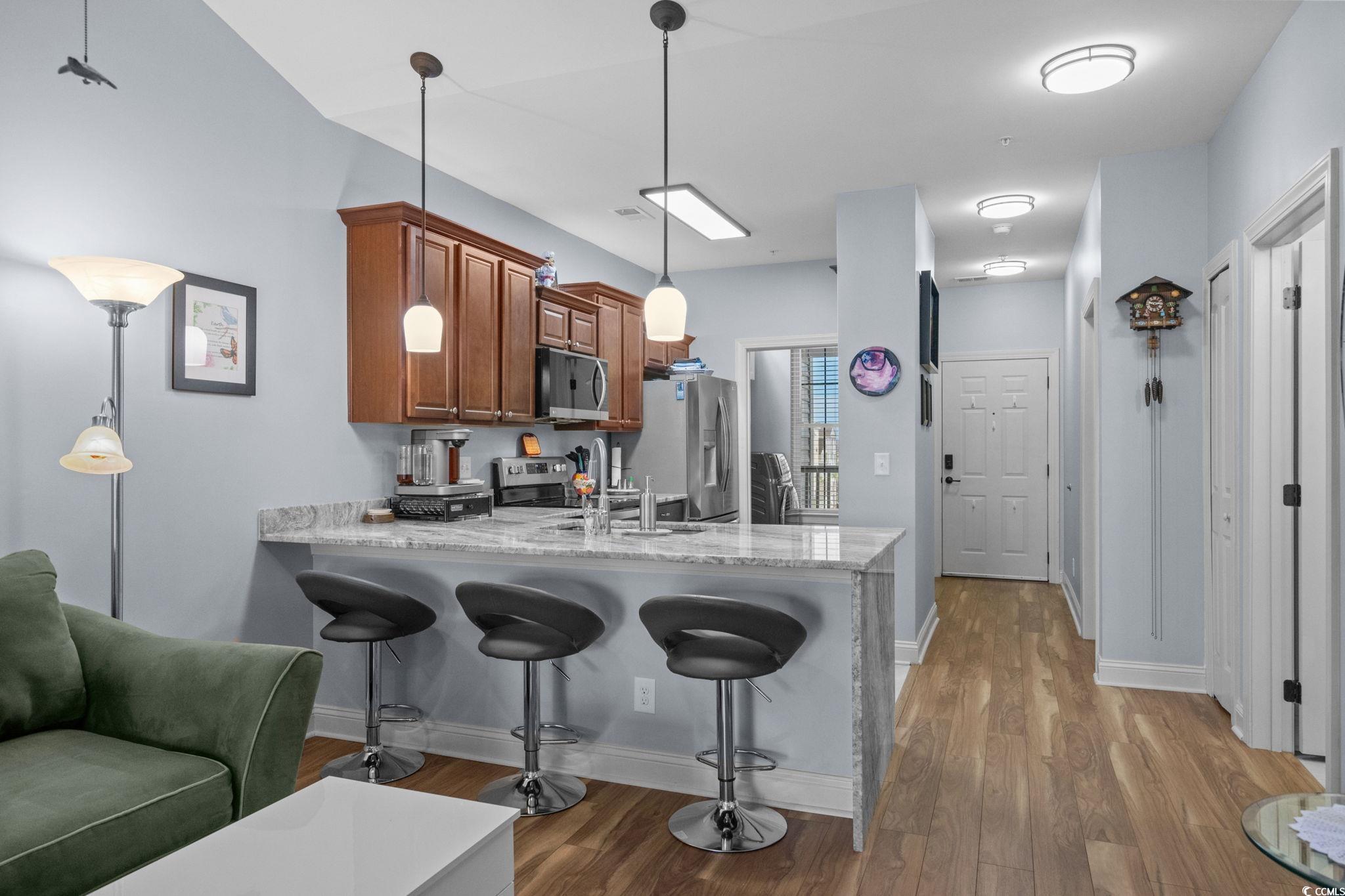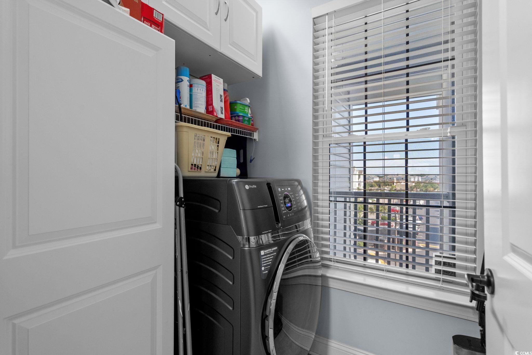 Welcome to The Village at Queens Harbour! This 4th-floor, 2bedroom-2bath condo isn’t just updated. It’s one of the community’s rare gems. Out of 11 buildings, only 5 units boast both vaulted ceilings and a double balcony and this condo is one of them. Inside, you’ll immediately feel the warmth and light that make this space so inviting. The open layout is complemented by cherry cabinets, durable quartzite countertops and a complete set of brand-new 2024 appliances, including refrigerator, range, microwave, dishwasher, and a washer/dryer combo which conveys. Both bathrooms have been refreshed with new toilets, medicine cabinets, and flooring. The laundry room has also been upgraded with added cabinets to maximize space. VCT new flooring runs throughout the entire unit enhancing the fresh and updated feel. Modern lighting, updated fans, tiled balcony floors, and remote-control shades complete the polished look. The unit is in immaculate condition, move-in ready. Additional perks include a private storage unit right across the hall and the convenience of an exterior elevator. The Village at Queens Harbour offers a pool, clubhouse, picnic areas, and community activities and one of the best parts is the location, located less than a mile from Market Common, close to shopping, dining, dog parks, and just a short drive to the beach. This rare property combines comfort, style, convenience and much more! Schedule your showing today!