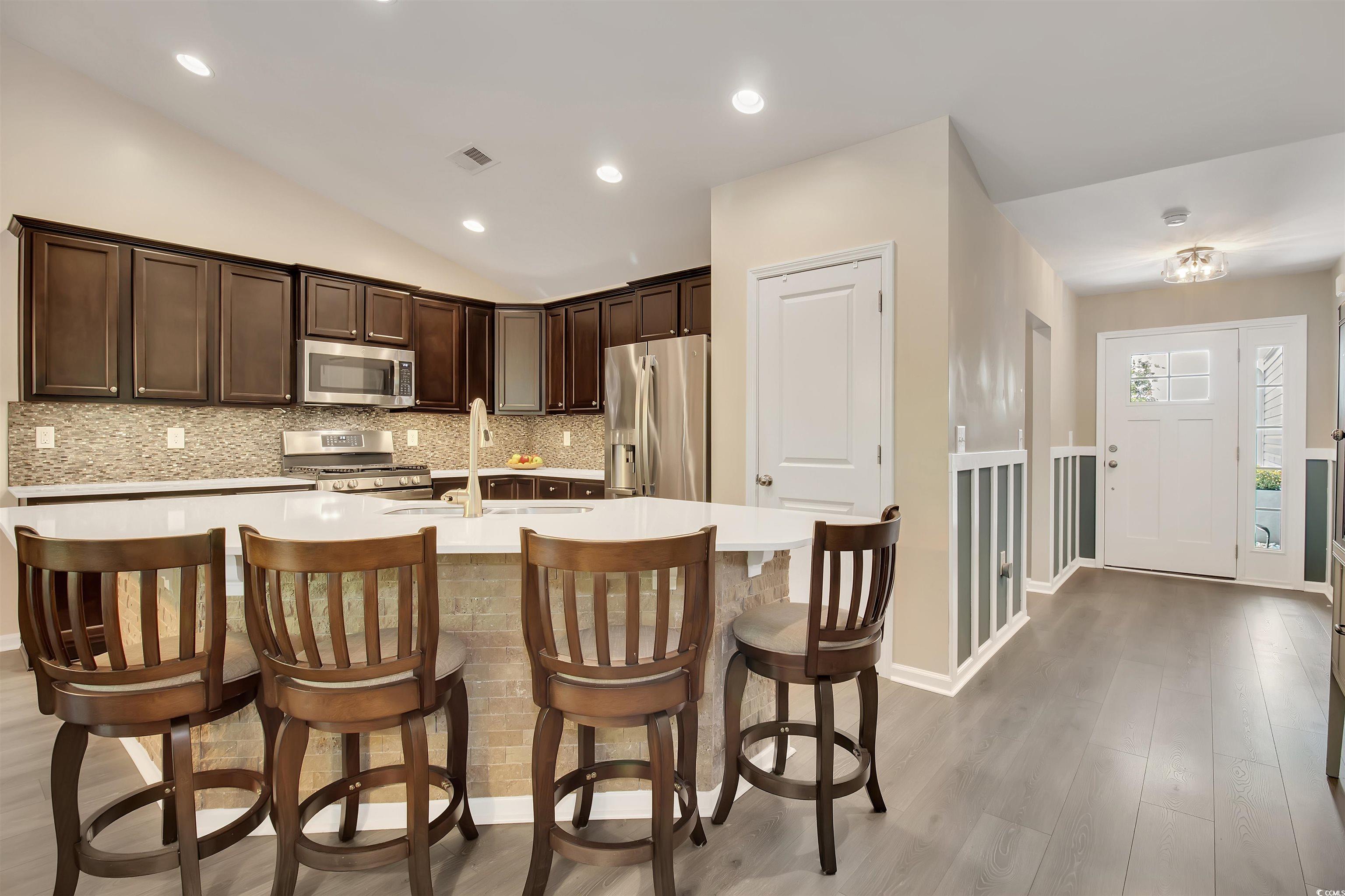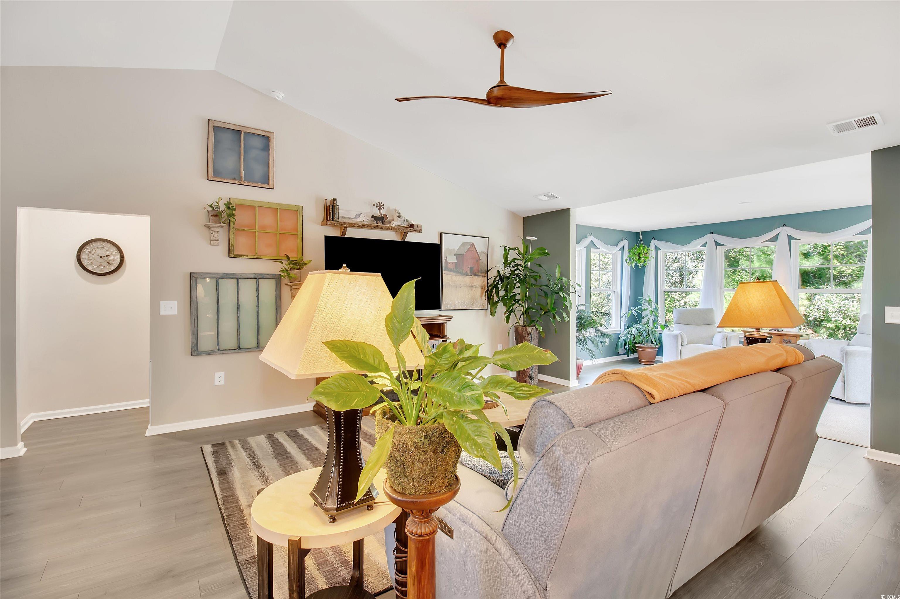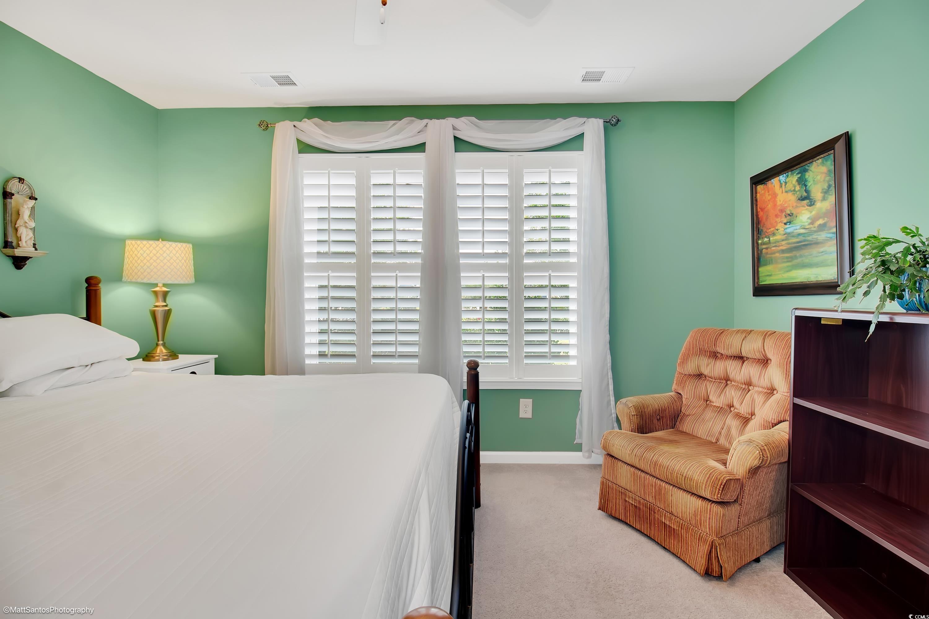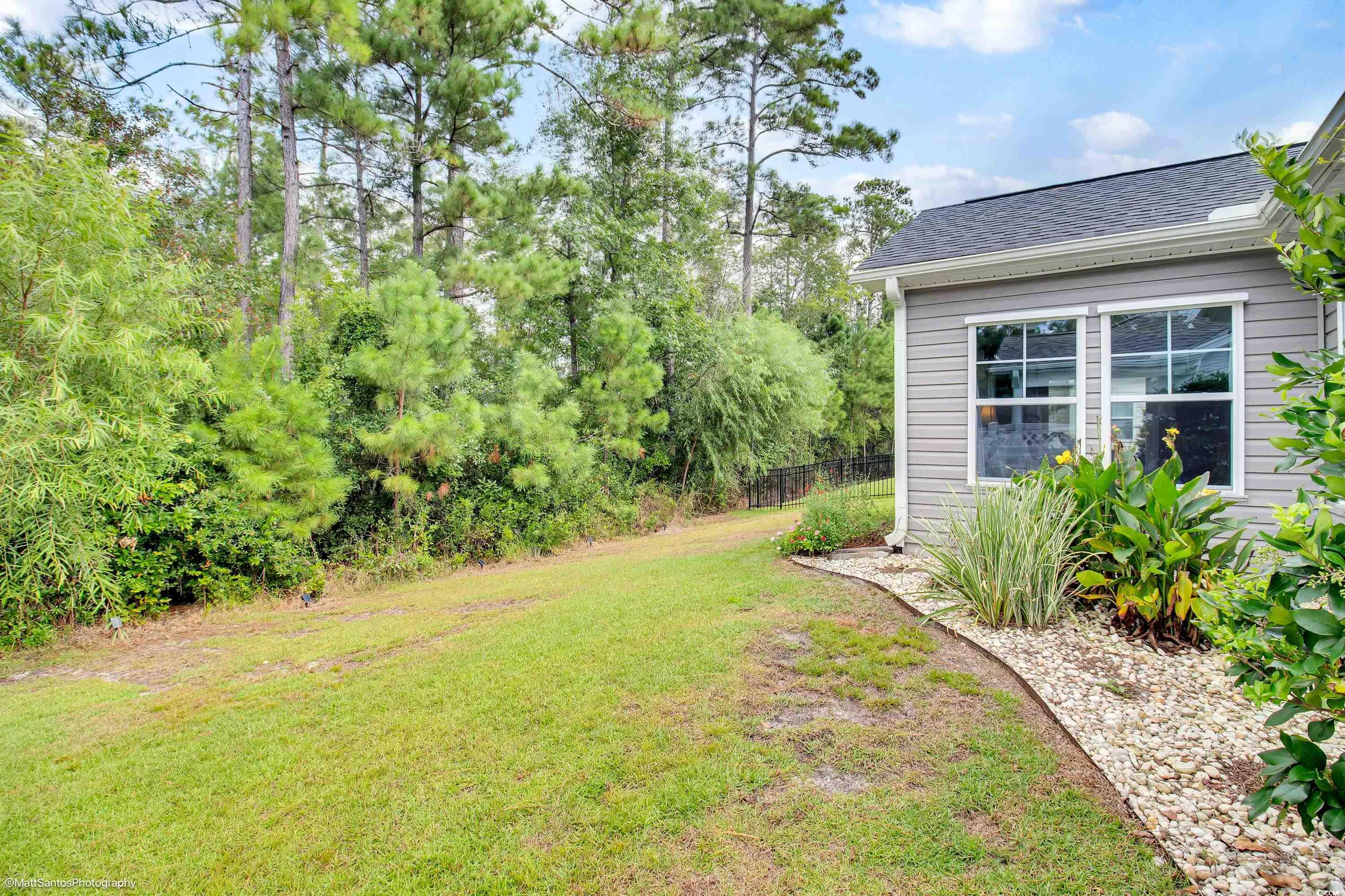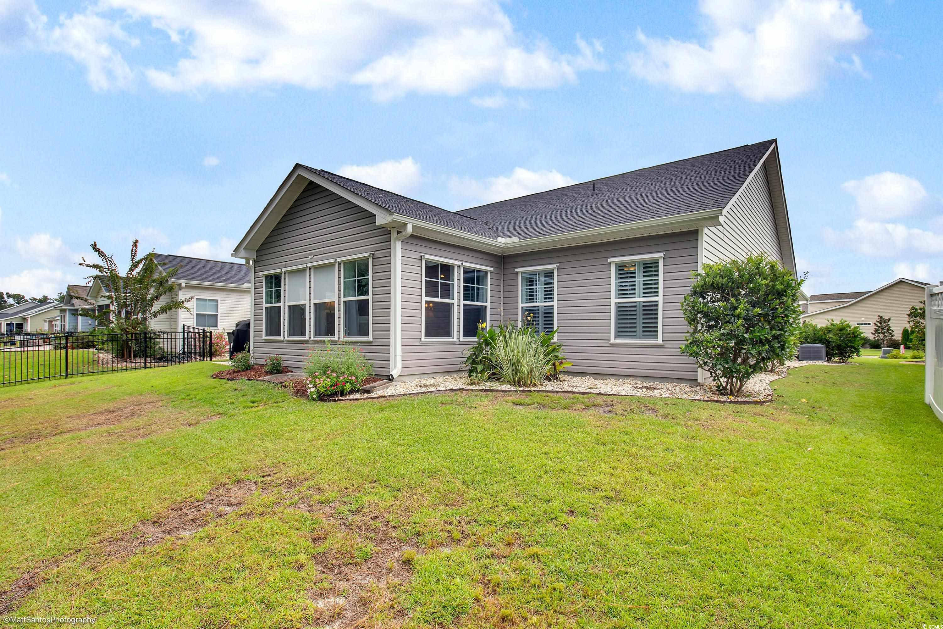Tucked near the end of a quiet cul-de-sac and backing up to peaceful woods, this home offers the ultimate in privacy and relaxation. From the moment you step inside, you’ll notice thoughtful touches everywhere—from the wainscoting in the foyer and living room to the bright, open layout designed for everyday comfort and easy entertaining. The kitchen is a true centerpiece, featuring Quartz countertops, rich 42” Espresso cabinets, a striking backsplash, and a gas stove for the cook who loves to create. Vaulted ceilings in the kitchen and dining area add an airy, spacious feel. Just off the living room, a cheerful sunroom invites you to start your mornings with natural light and end your evenings winding down in comfort. The split-bedroom floor plan provides privacy for guests, with one room currently customized as a home office using the closet space—easily converted back if desired. The primary suite is a retreat of its own, complete with a walk-in closet, linen closet, and a beautifully tiled shower with a built-in seat. Plantation shutters are in all of the bedrooms. Step outside to your patio, where you’ll find a gas hookup ready for a grill—perfect for weekend barbecues, morning coffee, or evening cocktails under the Carolina sky. Add in the low HOA fees, and you’ll see why this property is such a rare find. Come experience the Palm Lakes Plantation lifestyle—quiet, convenient, and exactly where you want to be. All measurements are approximate, not guaranteed, and buyer should verify.