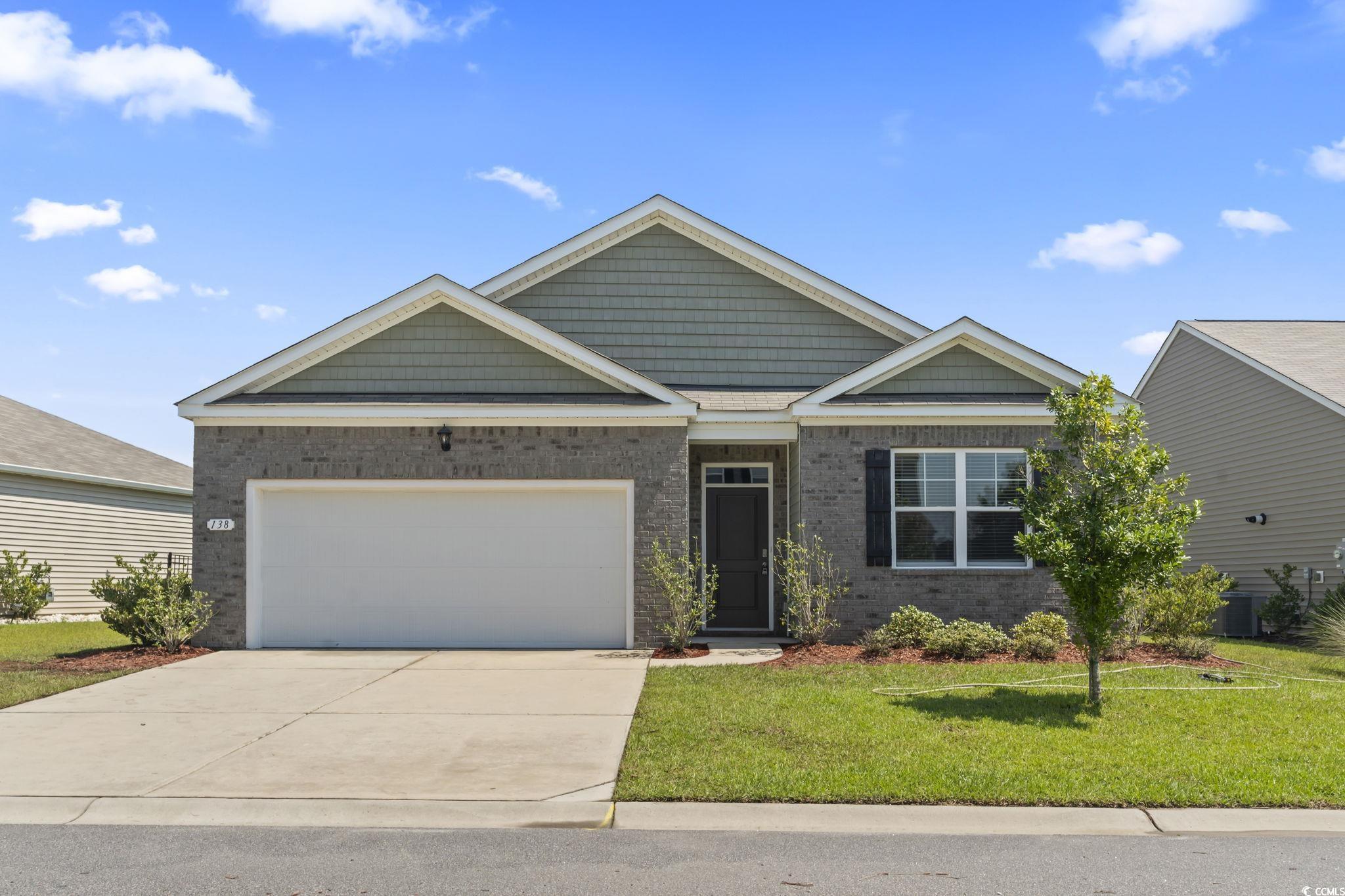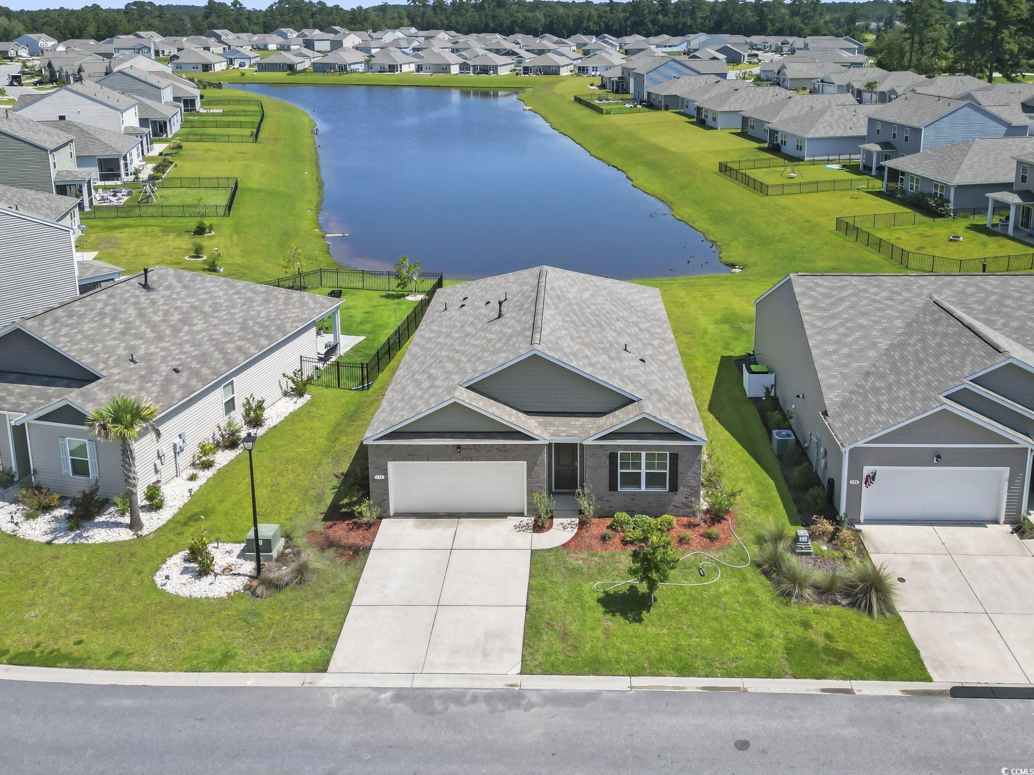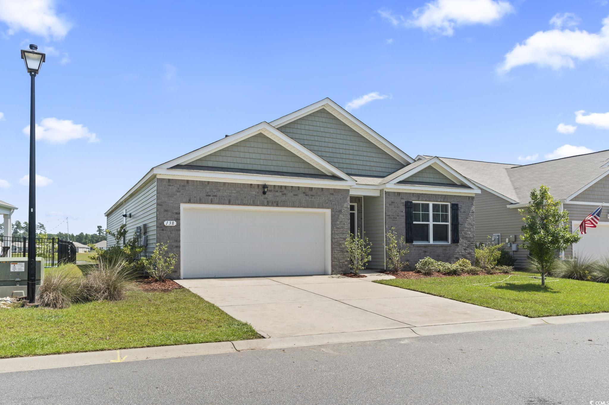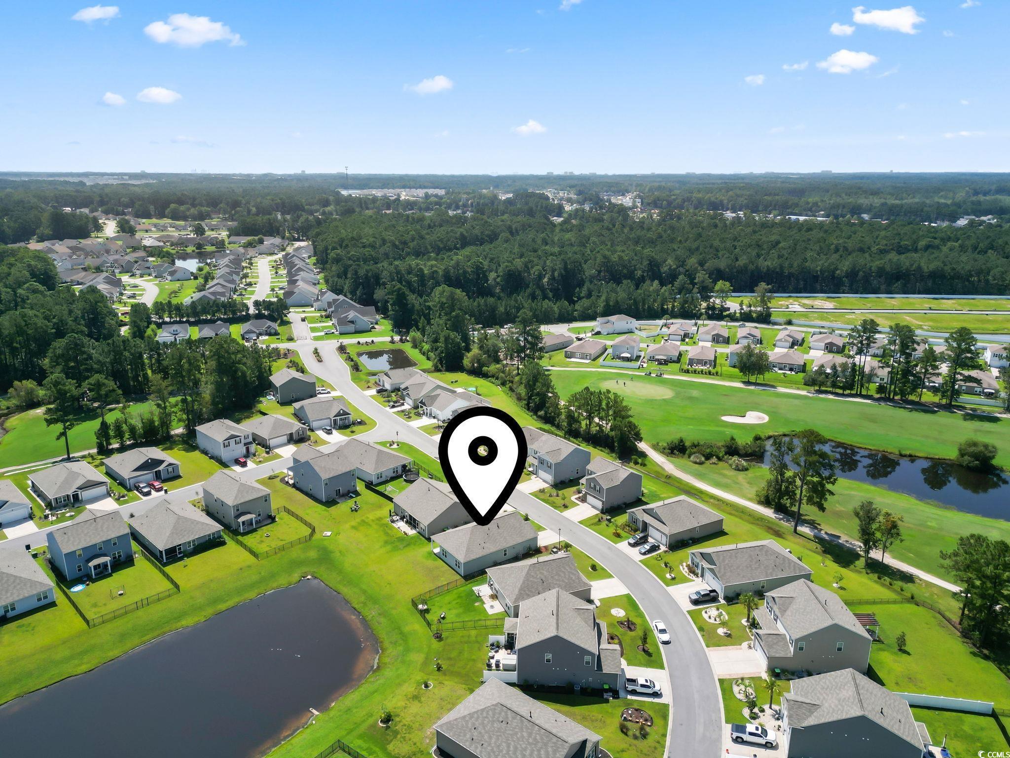 Discover easy living in The Vistas at Sun Colony, a sought-after community with a convenient location near the Highway 31 connector, offering quick access to all that the Grand Strand has to offer. From the welcoming foyer, you'll find two spacious bedrooms tucked at the front of the home, along with a full bath, making this area ideal for family or guests. Just beyond, a third bedroom and additional bath are set along a private hallway, offering flexibility for use as a guest room, home office, or hobby space. The heart of the home opens to a bright, open-concept living area that seamlessly connects the kitchen, dining, and living rooms. The kitchen is a true highlight, featuring granite countertops, an oversized island, crisp white cabinetry, a walk-in pantry, and stainless steel appliances. Low-maintenance laminate flooring flows throughout the main living spaces, combining style with durability. The dining area and living room provide plenty of space for entertaining, while sliding doors lead to a covered rear porch overlooking the pond-perfect for outdoor relaxation. The private owner's suite is thoughtfully positioned at the back of the home and includes a large walk-in closet, dual vanity, oversized shower, and separate linen closet. Conveniently located nearby, the laundry room provides easy access from both the owner's suite and main living spaces. The attached garage completes the floor plan with both function and storage in mind. Additional modern features include a smart home system that allows you to control the thermostat, front door light, lock, and video doorbell from your smartphone or with voice commands. With its thoughtful design, upgraded finishes, and convenient location, this single-level home offers the perfect blend of comfort and practicality. Measurements are not guaranteed. Buyer is responsible for verifying.