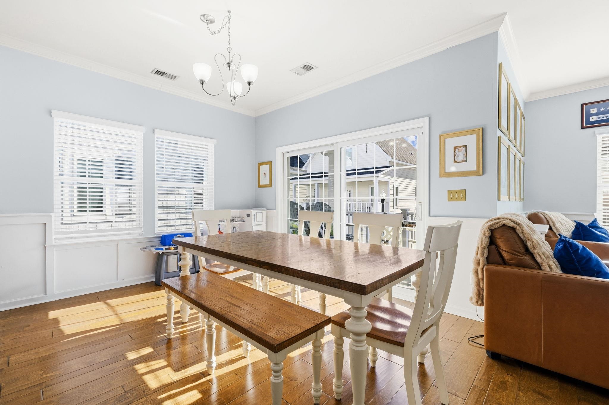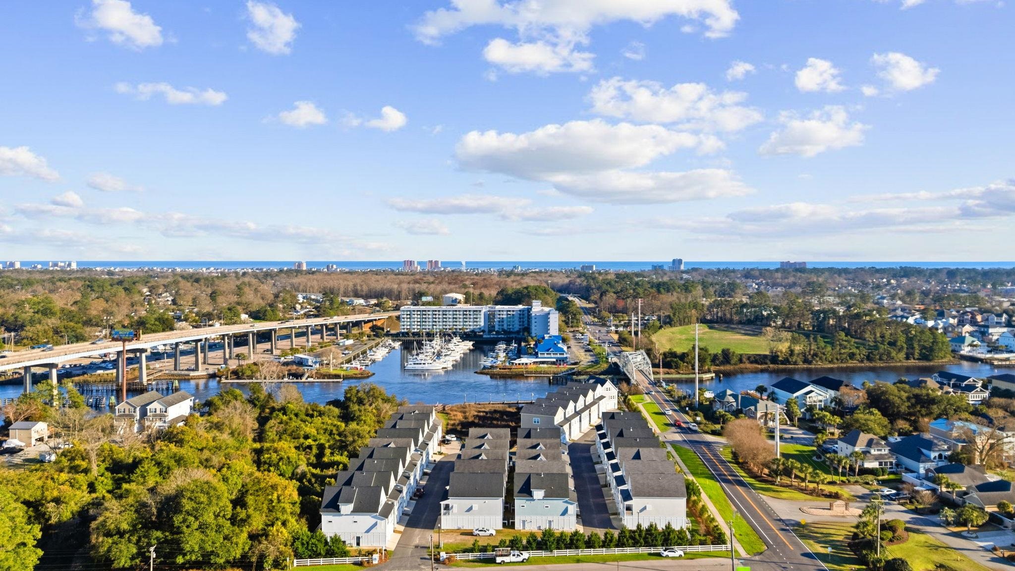 This beautifully appointed home offers 3 bedrooms and 2.5 baths with a bright, open layout designed for comfortable coastal living. The interior showcases enhanced wood flooring throughout the main living areas along with elegant crown molding in the living room, dining area, kitchen, and primary suite. The spacious kitchen is both functional and inviting, featuring upgraded cabinetry, granite countertops, a tiled backsplash, and a large work island with breakfast bar—perfect for entertaining. The main-level primary suite provides convenience and privacy, complete with en-suite bath offering a custom tiled walk-in shower and a dual-sink vanity. Upstairs, two additional bedrooms share a Jack-and-Jill bath, creating an ideal layout for guests or family. Natural light fills the home, enhancing the airy feel throughout. Located in the desirable Cottages at Marker 350, this community offers a true Intracoastal Waterway lifestyle, including access to a private dock and pier with day-use boat docking. Conveniently situated near the beaches of Cherry Grove and North Myrtle Beach, as well as an abundance of dining, shopping, golf, and waterfront activities, this home delivers the perfect blend of coastal charm and everyday convenience. Schedule your private showing today!