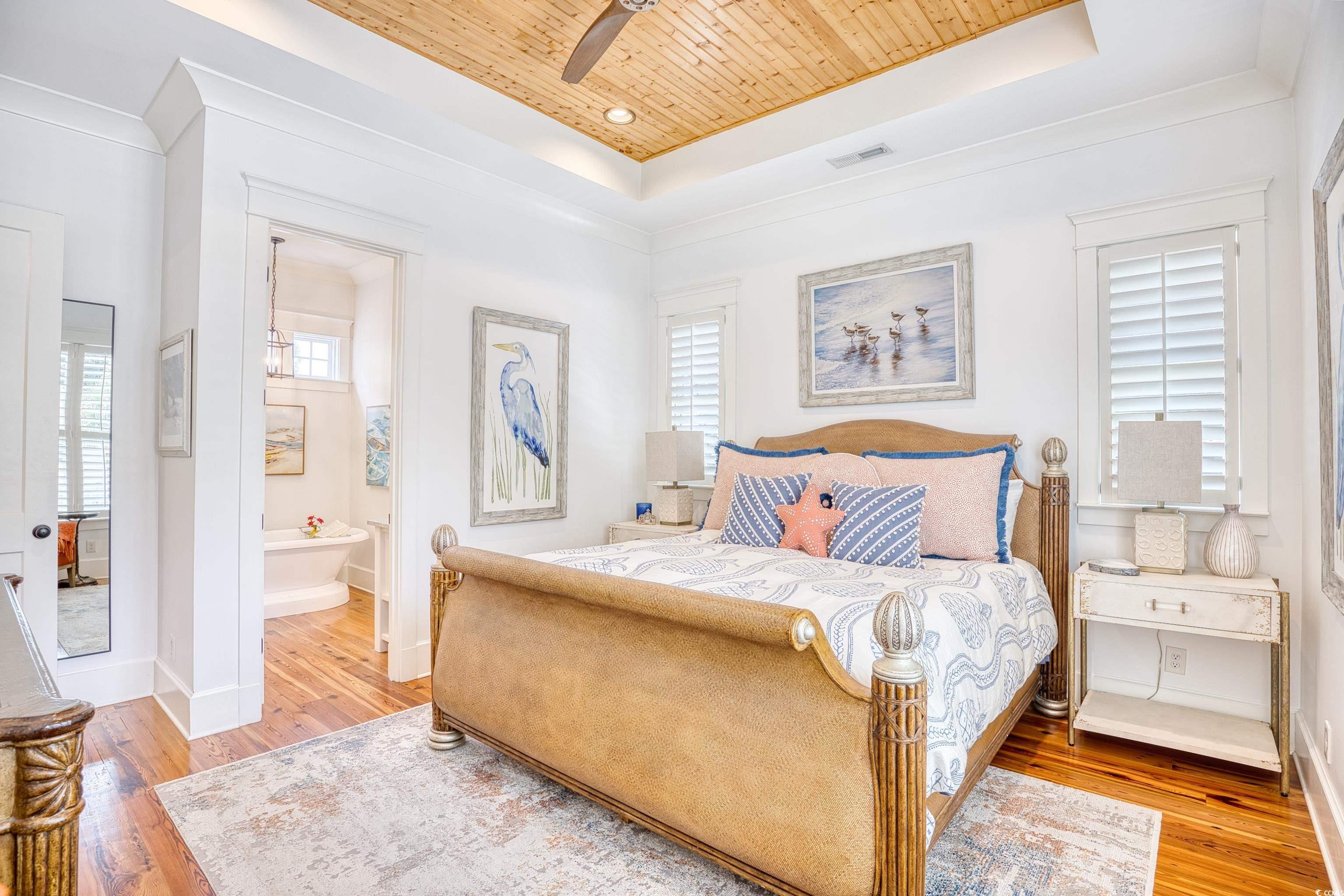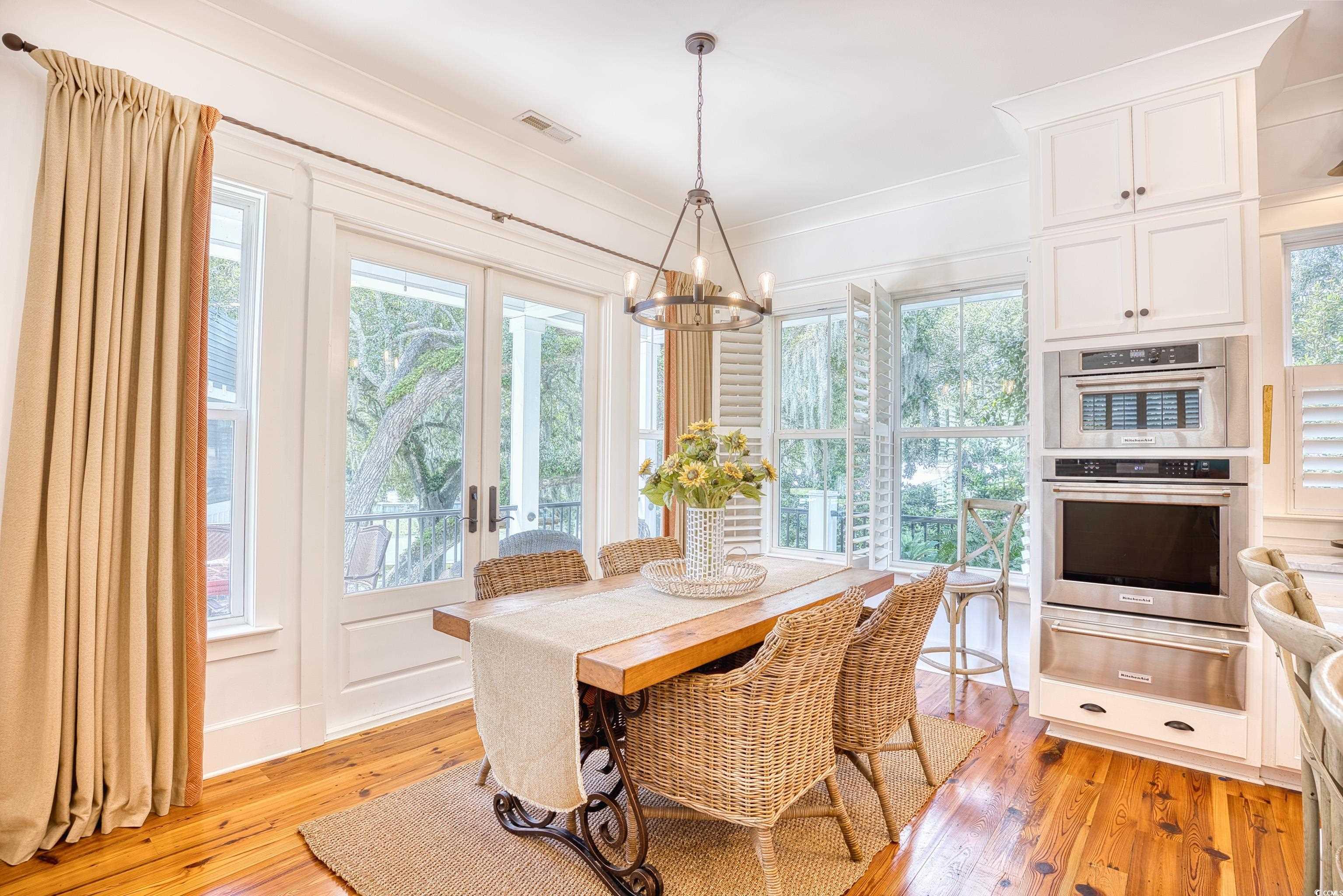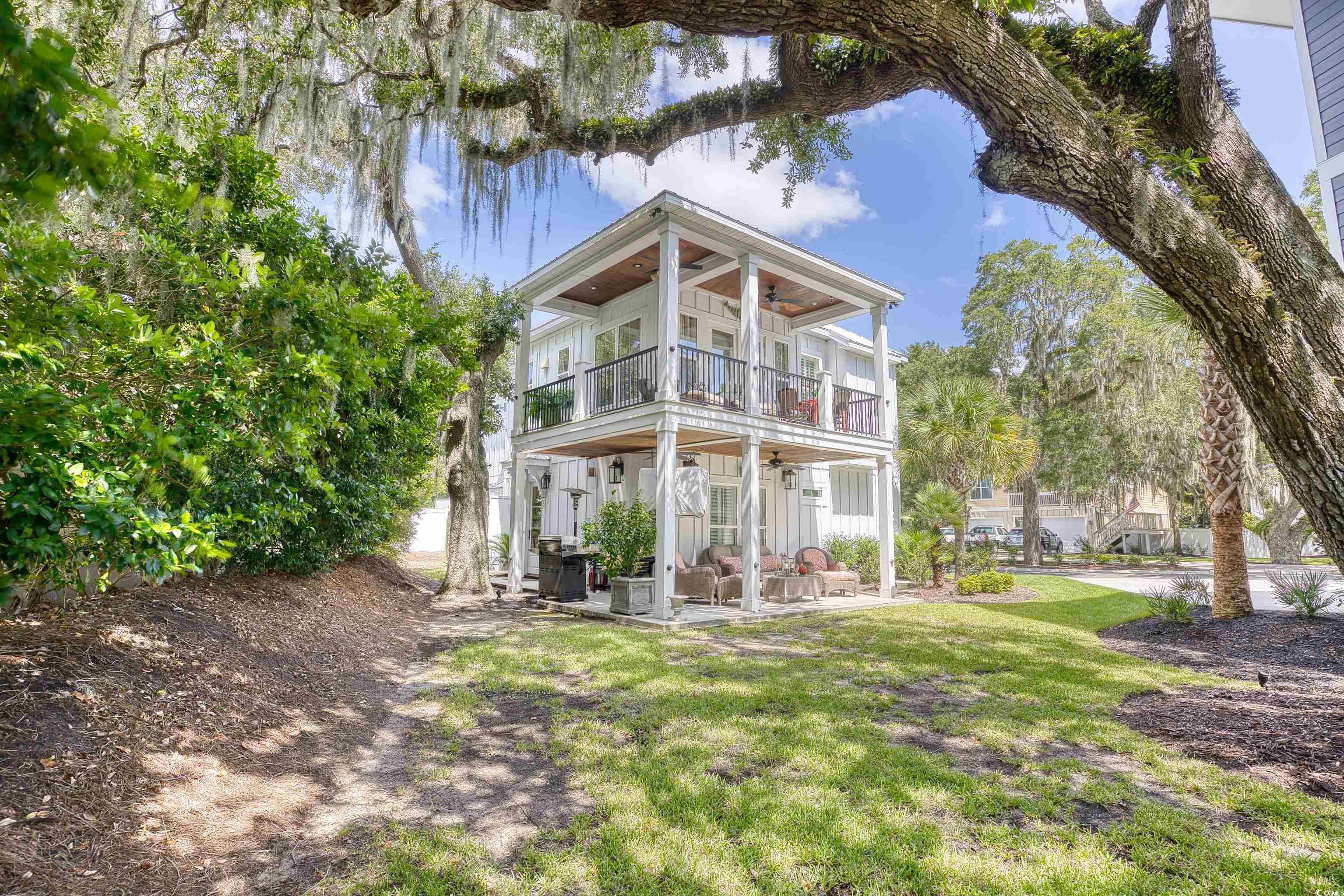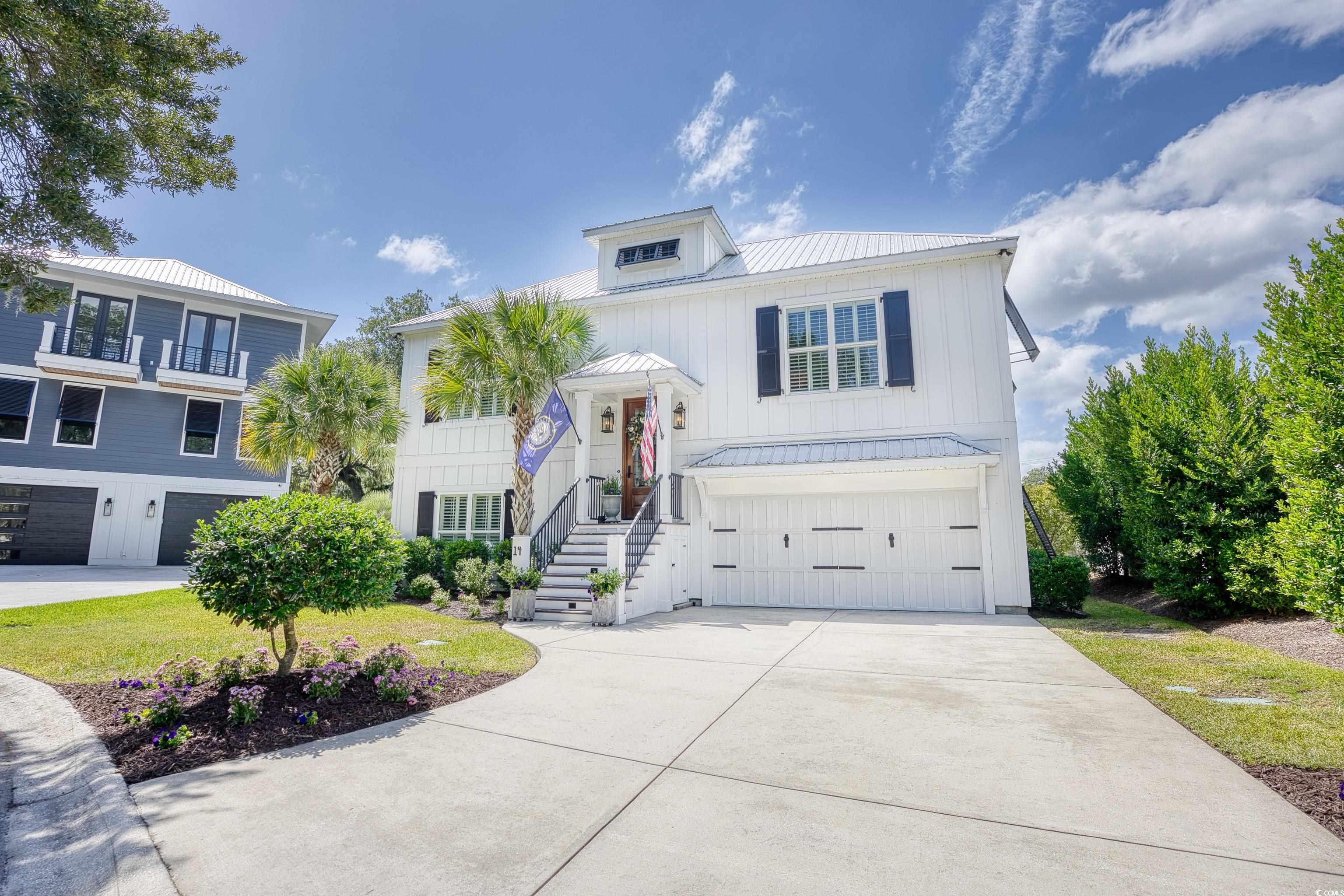 Welcome to 14 Flaggpoint Lane. This exquisite home is located in a small community of custom residences surrounded by live oaks and offers a peaceful backyard oasis with views of a tidal creek. The home features wraparound porches, access to a shared community dock for boating, and is just a golf cart ride away from the restaurants at Murrells Inlet Marshwalk. This better-than-new home includes 3 bedrooms and 2.5 baths. The primary suite is on the main level offering privacy when hosting overnight guests. Two bedrooms are located on the first level and open to an additional living space currently used as an office, complete with a wet bar, microwave oven, and refrigerator. Highlights and upgrades include custom closets and drawers in all rooms, reclaimed heart pine floors throughout, a great room with a fireplace, custom barn doors for the laundry area, plantation shutters throughout the home, and a chef’s kitchen with stainless steel appliances, marble countertops and a separate butler’s pantry. All bedrooms have built-out closets. This elegant home is updated and move-in ready! Owner is a Licensed Realtor in SC.