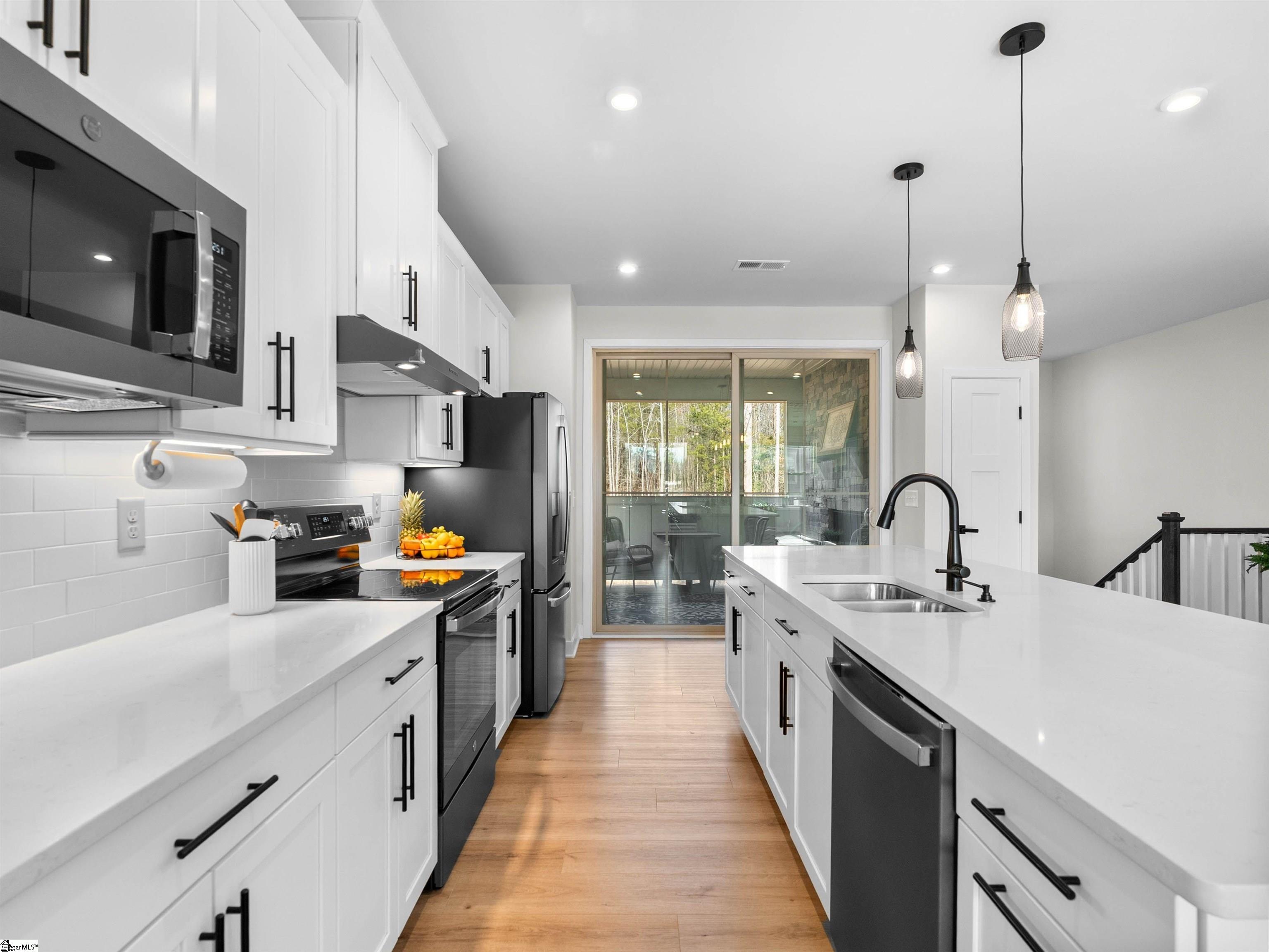 Live more and maintain less in this stunning end-unit luxury townhome located in the highly desirable Copper Run community. Built in 2022 and thoughtfully upgraded, this better than new home is tucked against peaceful wooded views and offers a true lock-and-leave lifestyle where exterior and yard maintenance are handled for you so your weekends are spent relaxing, not working. Just minutes from Hollingsworth Park, the Swamp Rabbit Trail, Verdae amenities, top-rated schools, Downtown Greenville, I-385, shopping, dining, and the Greenville-Spartanburg Airport, this location perfectly blends convenience with an exceptional lifestyle. Offering over 2,200 square feet of beautifully designed living space, this home features three bedrooms, two full baths, and two half baths, with upscale finishes throughout. The bright, open main level is filled with natural light and enhanced by upgraded LVP flooring, creating a warm and inviting atmosphere ideal for both everyday living and entertaining. The chef’s kitchen serves as the heart of the home, showcasing quartz countertops, an oversized quartz island with seating for four, upgraded Slate Gray GE appliances, a ceramic tile backsplash, under-cabinet lighting, and upgraded white cabinetry with crown molding. A spacious dining area flows seamlessly into the great room, making it perfect for hosting gatherings, celebrating milestones, or enjoying quiet evenings at home. Just off the kitchen, the main level opens to a beautifully enclosed covered porch one of the home’s most special features and a true extension of the living space. Designed for year-round enjoyment, this expanded outdoor retreat features a stacked stone gas fireplace with mantel and overlooks serene wooded views. Whether it’s morning coffee, cozy nights by the fire, or effortless entertaining with friends, this porch is a space you’ll truly fall in love with. Upstairs, the primary suite offers a peaceful retreat with a tray ceiling, large walk-in closet, dual sinks with quartz countertops, a tiled shower with seating, and a linen closet. Two additional bedrooms, a full hall bath, and a conveniently located laundry room complete the upper level, offering comfort and functionality for everyday living. The lower entry-level floor adds incredible flexibility with a versatile space that easily adapts to your lifestyle—perfect for a home office, gym, playroom, studio, or media room. This level also includes a half bath, multiple storage closets with extensive under-stair storage, and access to the private backyard and extended partially covered patio, creating yet another inviting space to unwind. Additional upgrades throughout the home include a finished two-car garage with an extra storage room and utility sink, custom blinds, an extended covered porch, an upgraded hardware package, and oak staircases, all thoughtfully selected to enhance both style and function. Beyond the home itself, residents of Copper Run enjoy a truly low-maintenance lifestyle with yard and exterior maintenance included, along with community features such as a shared fire pit and easy access to Verdae trails, Legacy Park, the YMCA, nearby restaurants, and shopping. Impeccably maintained and completely move-in ready, this Copper Run townhome offers the perfect blend of luxury, location, and low-maintenance living allowing you to focus on what matters most and enjoy life to the fullest. Welcome home!