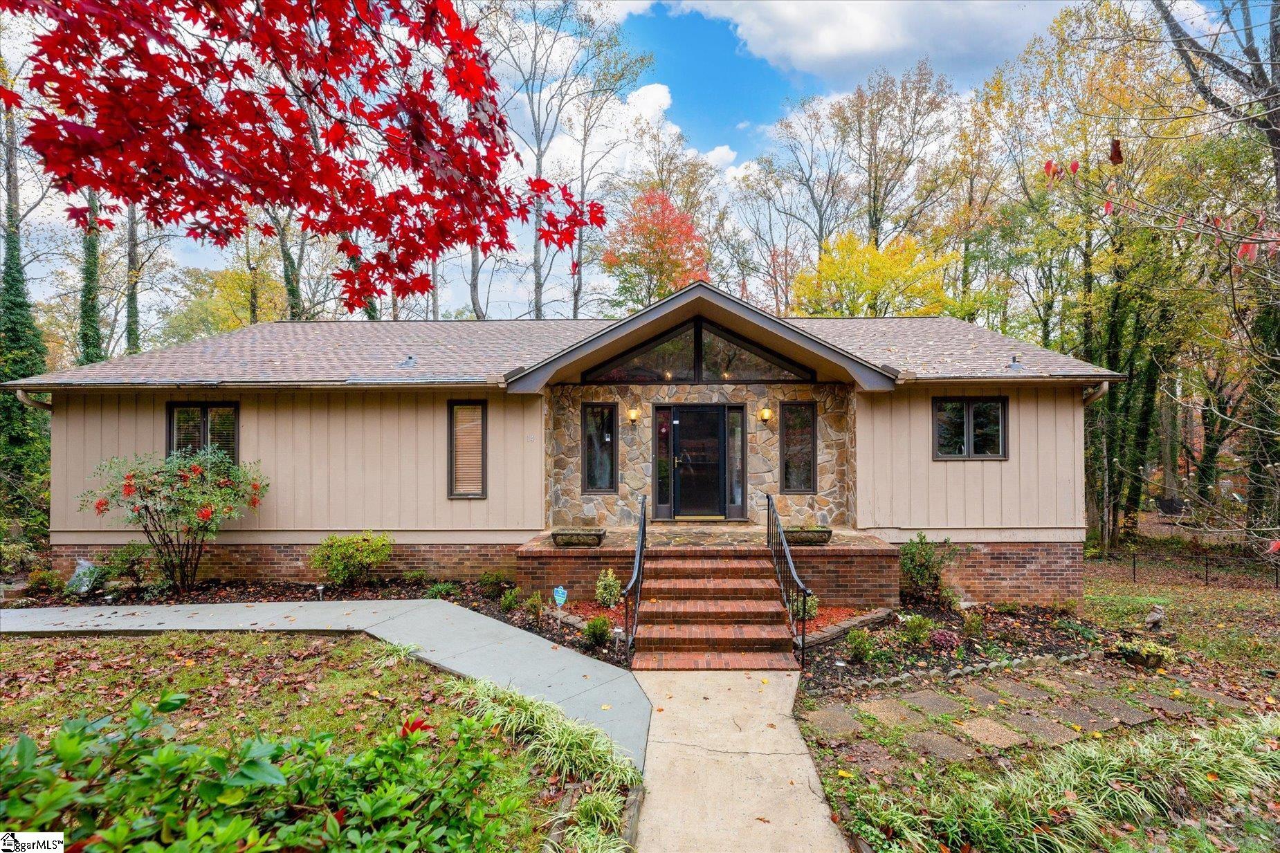 Stunning Ranch Home with Mid Century Charm, Modern Updates and tons of potential for someone to give it their personal touch. This 3,166 sq. ft. single-family home blends mid-century charm with modern luxury on a sprawling 1-acre lot in one of the subdivision's largest properties. The fenced backyard and wooded surroundings provide privacy in a quiet, sought-after neighborhood. Featuring 3 bedrooms, 3 full baths, and dual primary suites with ensuite baths on the main level, this home is perfect for comfort and convenience. The fully renovated kitchen boasts custom cabinets, butcher block counters, a white farmhouse sink, stainless steel KitchenAid appliances, a dual oven, and a built-in microwave combo. The walkout basement gives additional living space, including a third bedroom, rec-room/office, flex space with wet bar, plus a dual-bay garage. Additional updates include a new roof (2023) and dual-zone HVAC. Main level done in 2022 and basement mini split in 2024. Ideally located just 11 minutes to downtown Greenville, 3 minutes to Paris Mountain State Park, and minutes from shopping, dining, and four nearby grocery stores. A must-see!