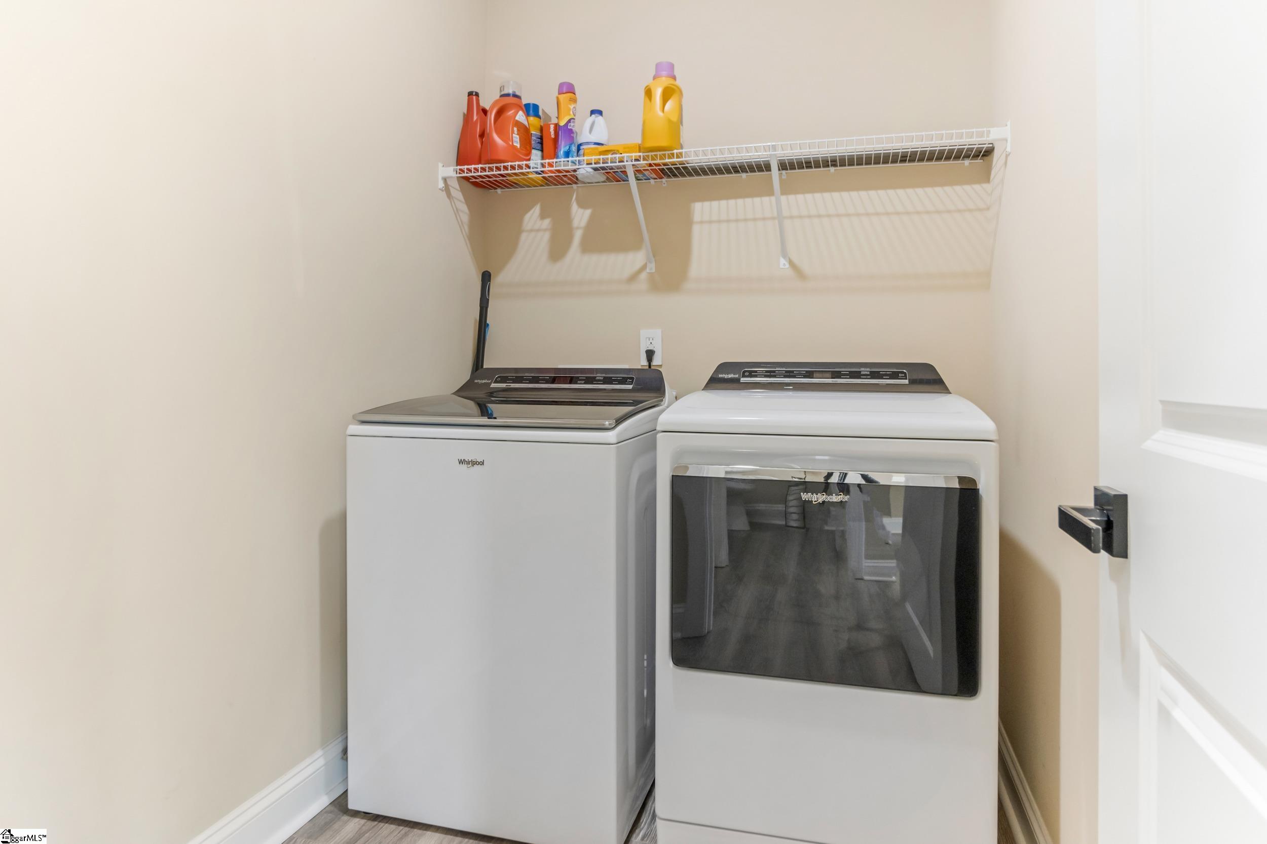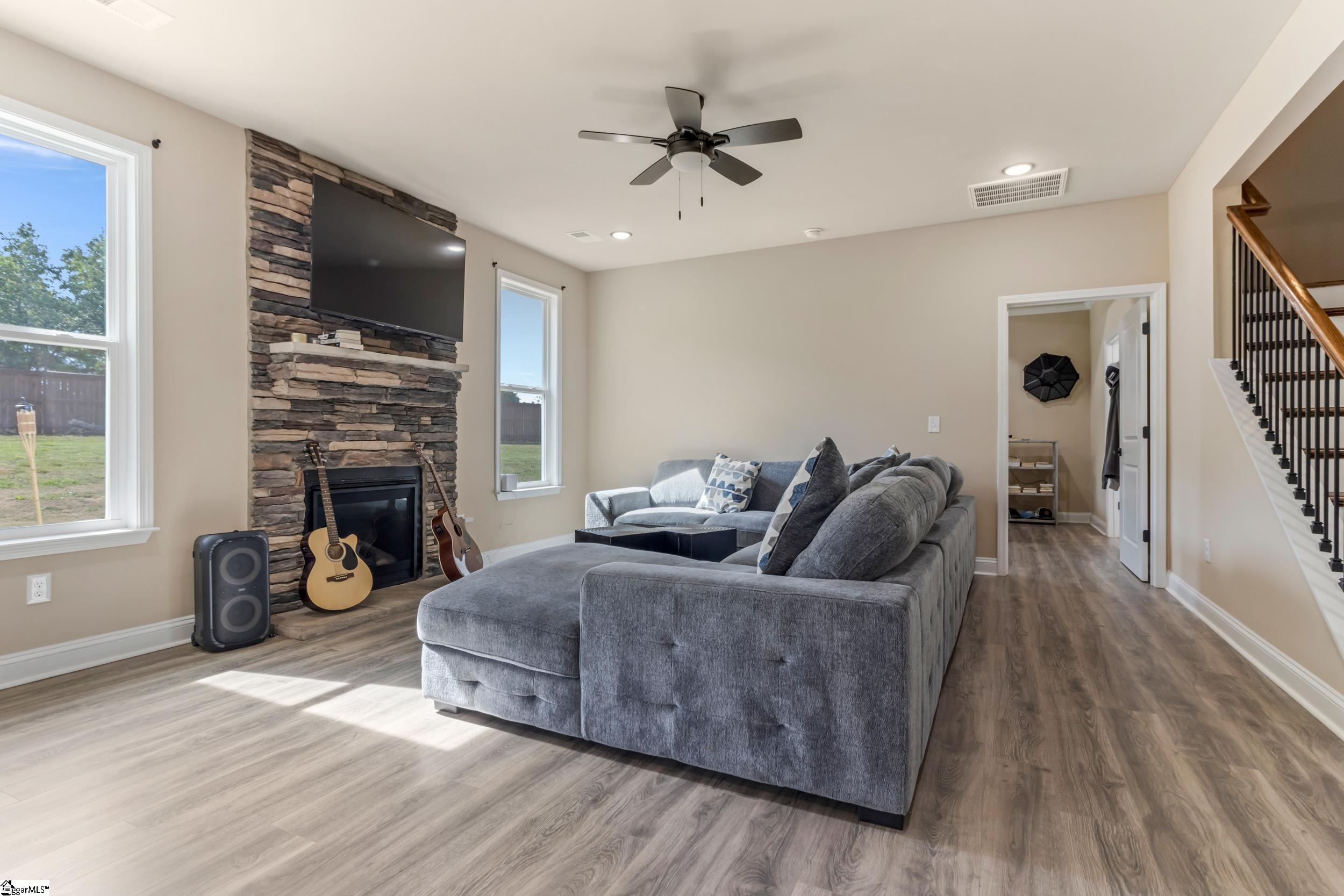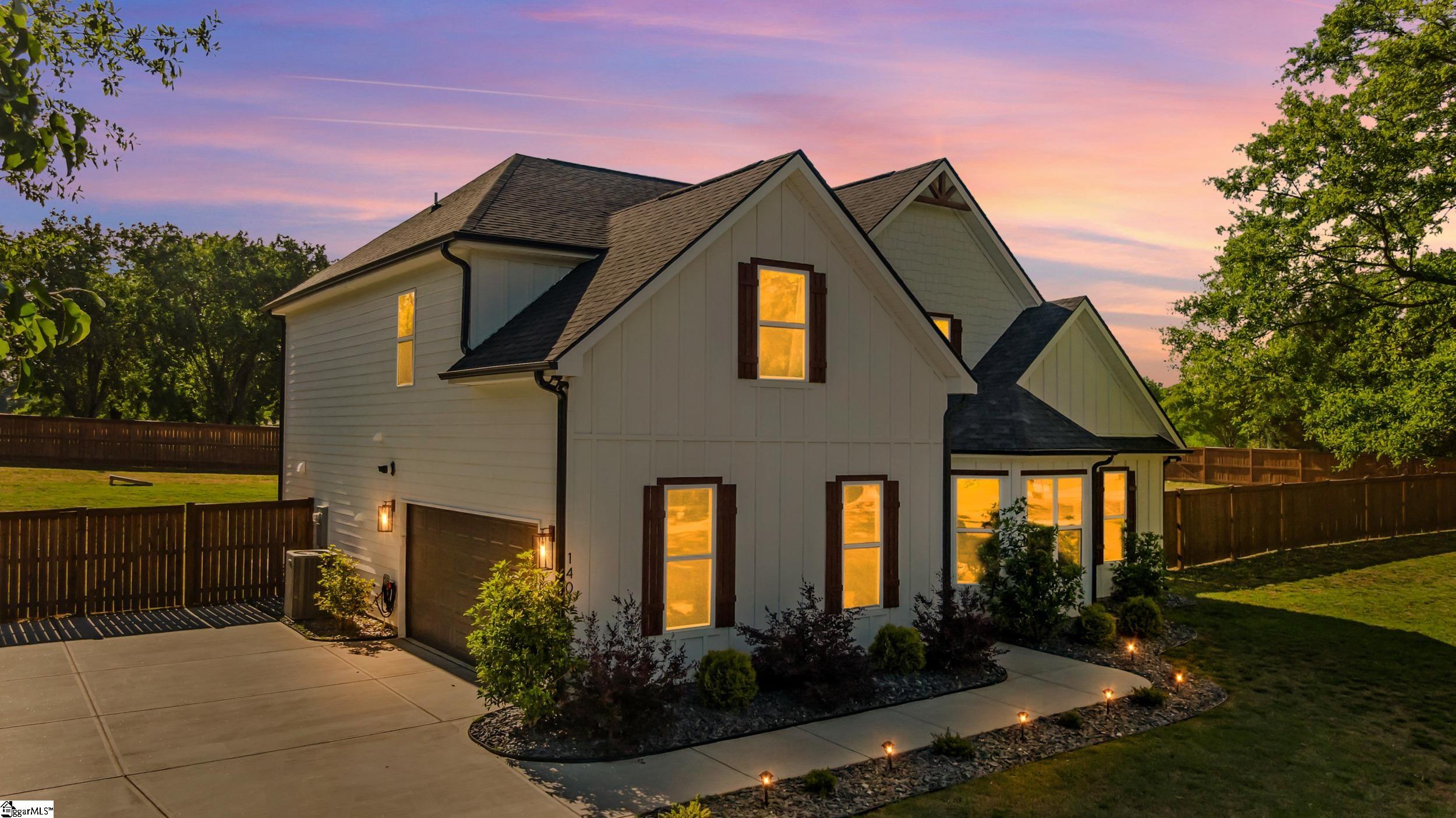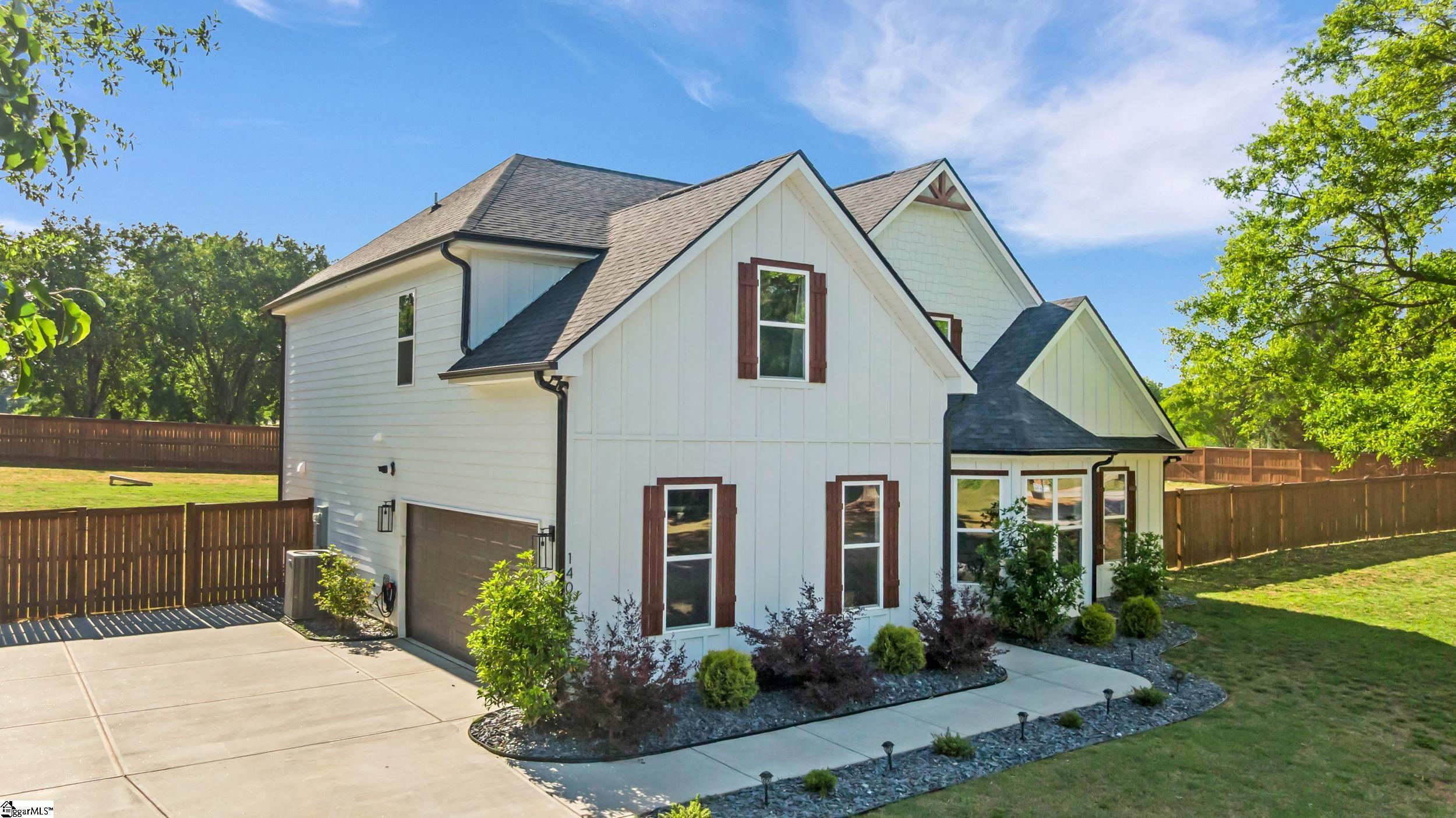Welcome to 140 Lauden Drive in Moore — a beautifully crafted custom home that combines quality construction, thoughtful design, and an unbeatable location. This striking white Hardie board residence immediately stands out with its clean curb appeal and expanded concrete parking area, complemented by a two-car garage featuring finished flooring. Step inside to a welcoming foyer, where a formal dining room sits elegantly to your right, setting the tone for the refined details found throughout the home. The open-concept main level is designed for both everyday living and entertaining. Large windows fill the space with natural light, highlighting the spacious living room with a cozy fireplace and seamless flow into the kitchen. You’ll appreciate the generously sized pantry, crown molding throughout, and a vented range hood—a feature often sought after for both style and function. The main level also features no carpet, offering a clean, modern feel. The primary suite on the main floor provides comfort and privacy, complete with tray ceilings, a beautifully appointed bathroom featuring a tile shower and separate tub, and convenient access to the laundry room. Upstairs, you’ll find three additional bedrooms along with a versatile family room—perfect for a media space, playroom, or home office. Step outside to the covered back porch, where you can unwind and take in peaceful sunset views every evening. The fully fenced backyard adds both privacy and functionality. Location is another standout feature—ideally situated between Greenville and Spartanburg, with Greenville-Spartanburg International Airport just 15 minutes away. Enjoy outdoor activities nearby at Tyger River Park, all while being zoned for desirable District 5 schools. Enjoy close proximity to some of the area’s most popular destinations, including Tyger River Park for outdoor activities, WestGate Mall for shopping and dining, and BMW Performance Center for a unique local attraction. Quick access to Interstate 85 makes commuting simple and convenient. This home offers the perfect balance of style, comfort, and convenience—ready to welcome its next owner.