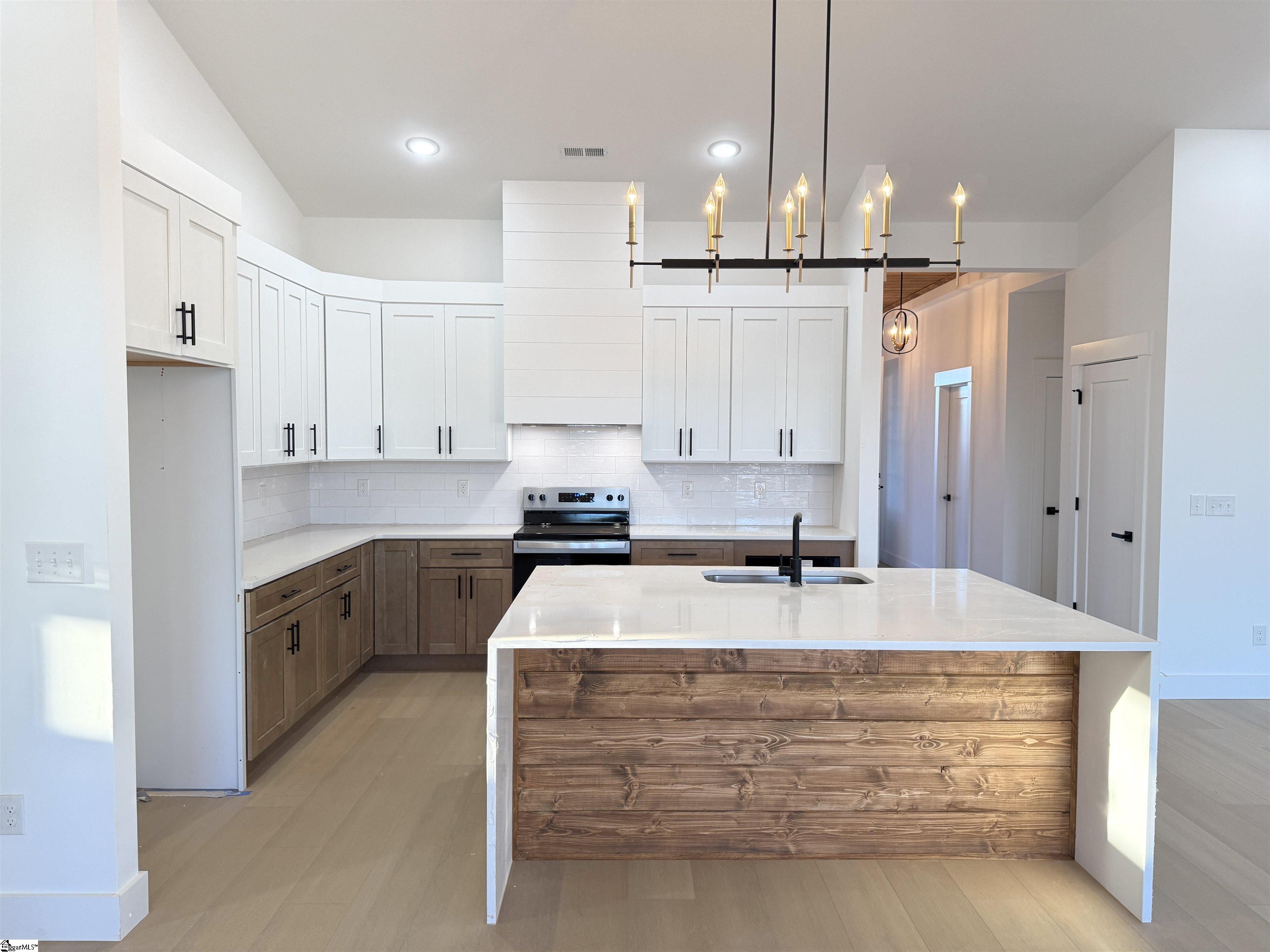 Currently under construction. This stunning custom home features 4 bedrooms and 3 bathrooms, where every detail reflects elevated design — from wide-plank LVP flooring to sleek modern lighting throughout. Step into a bright, open living space highlighted by soaring peak 14-foot ceilings, while the rest of the home boasts impressive 10-foot ceilings that enhance the spacious, airy feel. The kitchen is a true showstopper, featuring a waterfall-edge quartz island, abundant cabinetry, endless counter space, and stainless steel appliances — perfect for both entertaining and everyday living. The living room showcases elegant custom accent walls that add warmth, texture, and a designer touch to every gathering. Unwind in the luxurious owner’s suite, complete with a spacious sitting area, a huge walk-in closet with custom shelving and a large mirror, and a spa-inspired bathroom offering a walk-in tiled shower, relaxing garden tub, and dual vanities with backlit touchscreen mirrors. A massive sliding glass door connects the main living area to the covered back porch, creating seamless indoor-outdoor living and filling the home with natural light. Additional highlights include a well-appointed laundry room with built-in cabinets and sink just off the two-car garage, soft exterior lighting that makes the home glow beautifully at night, and an open, functional layout designed for comfort and convenience. Outside, enjoy peaceful mornings or sunset views from the covered porch. With plenty of parking and a spacious lot, this home blends comfort, convenience, and modern style. Don’t miss the opportunity to own this beautiful custom home — schedule your tour today! Agent related to seller.