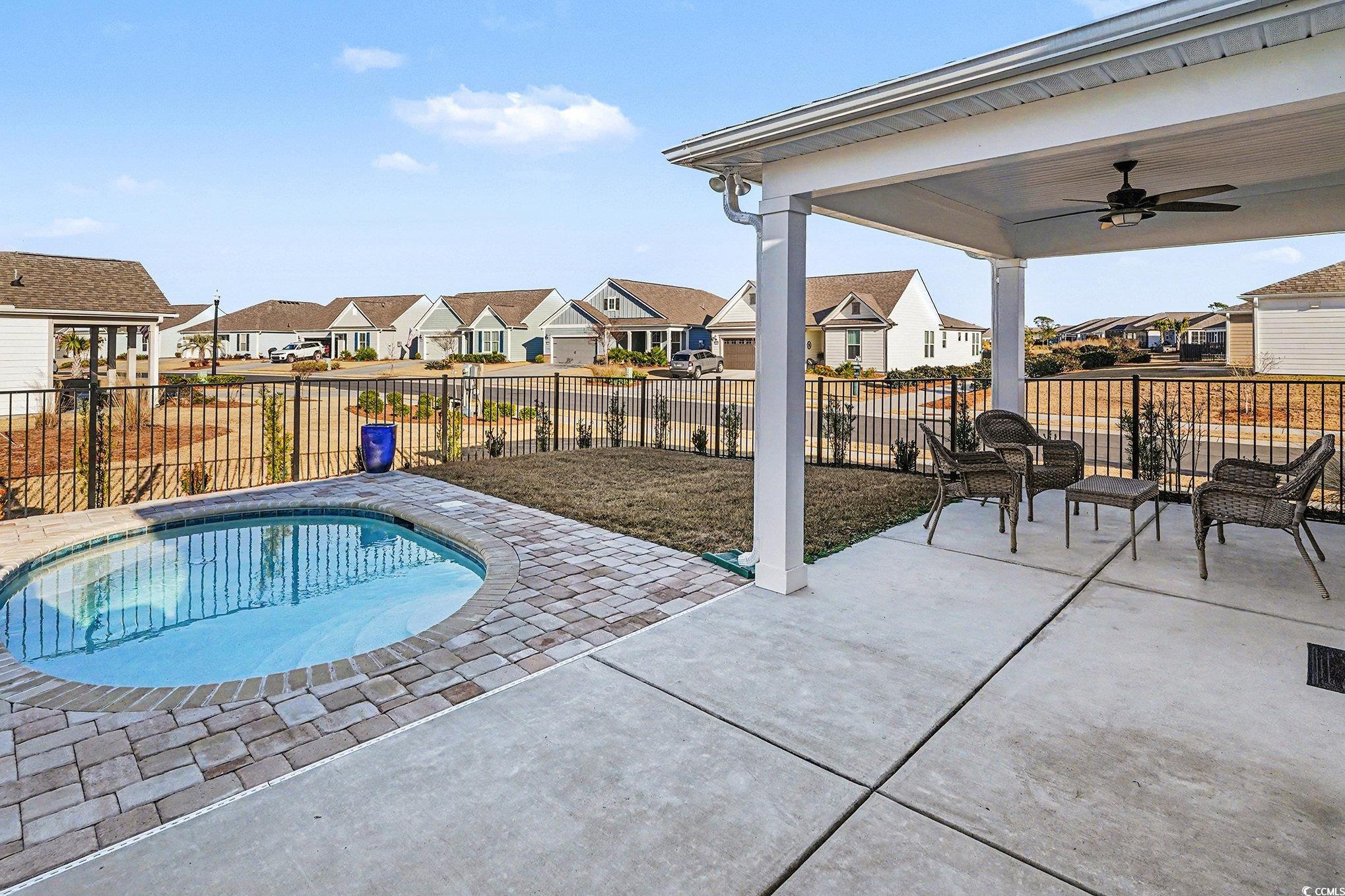 You truly can have it all at Del Webb North Myrtle Beach. Welcome to a beautifully maintained home in one of the area’s premier 55+ active adult, golf-cart-friendly communities, where resort-style amenities and a vibrant lifestyle come together to help you live life to the fullest. Del Webb North Myrtle Beach offers an exceptional amenity experience, including a zero-entry resort-style pool, a 12,000-square-foot clubhouse, state-of-the-art fitness center, indoor lap pool, and dedicated craft room. Enjoy friendly competition on the pickleball and bocce courts, practice your short game on the putting green, and stay socially connected with a full calendar of clubs and activities curated by a full-time Lifestyle Director. Now introducing this move-in-ready residence, which is situated on a premium fenced corner lot, is thoughtfully designed with an open-concept floor plan featuring two spacious bedrooms plus a flexible third room, currently utilized as a stylish home office. The heart of the home is the inviting kitchen, complete with granite countertops, integrated appliances, a generous pantry, and bar-height seating that seamlessly connects to the living and dining areas. The primary suite provides a peaceful retreat with a ceiling fan, a private en-suite bathroom that features a tiled walk-in shower and dual sinks. Step outside from the living room to your covered porch, fenced backyard, and private saltwater pool, creating the ideal setting for relaxing or entertaining in your own coastal oasis. For added comfort and convenience, a motorized garage screen keeps the space cool and bug-free, perfect for hobbies or projects. Front yard lawn care, cable TV, high-speed internet, and full access to all community amenities are included in the low monthly HOA fees, allowing for truly carefree living. Enjoy a luxury coastal lifestyle where every detail is designed for comfort, connection, and convenience. Whether you’re seeking an active, social community or a peaceful retreat close to the beach, this exceptional home delivers it all in one of North Myrtle Beach’s most desirable locations. Schedule your private showing today and start living the Del Webb lifestyle.