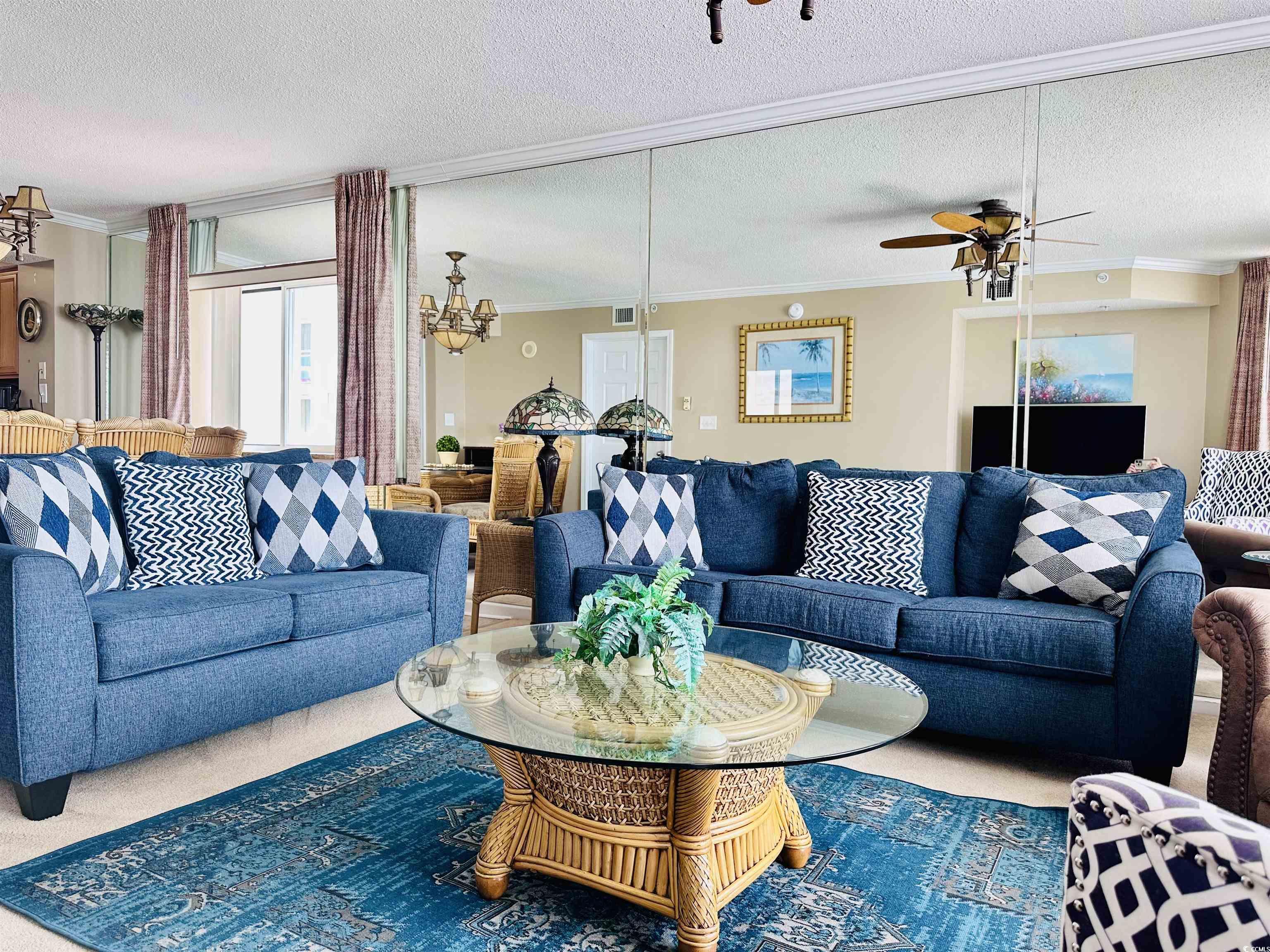 South Shore Villas - Located in the Crescent Beach area, this 2000 sq ft end unit condo has 4 bedrooms and 3 baths, is a MUST SEE!! Located on the 10th floor, the spacious living room features a flat screen cable TV/DVD, ceiling fan and free wireless internet. The 25ft Oceanfront balcony is accessible through glass sliding doors from the living room and the master suite . The fully equipped kitchen has granite counter top, breakfast bar, and full size washer/dryer. The master suite offers a King size bed, flat screen cable TV/DVD, ceiling fan and the en-suite bathroom has double sinks, a jacuzzi tub and separate glass enclosed shower. The 2nd bedroom has a King size bed, flat screen cable TV/DVD, ceiling fan and jack n jill bath shared with the 3rd bedroom which has a Queen size bed, flat screen cable TV and en-suite bath. The 4th bedroom has a Queen size bed, cable TV and ceiling fans. The 3rd bathroom is in hall area of condo. Unit sold furnished.