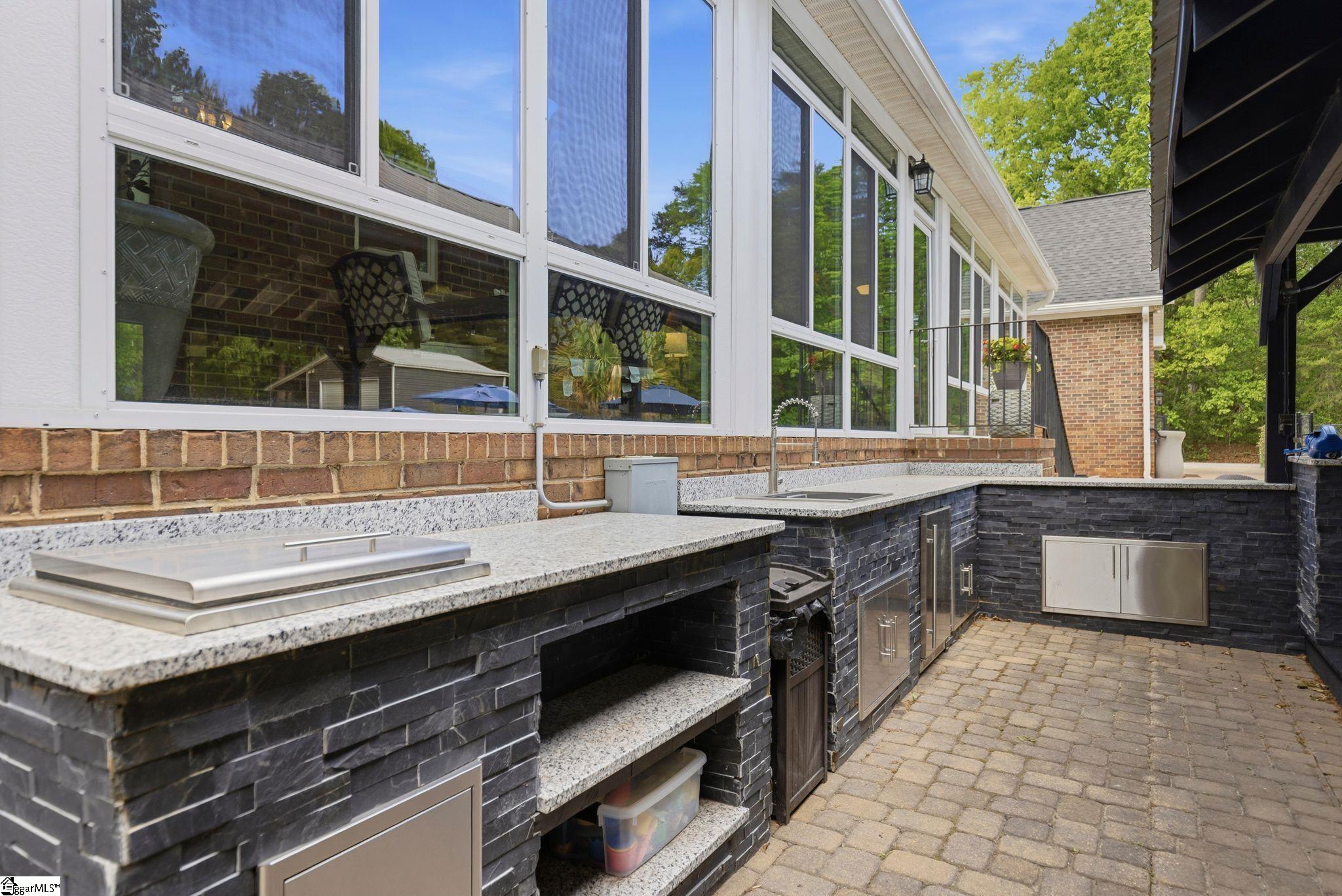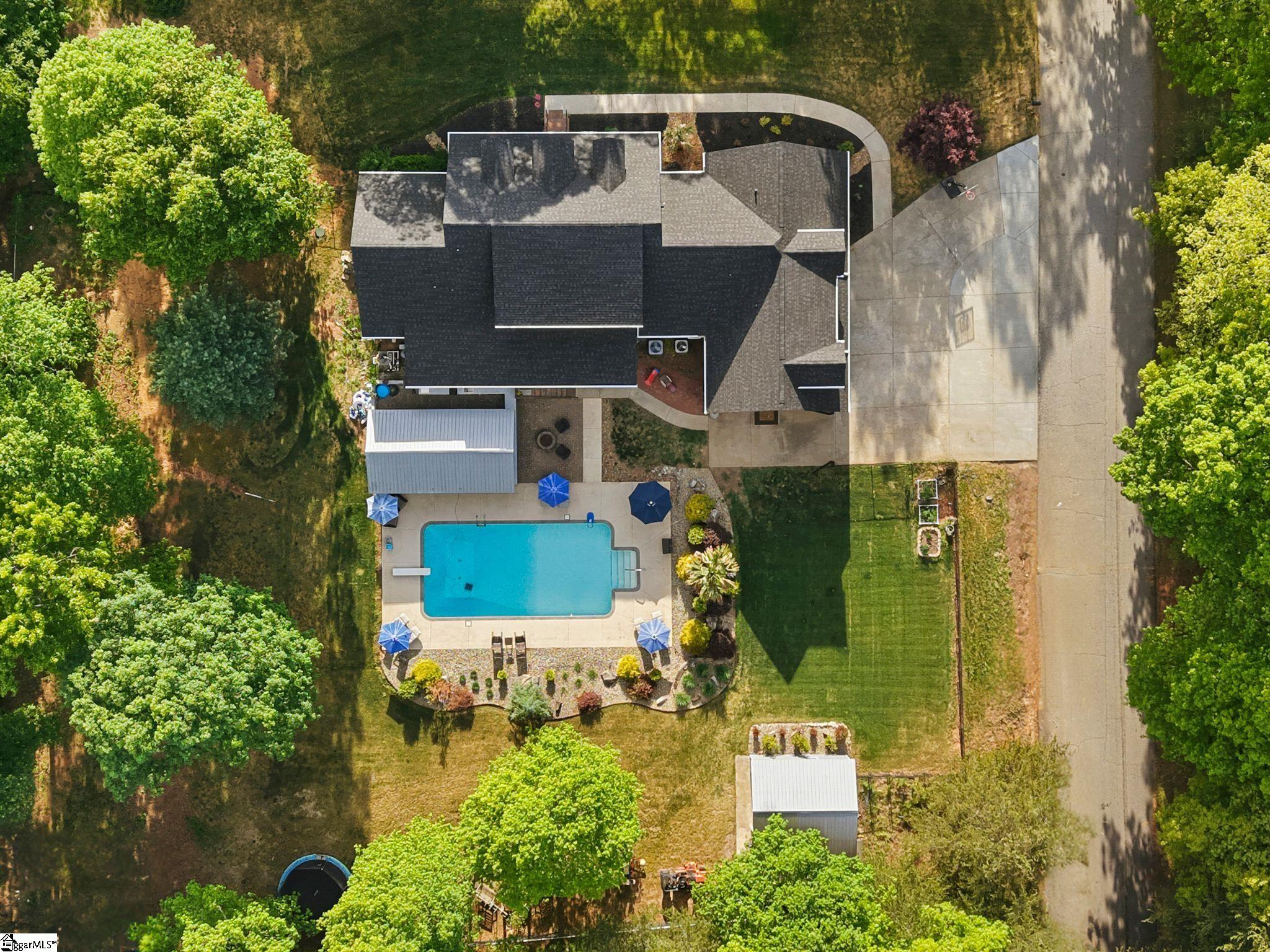 Private 2+ acre estate in the Blue Ridge community of northern Greer, designed for multi-generational living with a rare blend of privacy, space, and versatility. The all-brick main residence offers approximately 4,200 square feet with 5 bedrooms, 4 full baths, and a main-level primary suite. Multiple flex spaces provide options for a home gym, theater, office, or library. A private in-law suite adds flexibility for extended living arrangements. At the heart of the home, the fully renovated kitchen features marble countertops, dual peninsulas with waterfall edges, a full marble backsplash, and a premium appliance package including Wolf, Sub-Zero, and Cove. Natural gas services the cooktop, dryer, and tankless water heater. A spacious four-season sunroom extends the main living area and brings in abundant natural light. Outdoor living is designed for both everyday enjoyment and entertaining, featuring a 20x40 custom pool with a new glass media filter and Pentair salt generator, along with a covered pavilion complete with a full outdoor kitchen. The property also includes a one-bedroom apartment (not included in total sq ft) with a separate entrance featuring a full kitchen and laundry—ideal for guests, extended family, or rental income potential. Additional highlights include a three-car garage and a 20x30 workshop with electricity, offering ample space for storage, hobbies, or workspace needs. Recent upgrades including a new roof and 42 Andersen windows, enhance efficiency and long-term value. Enjoy a peaceful, private setting with a rocking chair front porch, all while being conveniently located near shopping, dining, and top-rated schools.