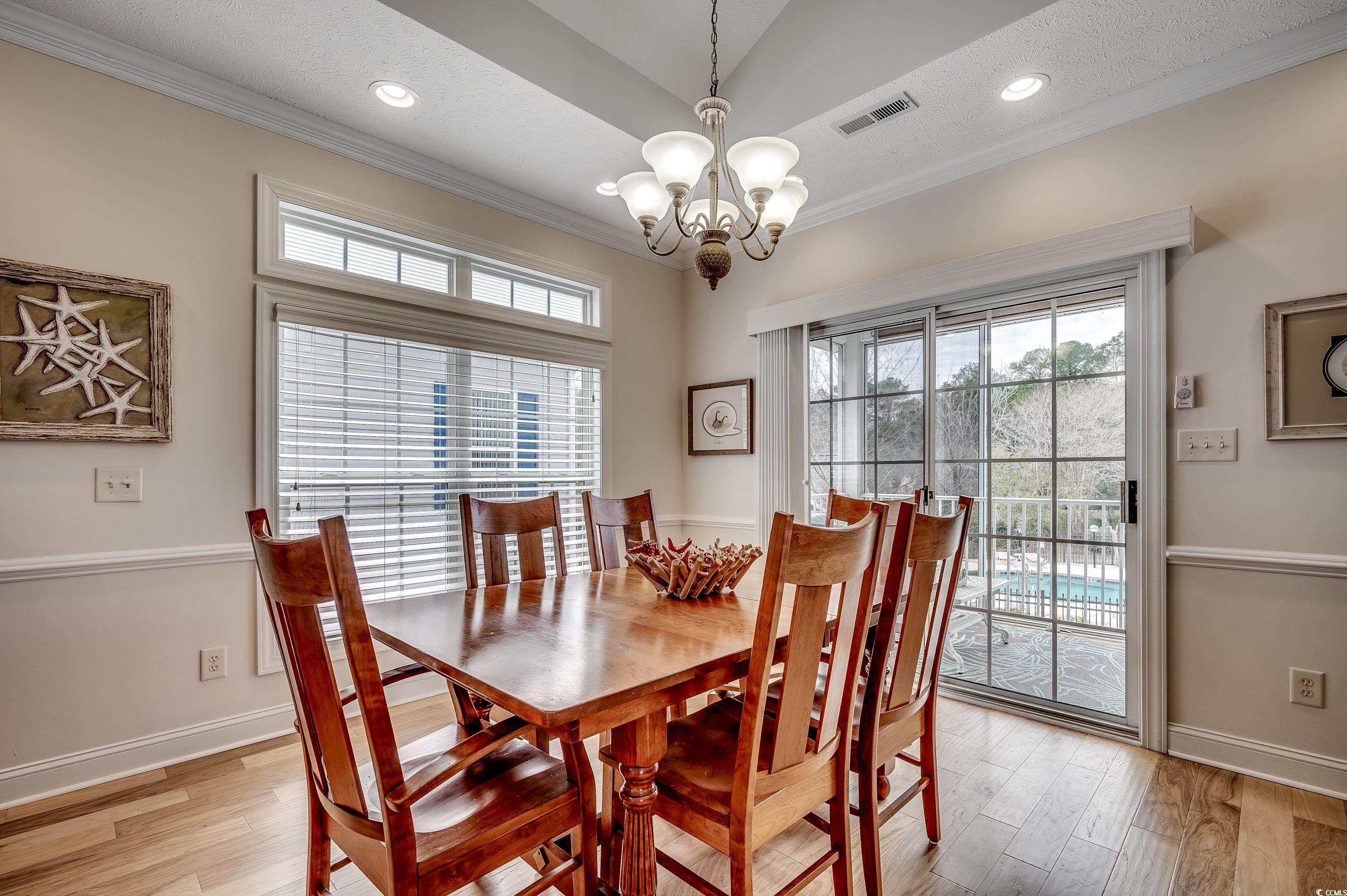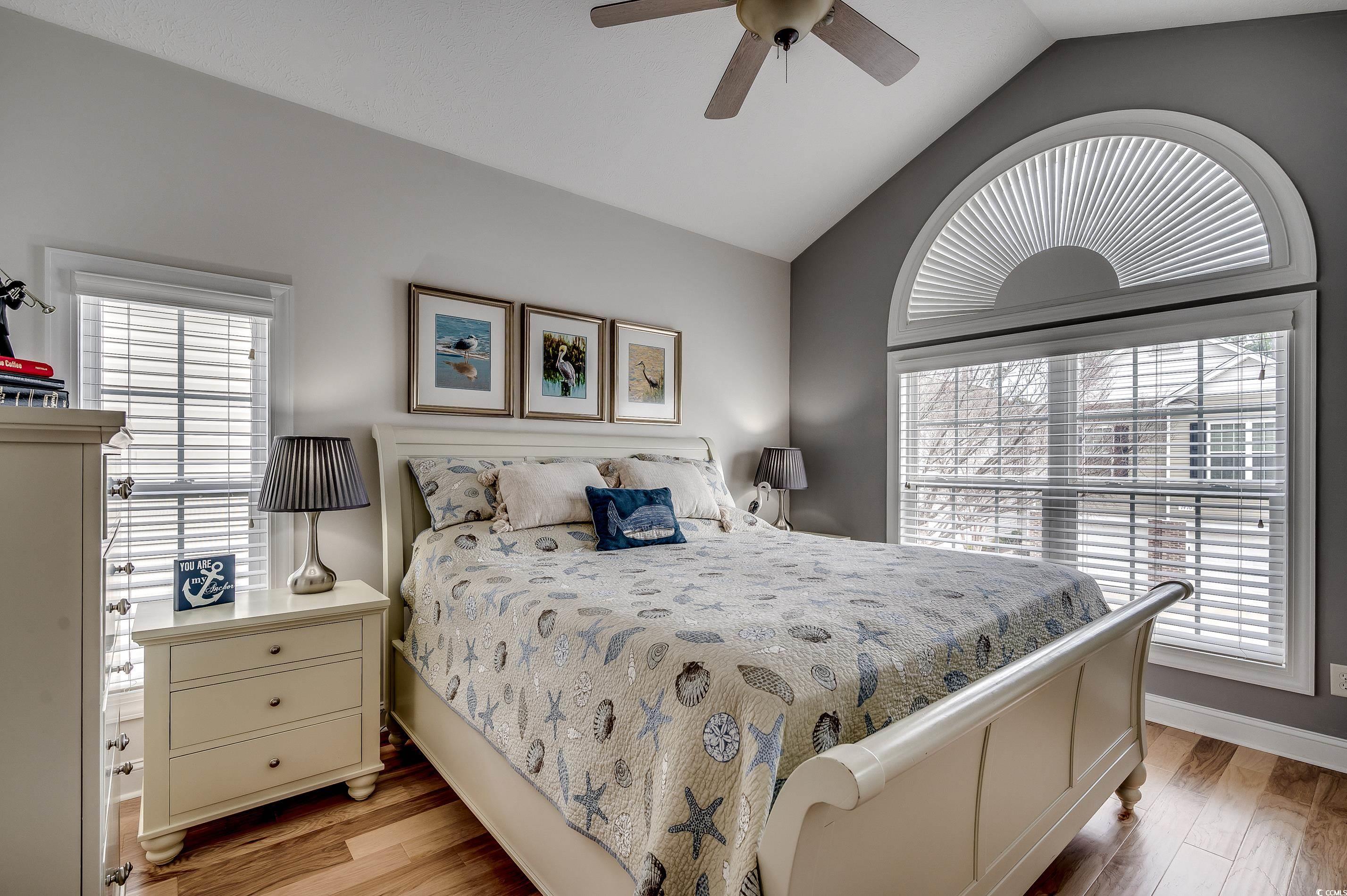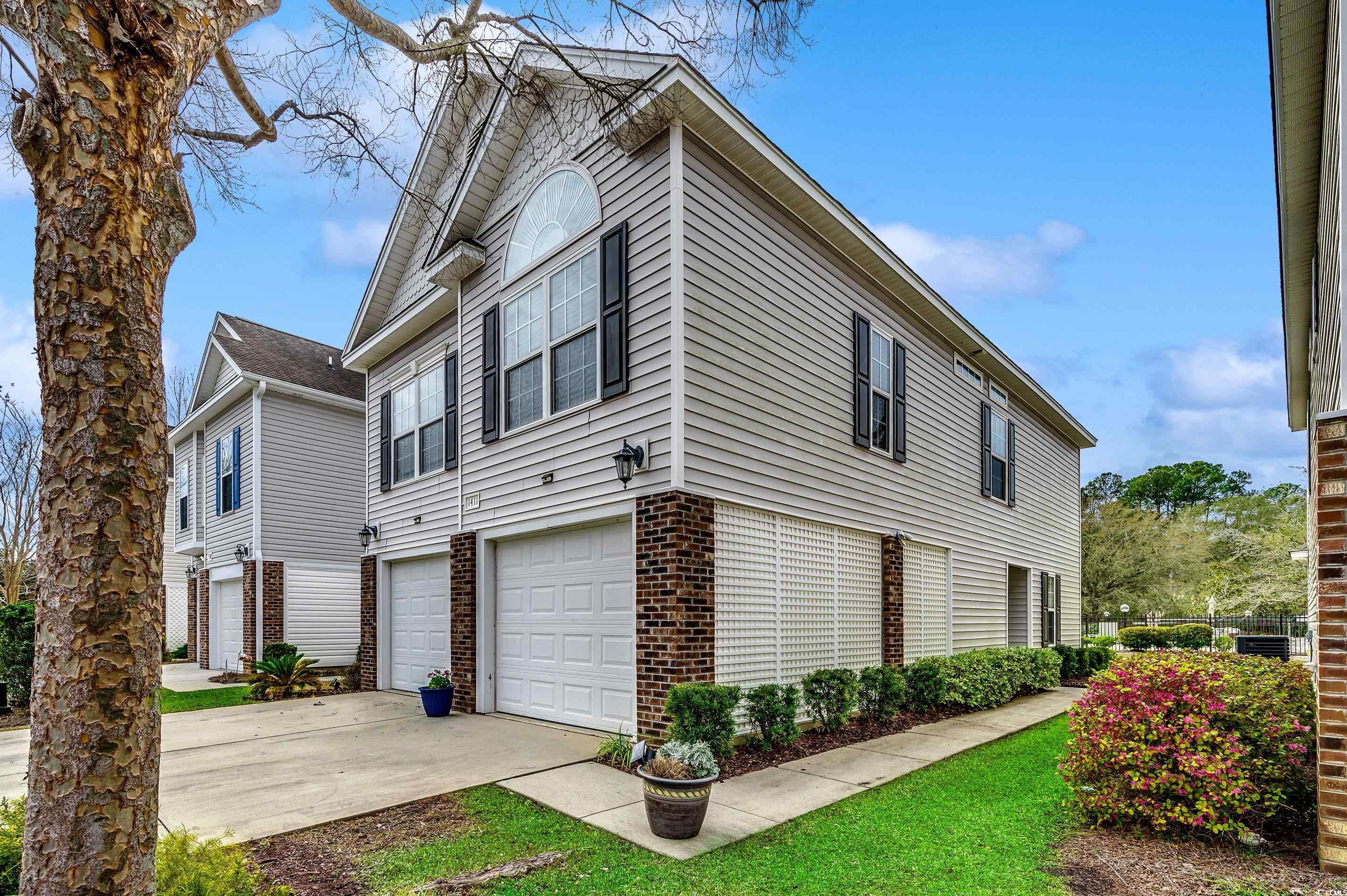 Welcome to Luxurious Living in Myrtle Beach -- The Cottages on Farrow Parkway, where modern amenities meet a prime location. Just a short walk to Market Common, the Crabtree Memorial Gymnasium, Horry County Technical College, and The International Culinary Institute, this four-bedroom, three-bathroom raised-beach house offers an exemplary blend of convenience and comfort. And it gets better, it is only a golf cart ride to the beach and the Myrtle Beach State Park. Upon entry at the ground level, you'll be greeted by two bedrooms and a full bathroom, thoughtfully designed for both utility and versatility. One of these rooms features a sliding glass door that opens to a covered patio, which could make a fantastic home office with direct outdoor access. Enjoy the ease of accessing the large grassy area—ideal for relaxation—and a swift path to the neighborhood swimming pool. Additionally, there's a spacious two-car garage with a large storage room, providing ample space for your belongings. Venture upstairs to find an open-concept living area brimming with natural light. The large gathering room boasts a cathedral ceiling, enhanced by a strategically-placed ceiling fan. This space seamlessly flows into the adjacent dining and kitchen areas, making it perfect for entertaining or cozy family gatherings. Step out onto the screened-in covered balcony with a ceiling fan, where you can enjoy the area all day long while overlooking the pool. The kitchen is a chef's delight, fitted with 42" cabinets, stainless steel appliances, and solid surface countertops. The kitchen features both over and under cabinet lighting. A breakfast bar and pantry provide additional convenience, ensuring everything you need is within reach. Down the hall, discover two additional bedrooms, including a primary suite that's both spacious and inviting. The primary bedroom features a vaulted ceiling, a ceiling fan, and a generous walk-in closet. The ensuite bathroom adds a touch of luxury with a transom window over the walk-in shower, enhancing the room’s natural light and atmosphere. The other bathroom offers a tub/shower combination with transom window, too. This smaller neighborhood offers a unique blend of tranquility and activity. Living here, you're not only close to Market Common—known for its dining and shopping opportunities—but also able to quickly reach the beautiful beaches of Myrtle Beach by golf cart. This location encourages a lifestyle of leisure and enjoyment as you explore the local amenities.