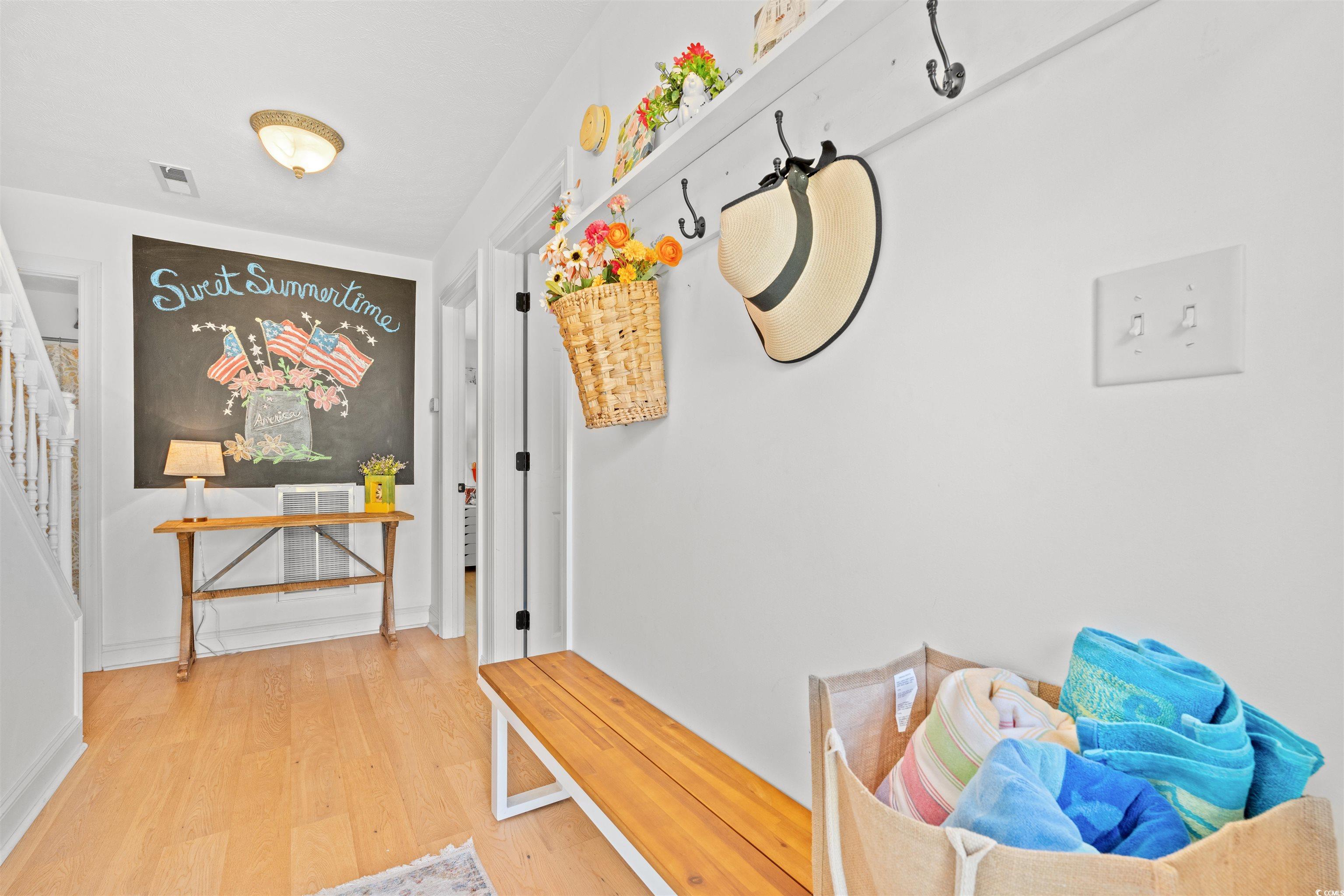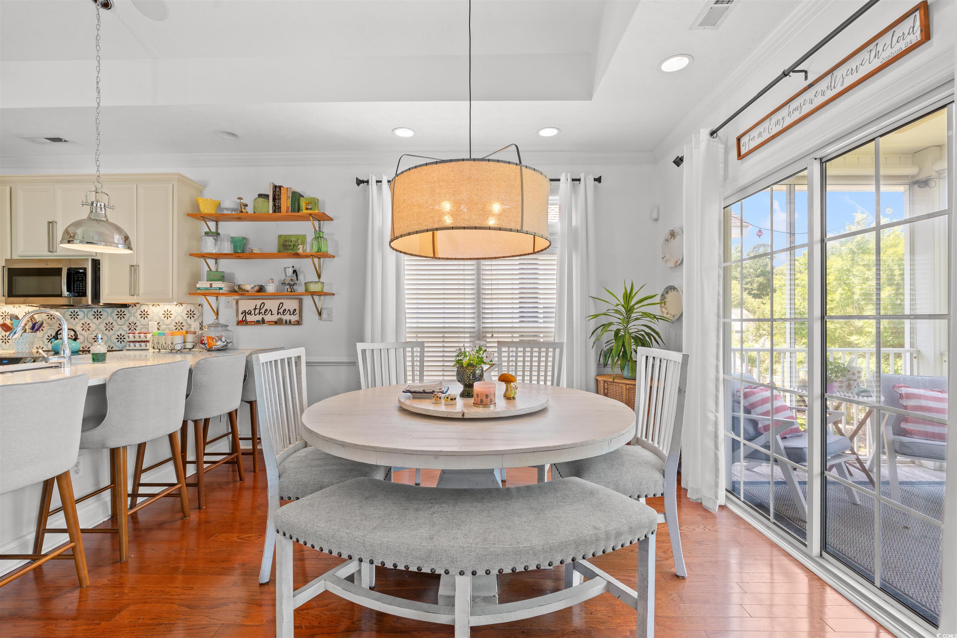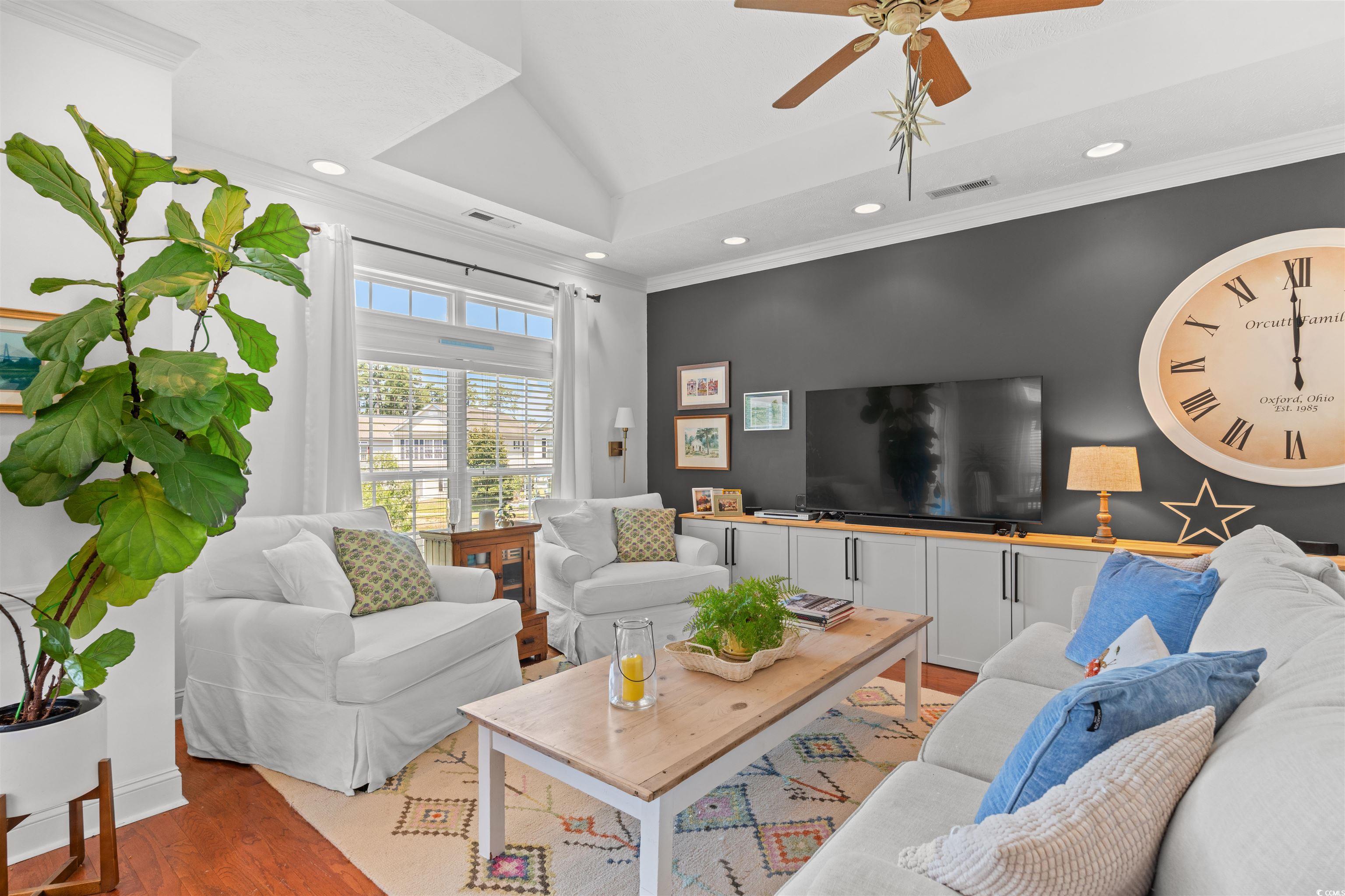 Welcome to your serene escape in the heart of Market Common - where charm, comfort, and convenience converge. This 4 bedroom, 3 bath home offers pond and pool views along with thoughtful details that make everyday living feel like a retreat. The inviting first floor entrance welcomes you to 2 bedrooms, a full bath and a laundry area for added ease. A private patio off one of the bedrooms is the perfect spot for morning coffee or evening unwinding. Wood flooring runs through the main living areas and staircase, creating a warm and cohesive aesthetic. Upstairs, light pours into an open-concept living space that seamlessly flows to a covered porch overlooking peaceful water views. The kitchen features stainless steel appliances, stylish backsplash, and plenty of space of casual meals. The primary suite offers an escape with a beautifully decorated full bath and a walk-in closet, while an additional bedroom and full bath provide flexibility for guests or a home office. This home includes a 2-car garage, carpeted bedrooms for added comfort, the HVAC unit for the upstairs was replaced in 2020, new toilets installed in all three bathrooms along with new faucets in July 2025. Located just minutes from shopping, top dining spots, and the beach, it offers a lifestyle that's as vibrant as it is laid-back.