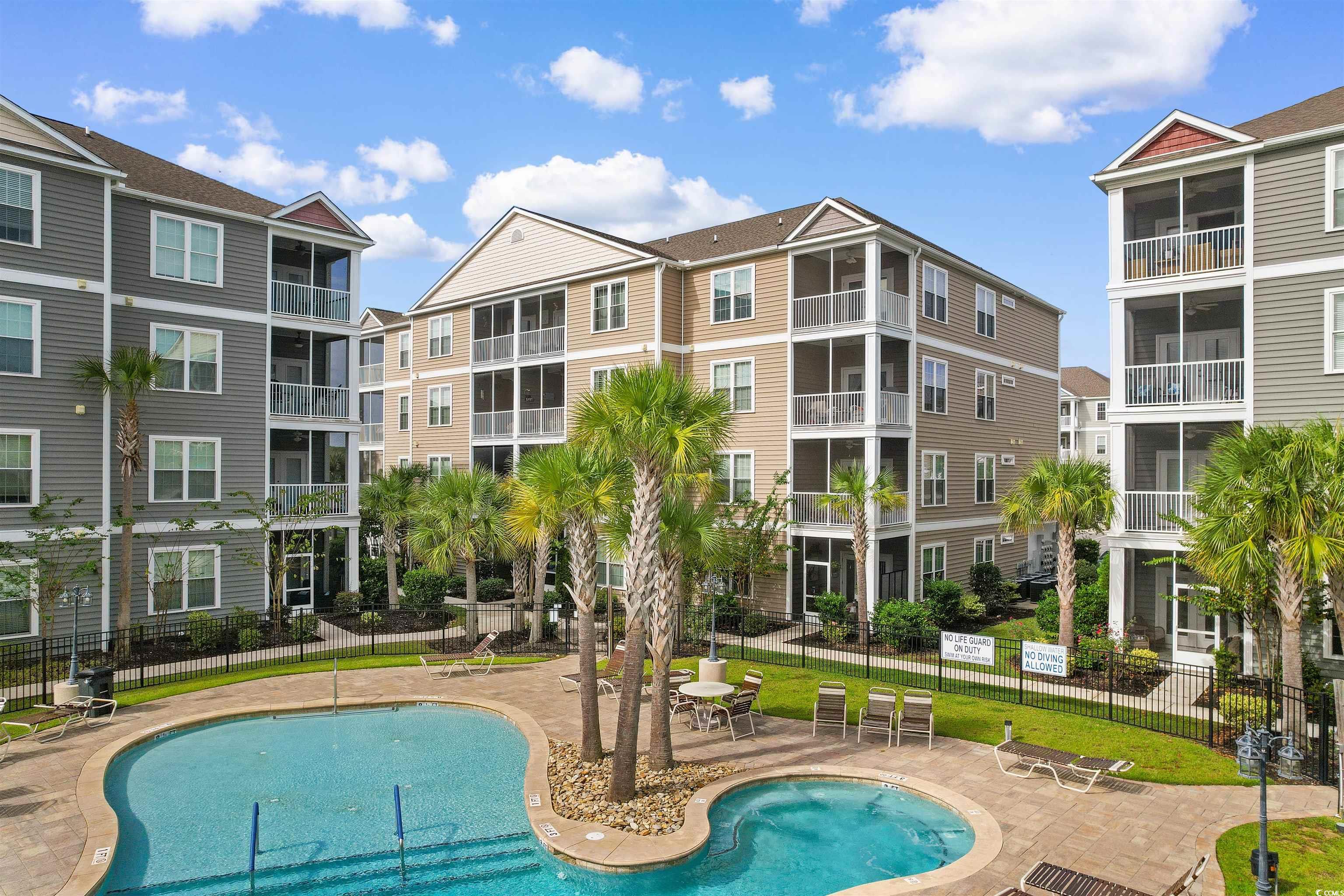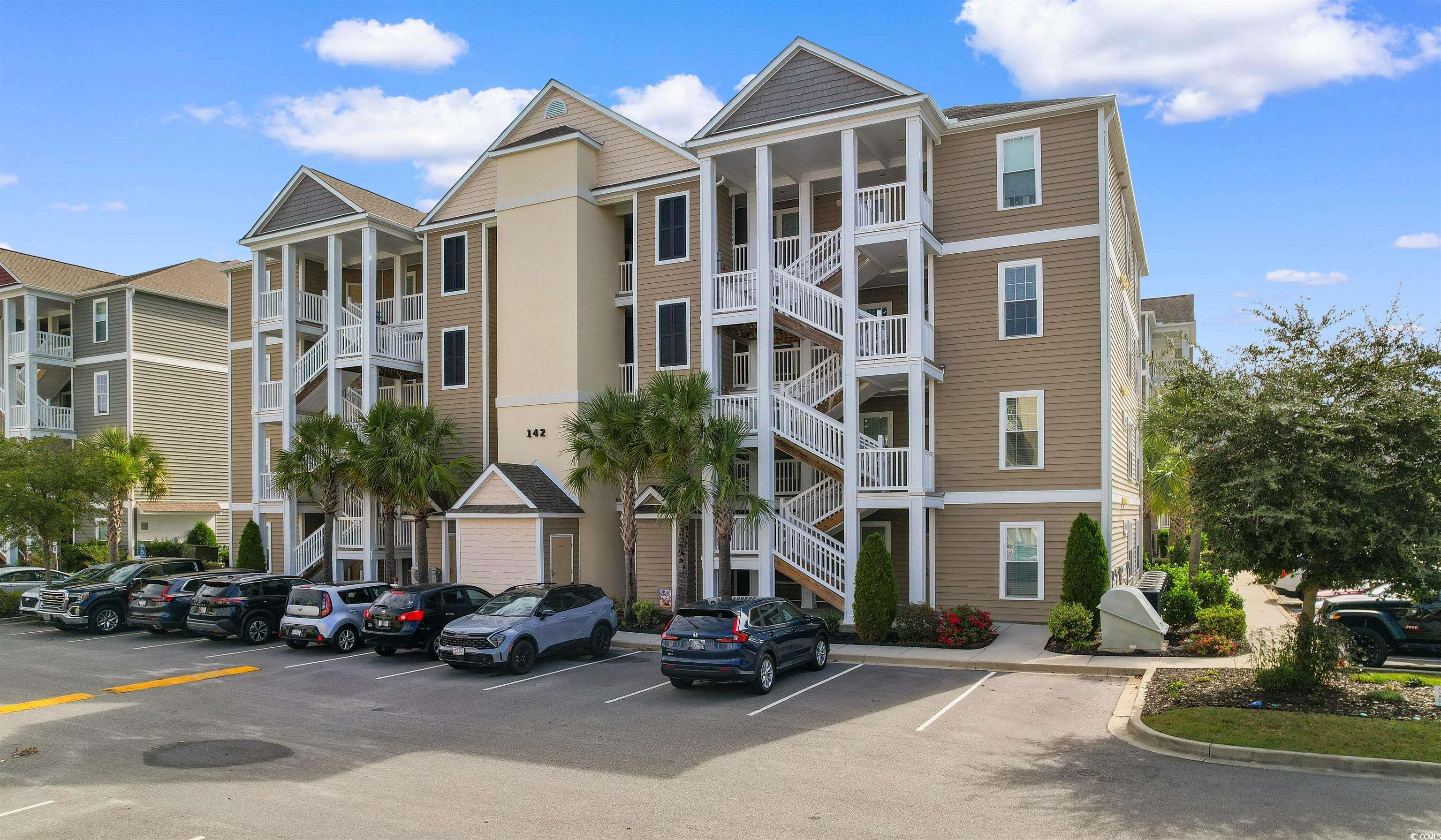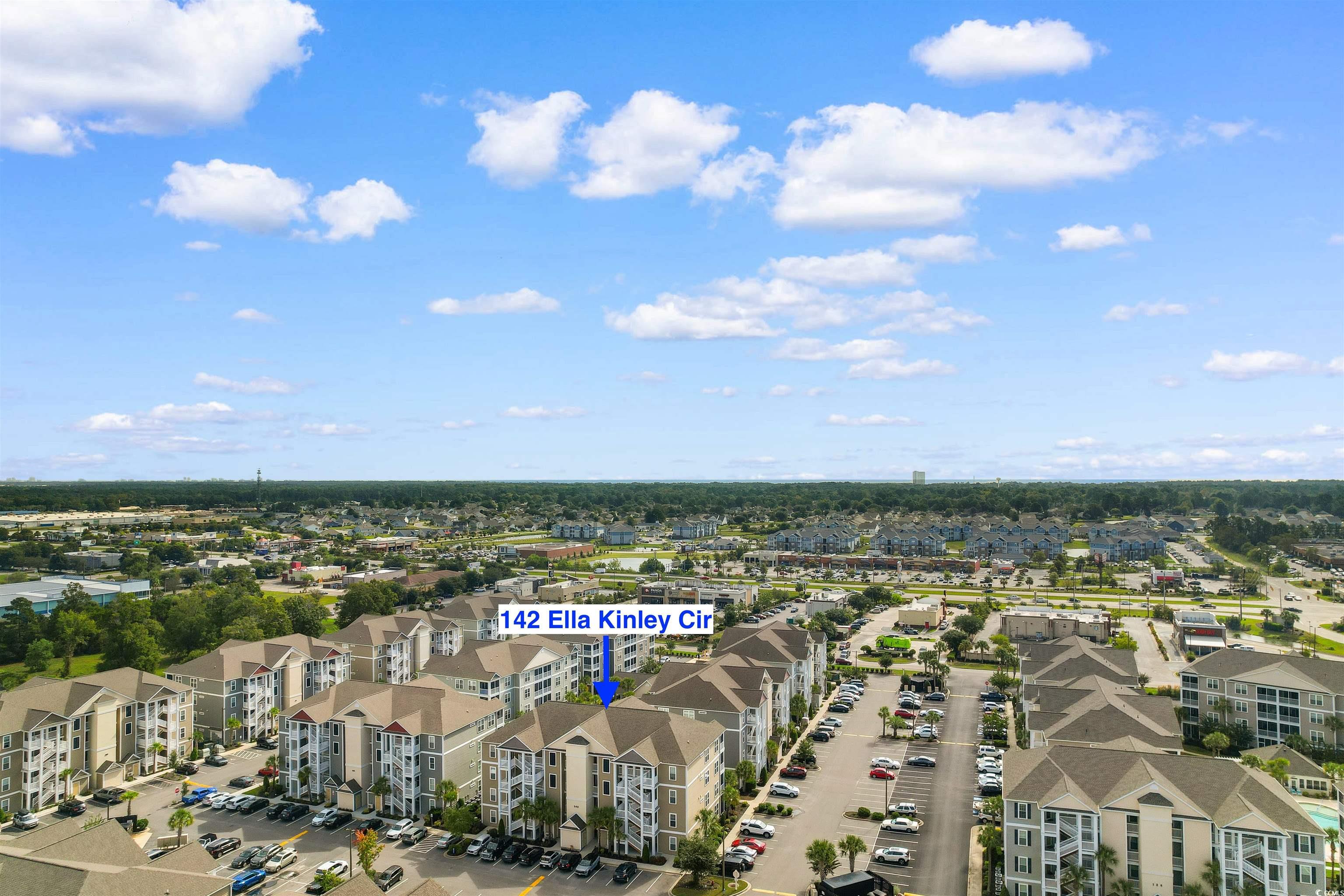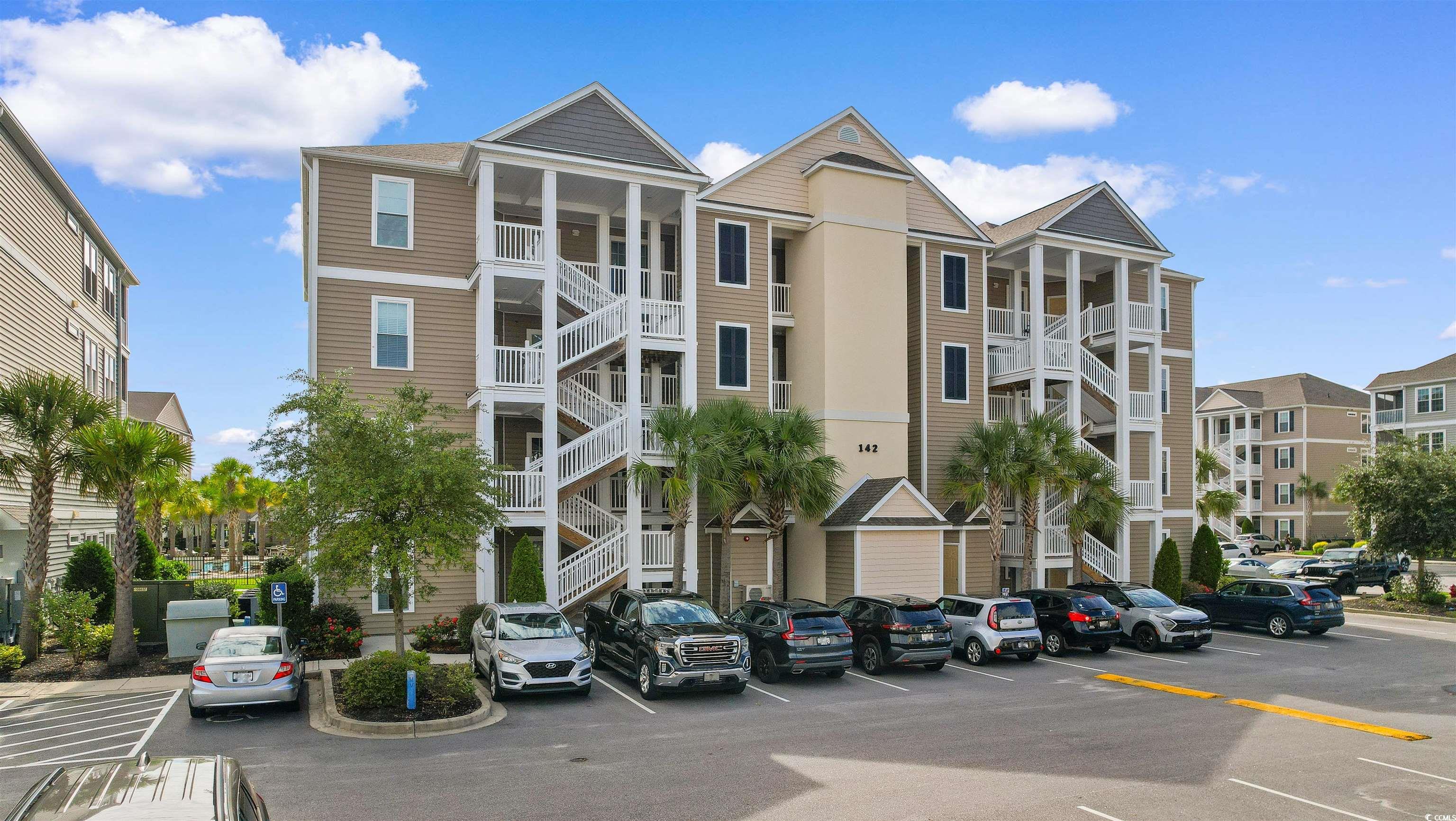 Welcome to 142 Ella Kinley Circle, Unit 403, a spacious 2-bedroom, 2-bathroom condo in the highly desirable Queens Harbour community. This top-floor residence features cathedral ceilings and a large great room with ceiling fans that offers plenty of space for both living and dining areas. The kitchen is well-appointed with granite countertops, soft-close cabinetry, extra cabinets for storage, and light, neutral finishes that keep the space feeling open and fresh. A dedicated laundry room adds everyday convenience. The owner’s suite includes two closets and an en-suite bath. From both the great room and the owner’s suite, you can step onto the screened-in DOUBLE balcony with peaceful views of the pool, the perfect spot to relax and enjoy the coastal breeze. Enjoy the added convenience of a first-floor storage room, providing a convenient place for seasonal items and everyday extras, so you don’t have to bring them upstairs. The building also features an ELEVATOR, making access to this fourth-floor home a breeze. Residents enjoy the community pool and cabana area, adding to the easy, low-maintenance lifestyle. The home’s neutral palette throughout makes it truly move-in ready, offering a versatile backdrop for any style. Ideally located near Surfside Beach, Market Common, shopping, dining, the airport, and the hospital, this property combines comfort, convenience, and coastal living in one perfect package.