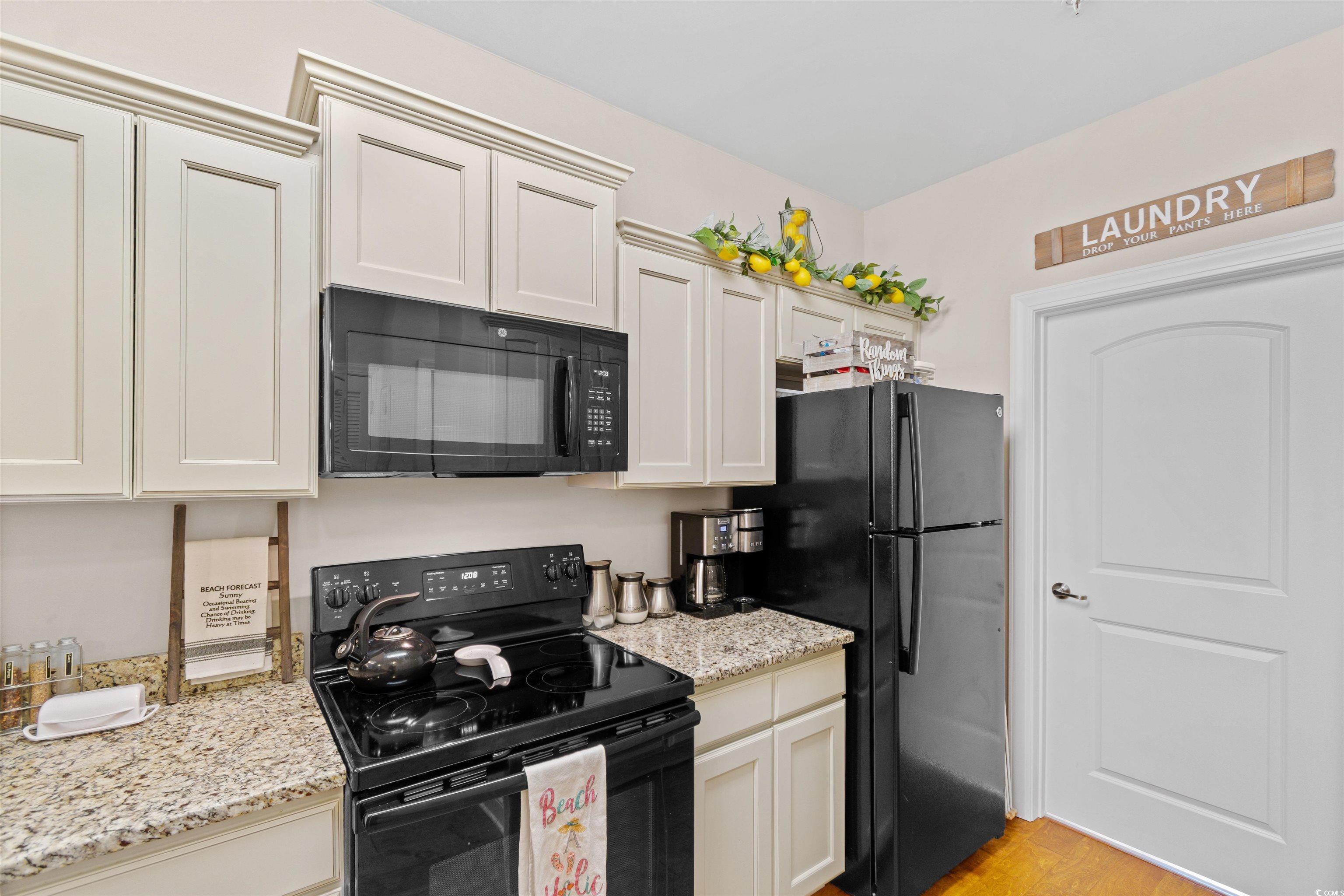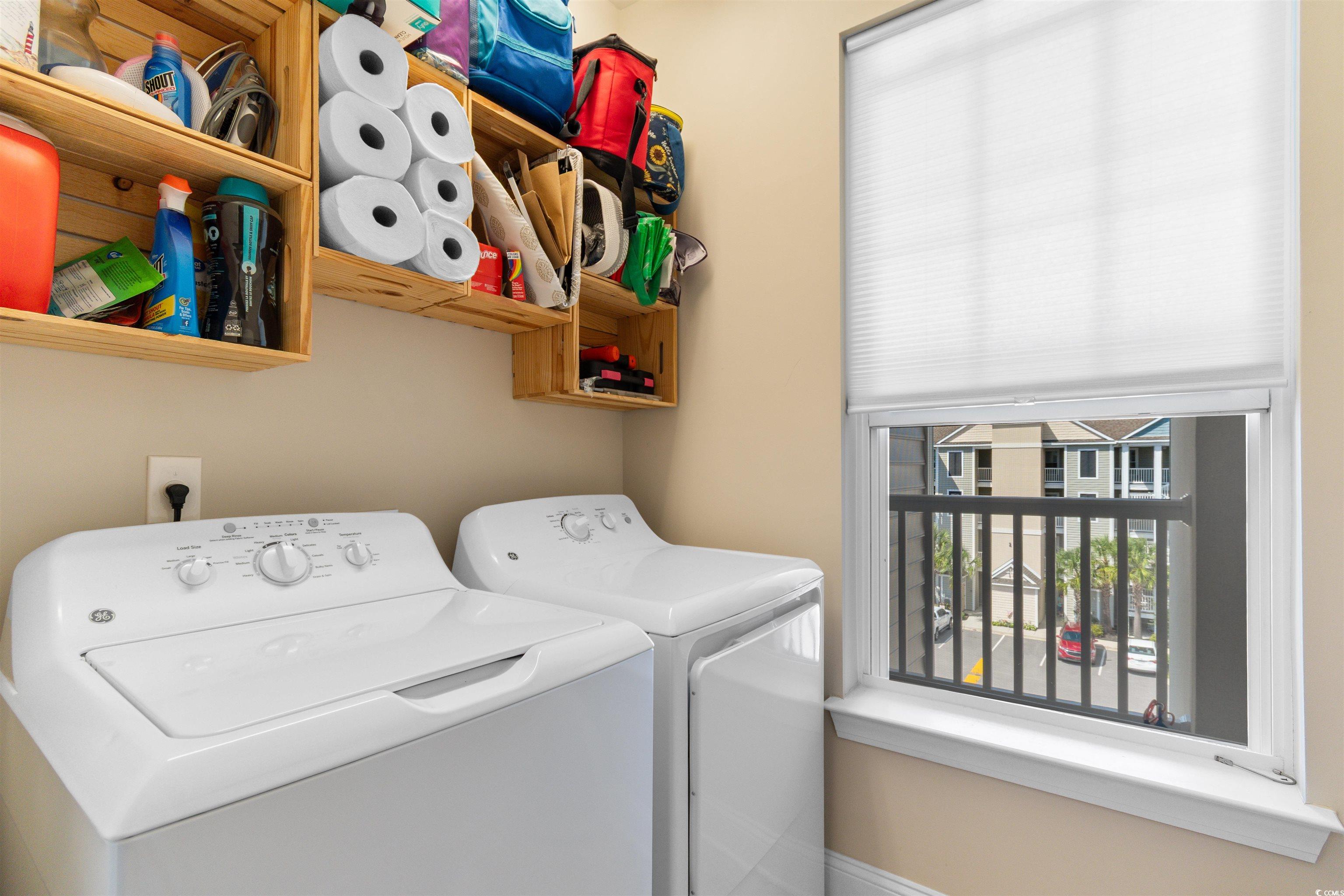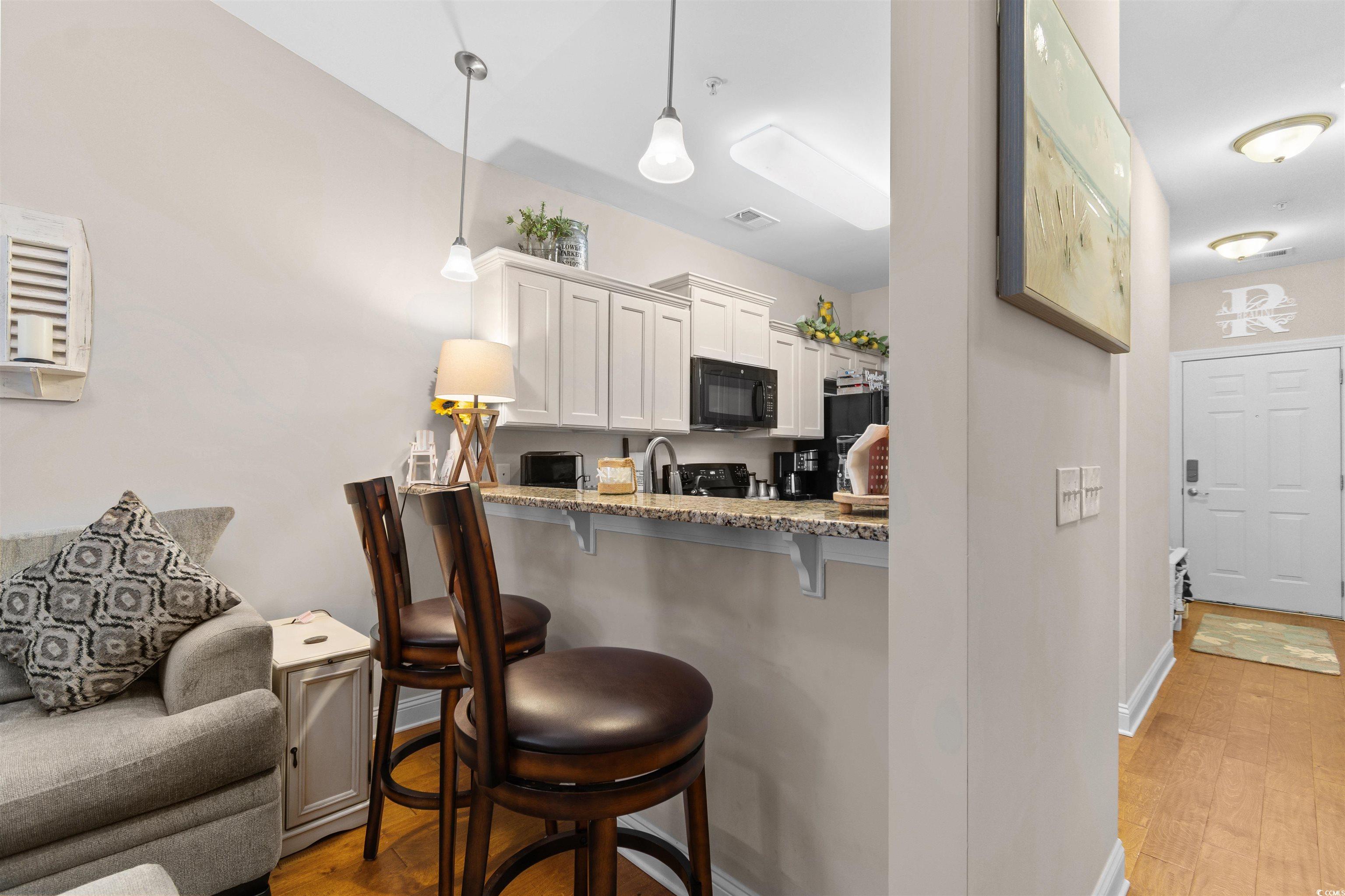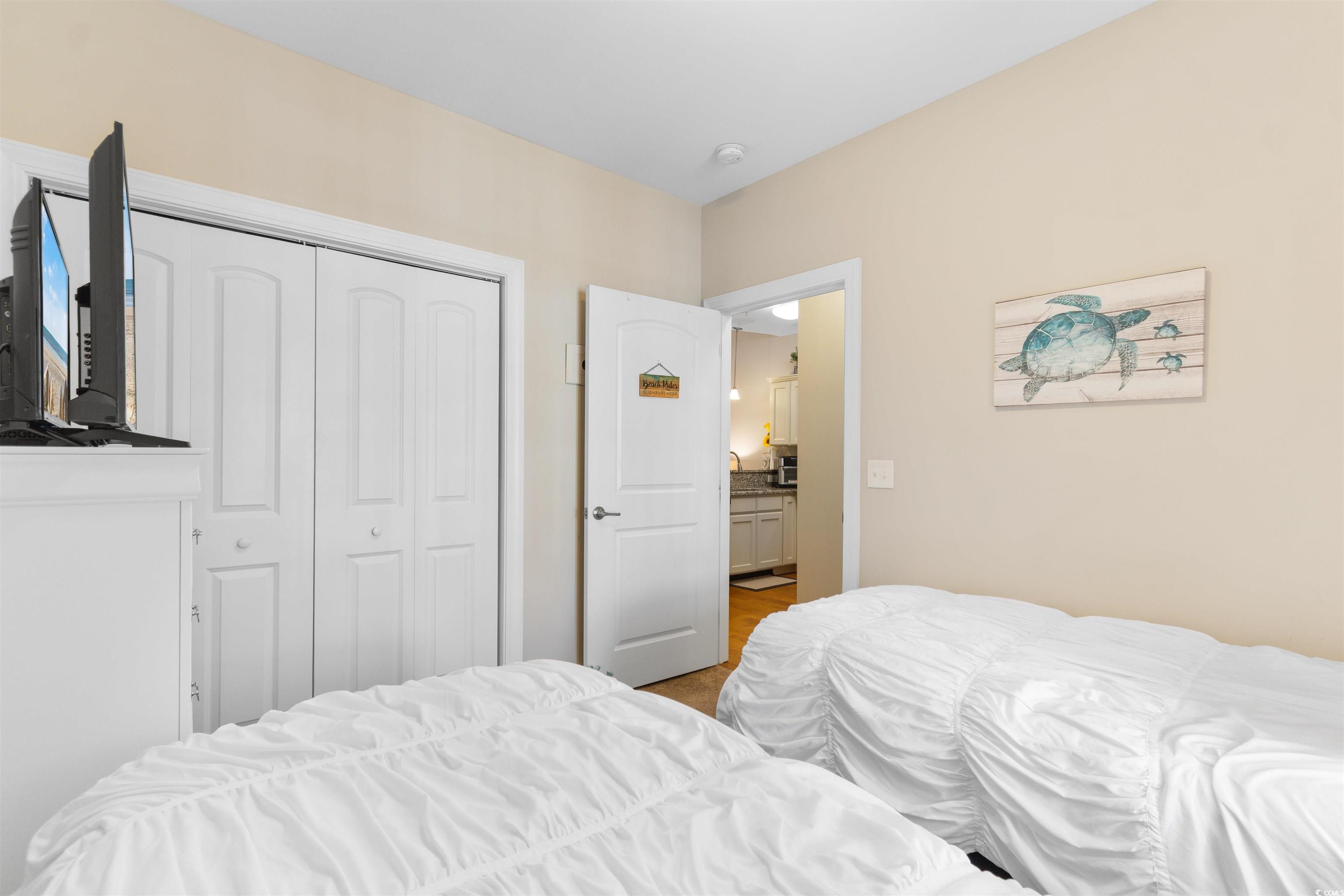 Welcome to 142 Ella Kinley Circle, Unit 403, a spacious 2-bedroom, 2-bathroom condo in the highly desirable Queens Harbour community. This top-floor residence features cathedral ceilings and a large great room with ceiling fans that offers plenty of space for both living and dining areas. The kitchen is well-appointed with granite countertops, soft-close cabinetry, extra cabinets for storage, and light, neutral finishes that keep the space feeling open and fresh. A dedicated laundry room adds everyday convenience. The owner’s suite includes two closets and an en-suite bath. From both the great room and the owner’s suite, you can step onto the screened-in DOUBLE balcony with peaceful views of the pool, the perfect spot to relax and enjoy the coastal breeze. Enjoy the added convenience of a first-floor storage room, providing a convenient place for seasonal items and everyday extras, so you don’t have to bring them upstairs. The building also features an ELEVATOR, making access to this fourth-floor home a breeze. Residents enjoy the community pool and cabana area, adding to the easy, low-maintenance lifestyle. The home’s neutral palette throughout makes it truly move-in ready, offering a versatile backdrop for any style. Ideally located near Surfside Beach, Market Common, shopping, dining, the airport, and the hospital, this property combines comfort, convenience, and coastal living in one perfect package.
