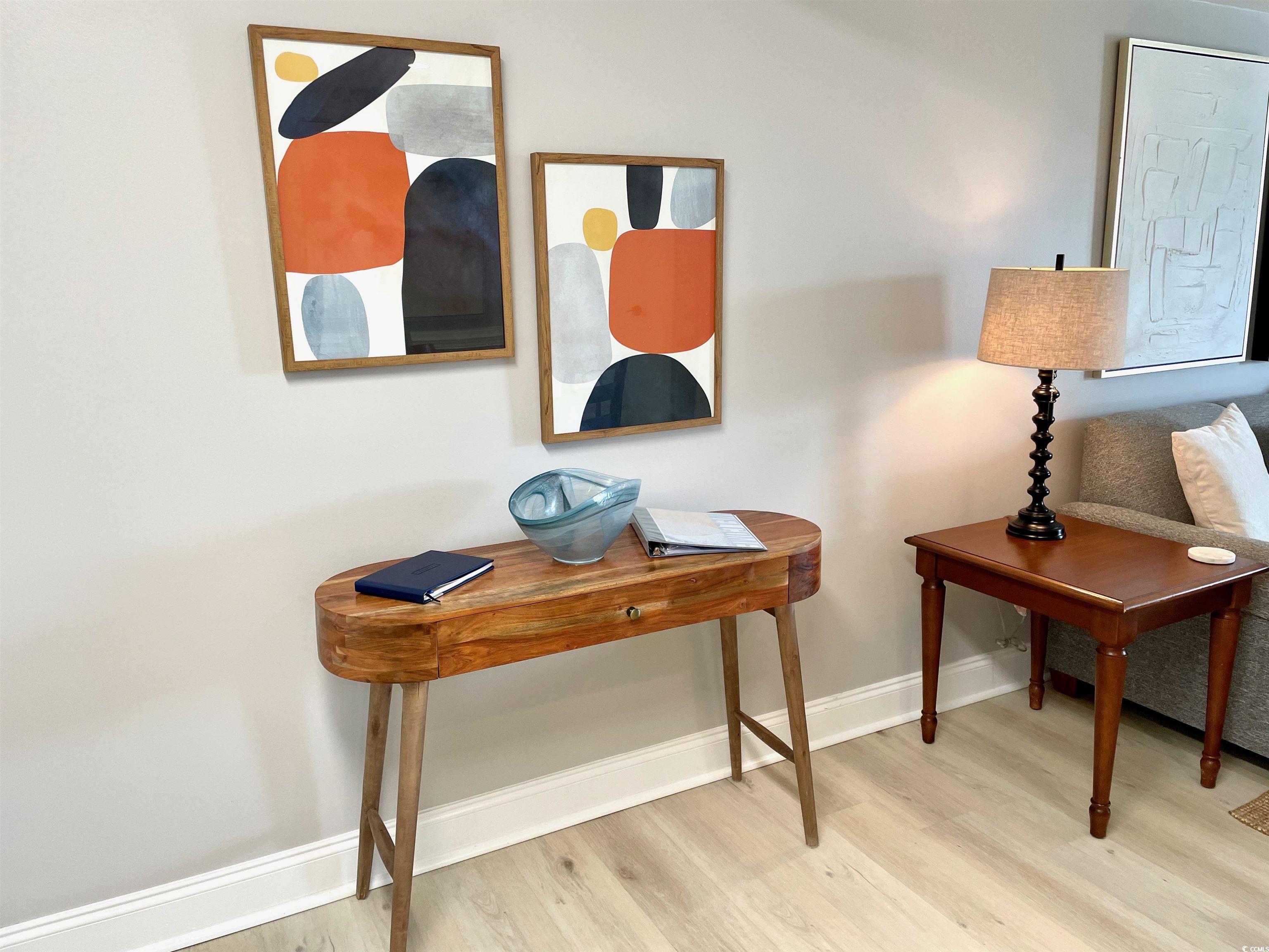 A modern, sophisticated beach villa located in the heart of the Premier Litchfield by the Sea Resort community. Amenities include pool with lazy river, bike/walking paths, fishing lake, crabbing dock, tennis/pickleball courts, and ocean front clubhouse. Convenient to shopping, dining, several golf courses and a marina. Nearby are famous Brookgreen Gardens and Hob Caw Barony. Myrtle Beach is 45 minutes to the north and the historical city of Charleston is 90 minutes south. The casual comfortable interior design is welcoming in mint condition with blonde LVT flooring throughout and beautiful furnishings including tasteful art. Attention to the best of every detail is evident from start to finish. Enjoy your open balcony overlooking the pool, distant woods and breezy ocean air offering the tranquility of an outdoor retreat to wile away with all day long relaxation from early morning sunrises to evening sunsets. Consider selecting this superior property to be your Litchfield Beach home today. Exterior building insurance is included in the monthly HOA fee.