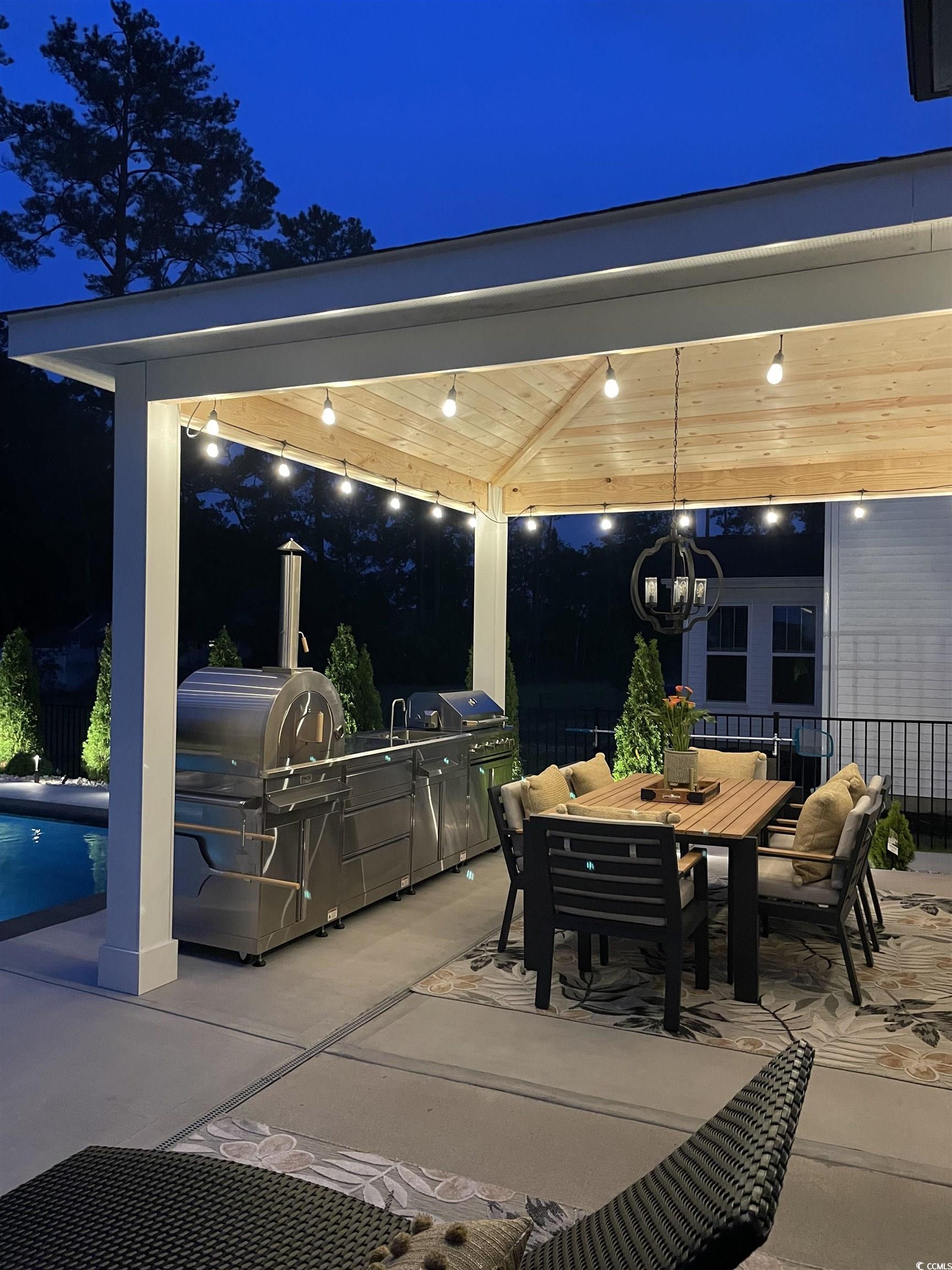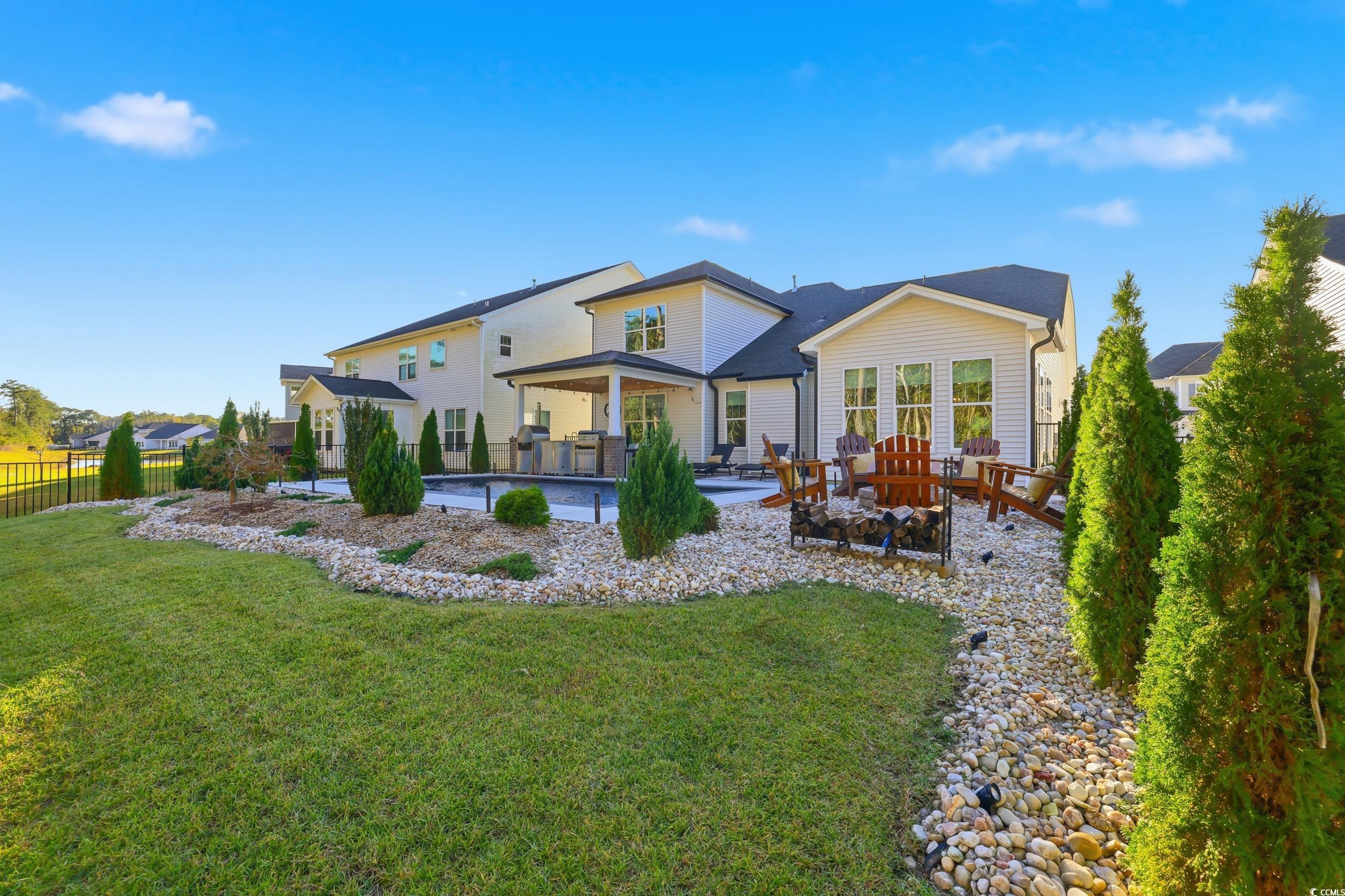 Enjoy your very own fenced in oasis bed scape which includes an inground pool, outdoor kitchen with grill and wood-fired pizza oven, a covered hangout space, firepit, and sprinkler system - perfect for relaxing or entertaining. Inside, you'll find thoughtful upgrades throughout, including custom window treatments and a climate-controlled garage with work benches and built-in storage. Plus, the community offers a pool, tennis court, and clubhouse. So many extras make this one a must-see.