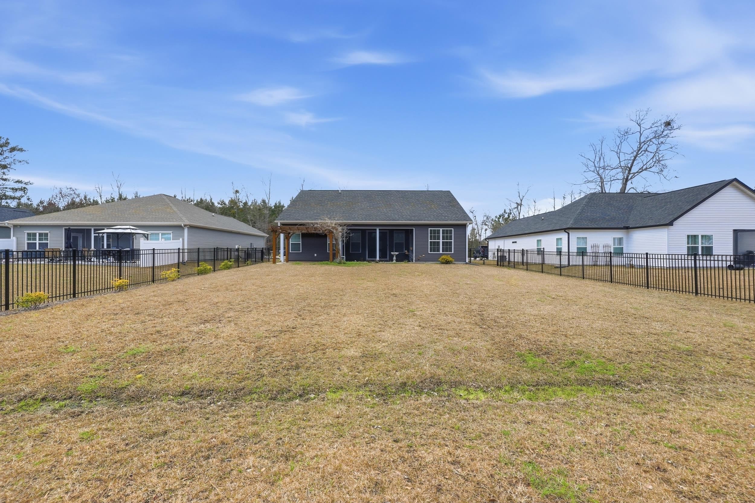 Welcome home to this beautiful 3-bedroom, 2-bath property sitting on a spacious .45-acre lot with NO HOA! Built in 2023, this home has already been enhanced with thoughtful upgrades including gutters, fencing, a backyard pergola, and a storage shed - making it move-in ready and even better than new. Inside, you’ll find durable LVP flooring throughout (no carpet) and upgraded ceiling fans, including in the relaxing screened porch. The open-concept layout is perfect for everyday living and entertaining, highlighted by an elegant foyer with wainscoting, a spacious living room with soaring vaulted ceilings, and a floor-to-ceiling brick fireplace that creates a warm focal point. The living area flows seamlessly to the screened porch, giving you the perfect indoor-outdoor lifestyle.The kitchen is designed to impress, featuring stainless steel appliances, granite countertops, tile backsplash, crown molding, recessed lighting, a large work island with breakfast bar, ample cabinet space, and a pantry. A cozy breakfast nook provides easy access to the rear porch for morning coffee or evening meals outside.The private primary suite offers a relaxing retreat with a tray ceiling accented by double crown molding, a walk-in closet with custom shelving, and a spacious ensuite bath with a double vanity and tiled shower with built-in seating. A split-bedroom floor plan provides additional privacy, with two generously sized guest bedrooms—each with walk-in closets—that share a full bathroom with tub/shower combination. Additional features include a separate laundry room, conveniently located near the primary suite. Step outside and enjoy the extended screened porch, large patio with pergola, and expansive fenced backyard that backs up to a wooded area—perfect for relaxing, entertaining, or letting kids and pets play. There’s also a storage shed for tools or lawn equipment. Both the garage and porch floors have been finished with durable epoxy coating. Conveniently located less than a mile from Highway 90 and just minutes from historic downtown Conway, you’ll have easy access to local dining, shopping, the scenic Riverwalk, golf courses, and fishing. Plus, the beaches and attractions of the Grand Strand are just a short drive away. This home offers the perfect combination of modern comfort, outdoor space, and a fantastic location—schedule your private showing today!