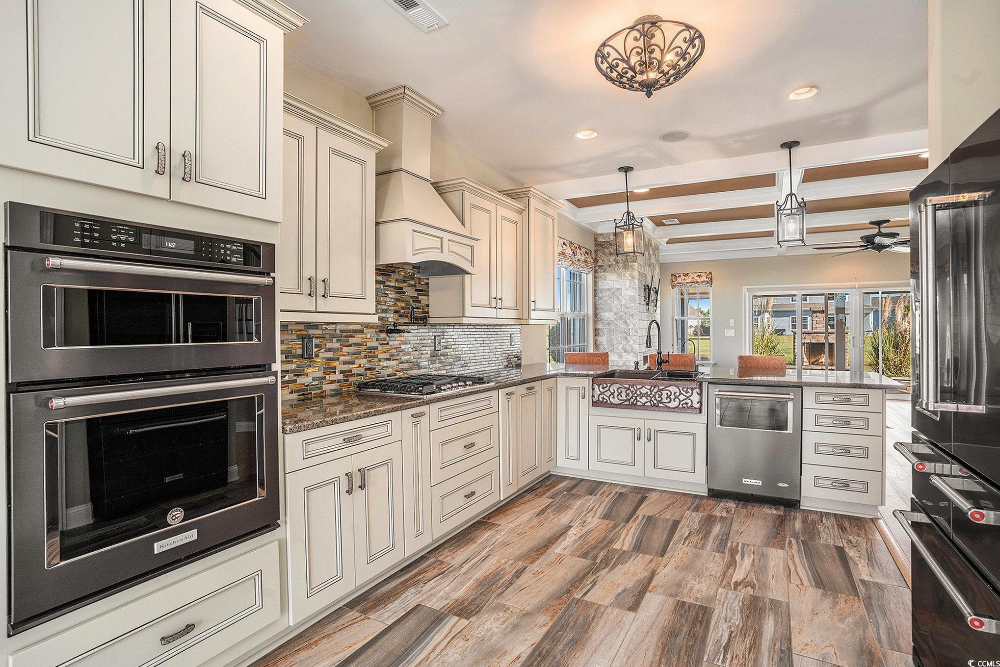 This one-of-a-kind Edisto model showcases exquisite designer finishes and exceptional craftsmanship — perfect for buyers who value luxury and attention to detail. Enjoy peaceful lake views from the large screened porch with an outdoor fireplace, where you can watch the sunrise in the morning and relax in the cool afternoon shade. Every room in this home offers stunning water views, making it feel like a private retreat. The beautiful gourmet kitchen features top of the line KitchenAid black stainless steel appliances, wood cabinets in canvas with a chocolate glaze, soft-close doors and drawers, spice pull-outs, roll-out trays, under-cabinet lighting, a hammered copper farmhouse sink, oil-rubbed bronze fixtures, custom pantry shelving and door, and a convenient pot filler. Elegant tile flooring and an outdoor grill patio complete this impressive space. The powder room includes a vessel sink, upgraded faucet, and soft-close vanity. In the great room, a painted coffered ceiling, tiled gas fireplace, Providence Manor/Baking Stone hardwood floors, and a 12-foot sliding glass door leading to the expansive screened porch create a dramatic first impression. The owner’s suite offers a tray ceiling with crown molding, plush carpet, a spacious walk-in closet, and a luxurious bath with a Polystone walk-in shower. Upstairs, Bedrooms 2 and 3 each have private vanities and share a Jack-and-Jill bath with a shower/tub combo and linen closet. Additional features include: cultured marble window sills, a whole-home water system, lawn irrigation system, mirrors, blinds and window treatments. Pre-wired for camera, sound and security system. Hurricane Shutters were installed by Mid Atlantic Storm Protection in 2023 to complete this custom home. Don't miss your opportunity to own a designer showcase in Belle Mer with water views from every room. Centrally located community close to shopping, dining, entertainment, public beach access, Market Common, Myrtle Beach International Airport, and several golf courses. Community amenities include a pool, clubhouse, and fitness room.