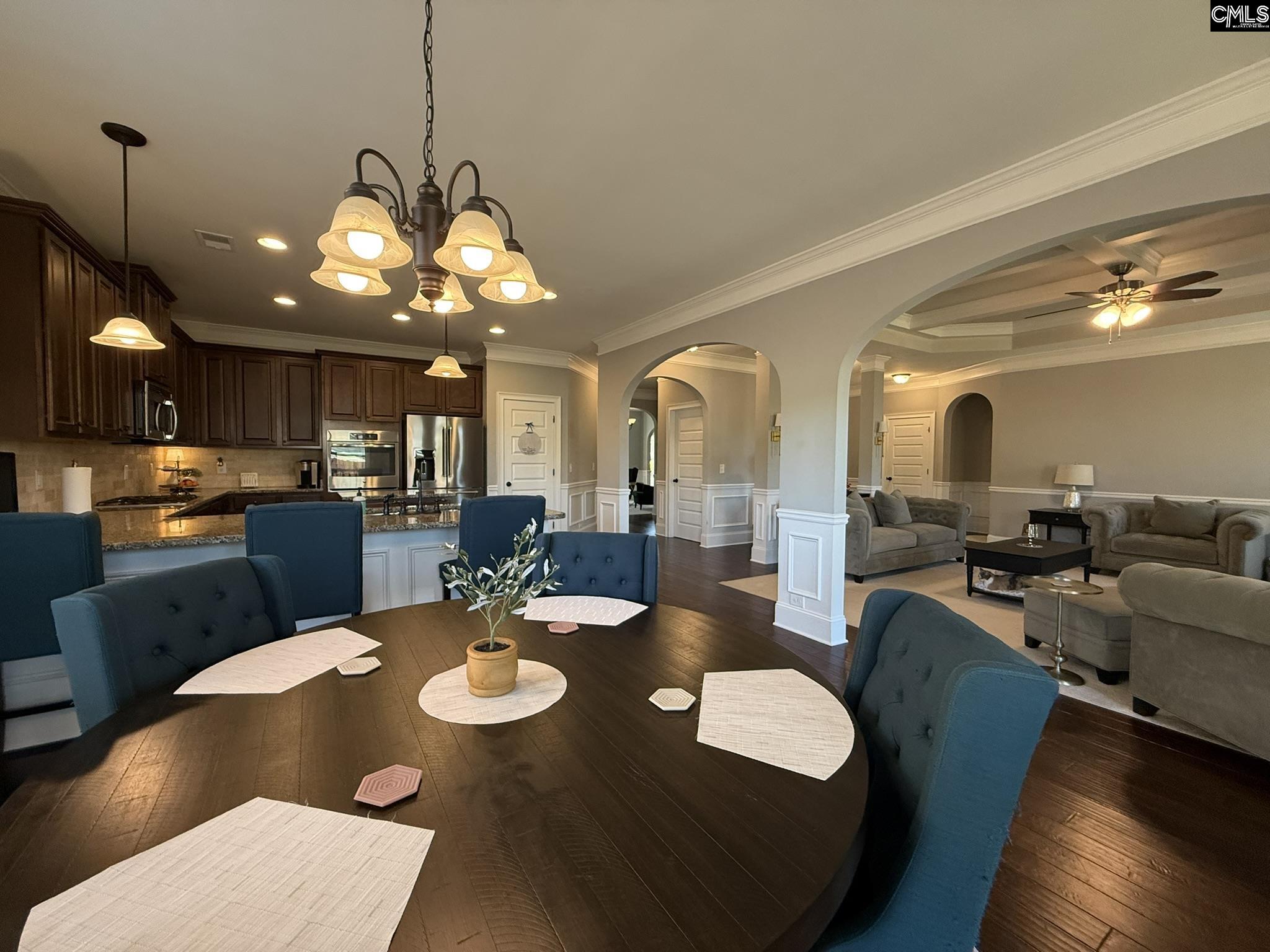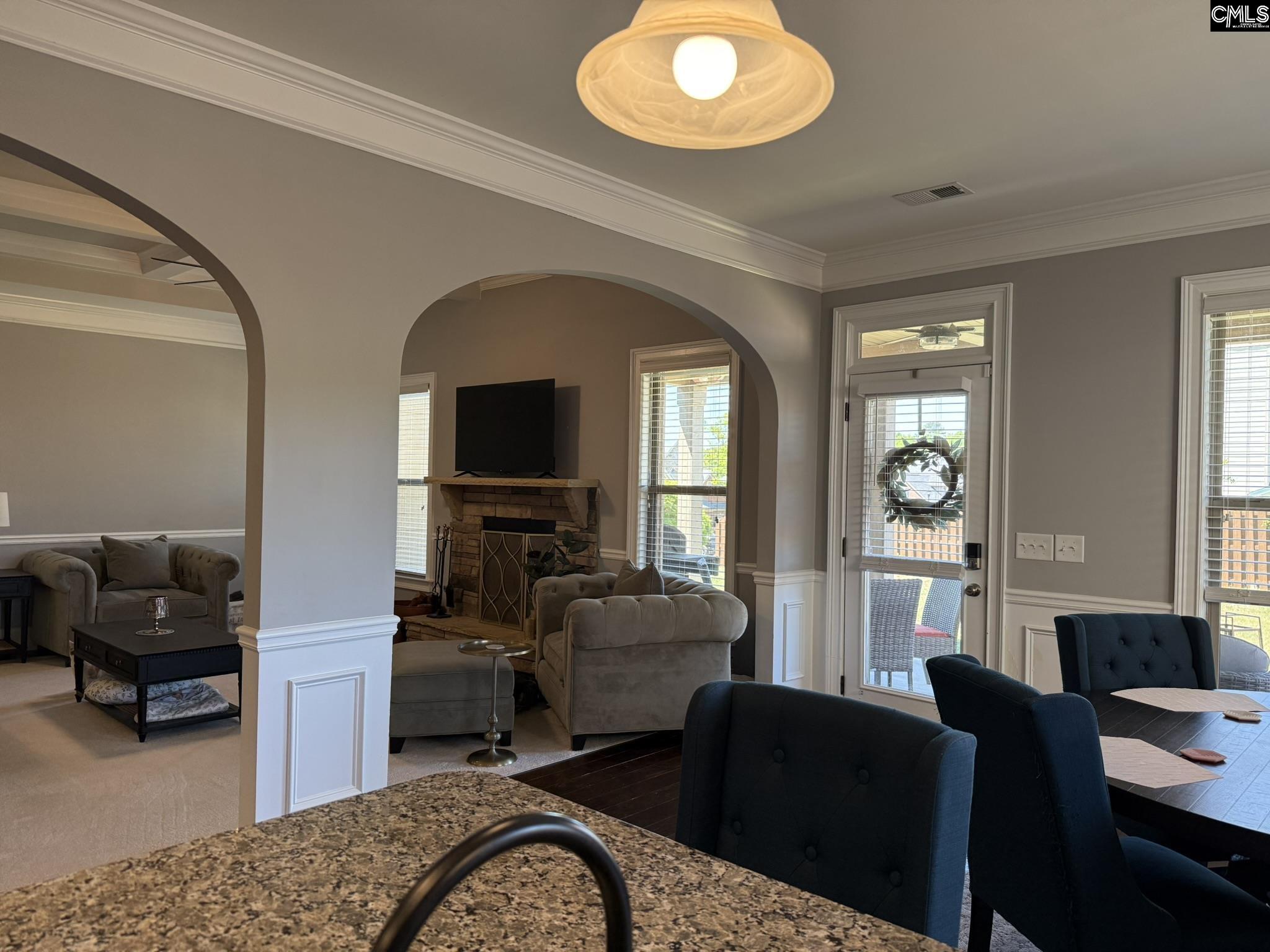 Lovely, well-maintained William II model in Phase I section of Springhill Lake development. Five generously-sized bedrooms--all with cathedral or vaulted ceilings and walk-in closets. Downstairs owner's suite with massive walk-in closet. Butler's pantry and spacious breakfast nook. Large windows throughout the home let in lots of natural light. Many windows are nearly floor-to-ceiling. Neutral walls throughout. Stone wood burning fireplace with gas starter. Beautiful architectural details throughout, including coffered ceilings, judges paneling, cathedral and vaulted ceilings, archways, and deep crown molding and baseboards. Almost all rooms have cathedral or vaulted ceilings. Hardwood floors throughout lower level (except owner's suite). Large upstairs media room. Indoor upstairs storage closet. Additional storage space off FROG. Spacious front porch and back patio. Back patio stays shaded during the height of the afternoon sun (until about sunset). Back patio allows you to look out at the neighborhood, but not be "on display." Back door has retractable screen door. Large spacious yard that is neat and tidy. Not too many beds or plantings to maintain. Nice level driveway leading to the two-car garage and level walkway leading to front door. Newer architectural mailbox. Neighborhood pool and fishing pond Disclaimer: CMLS has not reviewed and, therefore, does not endorse vendors who may appear in listings.