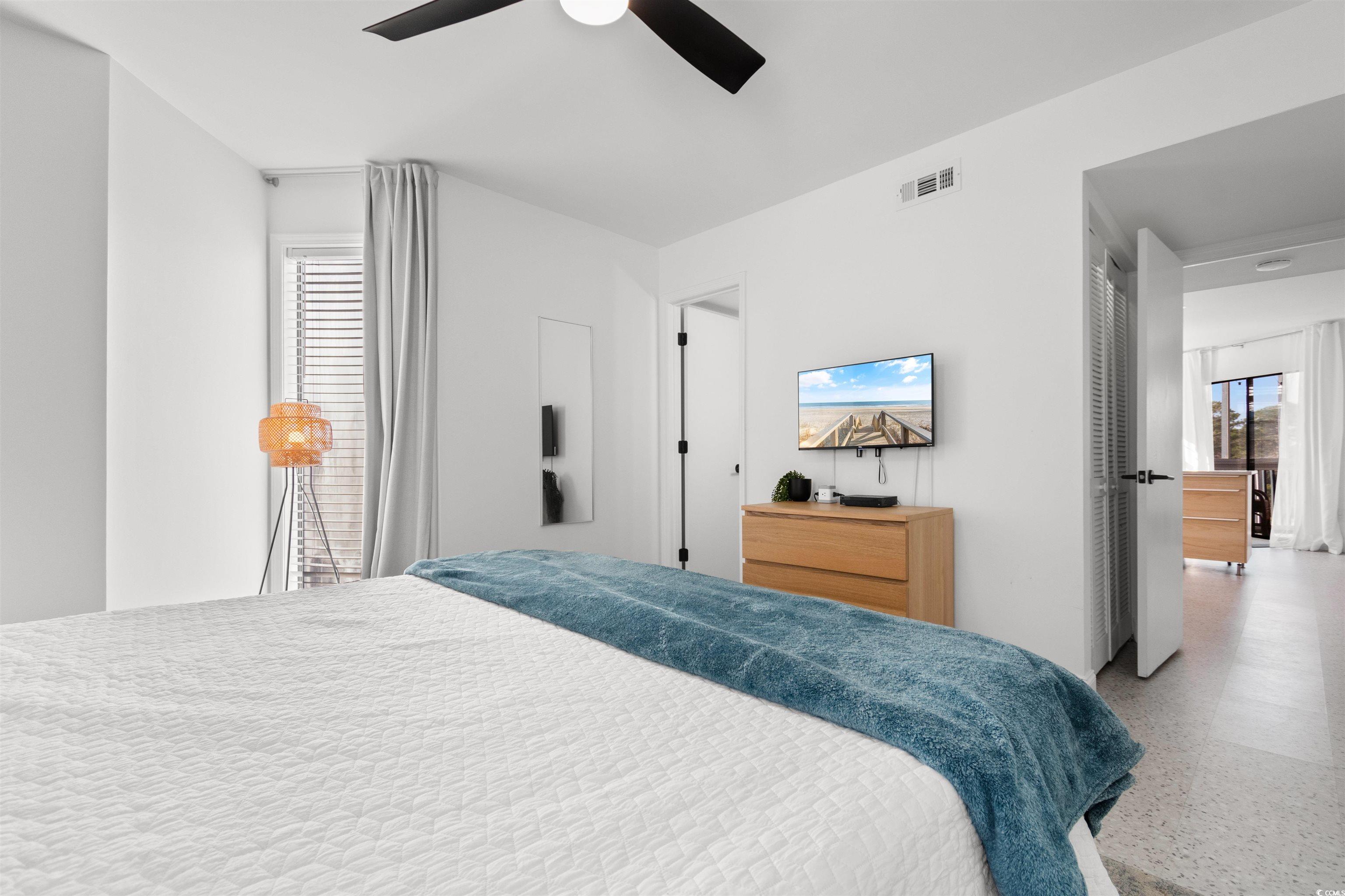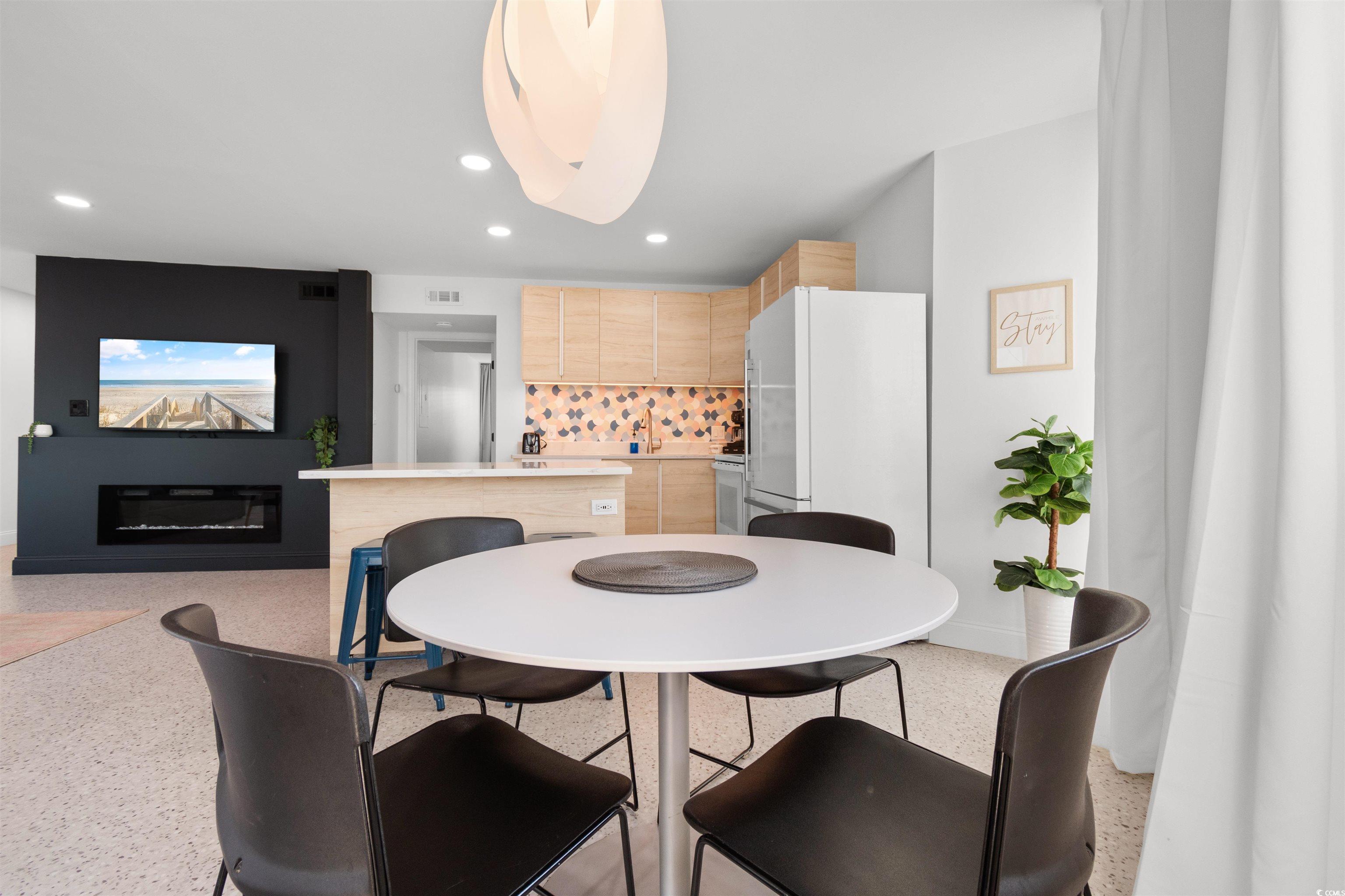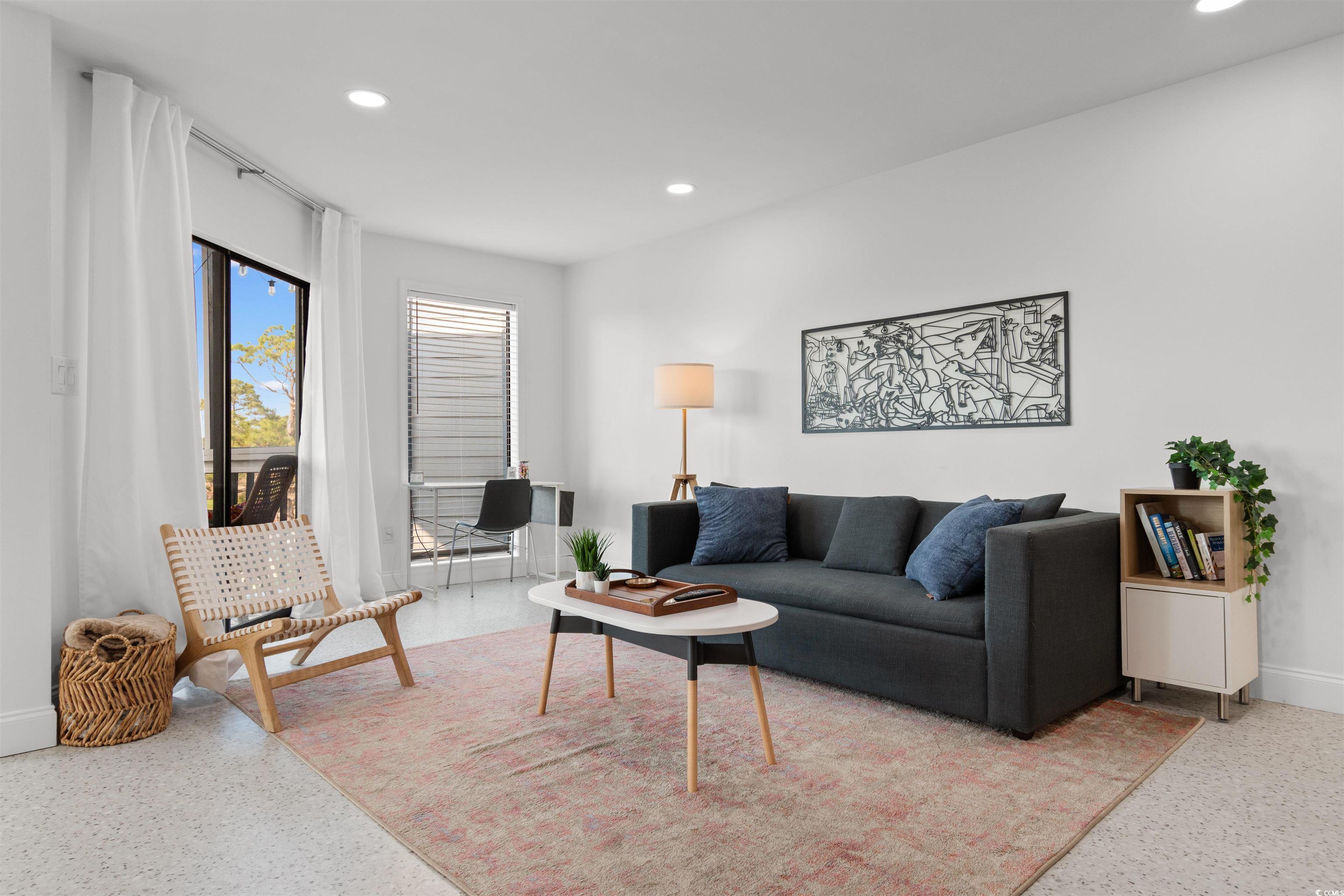 Just one mile from the beach, this fully renovated and beautifully furnished top-floor 2-bedroom, 2-bath condo offers easy coastal living in the heart of North Myrtle Beach. Located within city limits with golf carts allowed, and close to shopping, dining, entertainment, and the city recreation center, this move-in-ready home is ideal as a primary residence, second home, or investment property with short-term and long-term rentals allowed. The bright, open interior features uniform flooring throughout with no carpet or popcorn ceilings. The updated kitchen includes modern cabinetry, a stylish backsplash, and a functional island with seating and extra storage. The living and dining areas open to a screened-in porch through sliding glass doors, creating a seamless indoor-outdoor flow. The split-bedroom layout provides privacy, with a primary suite offering a walk-in shower and a comfortable guest bedroom near the second full bath. Additional features include an in-unit washer and dryer, covered parking, and access to a community pool. Thoughtfully renovated and fully furnished, this coastal condo is a turn-key opportunity just minutes from the beach.