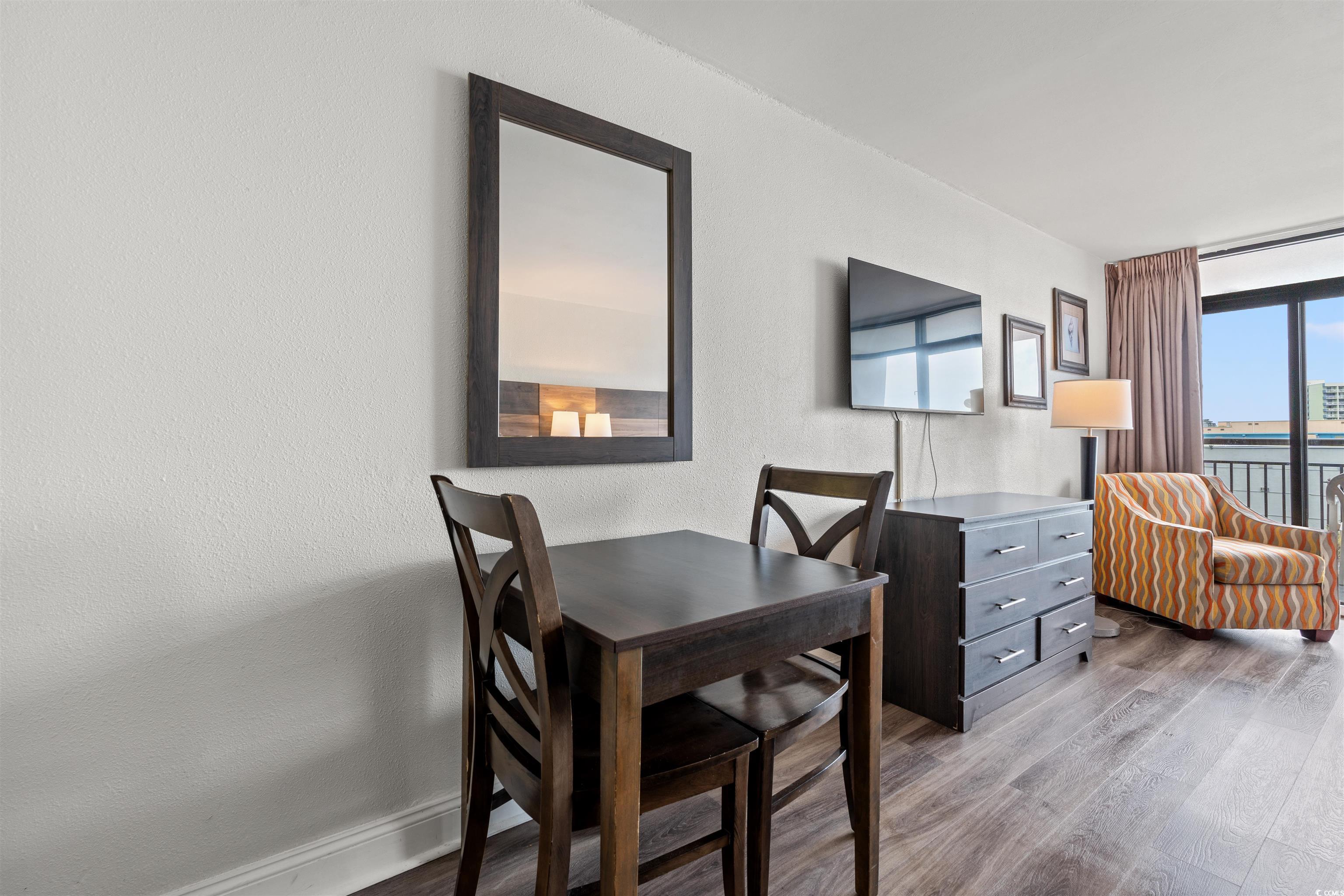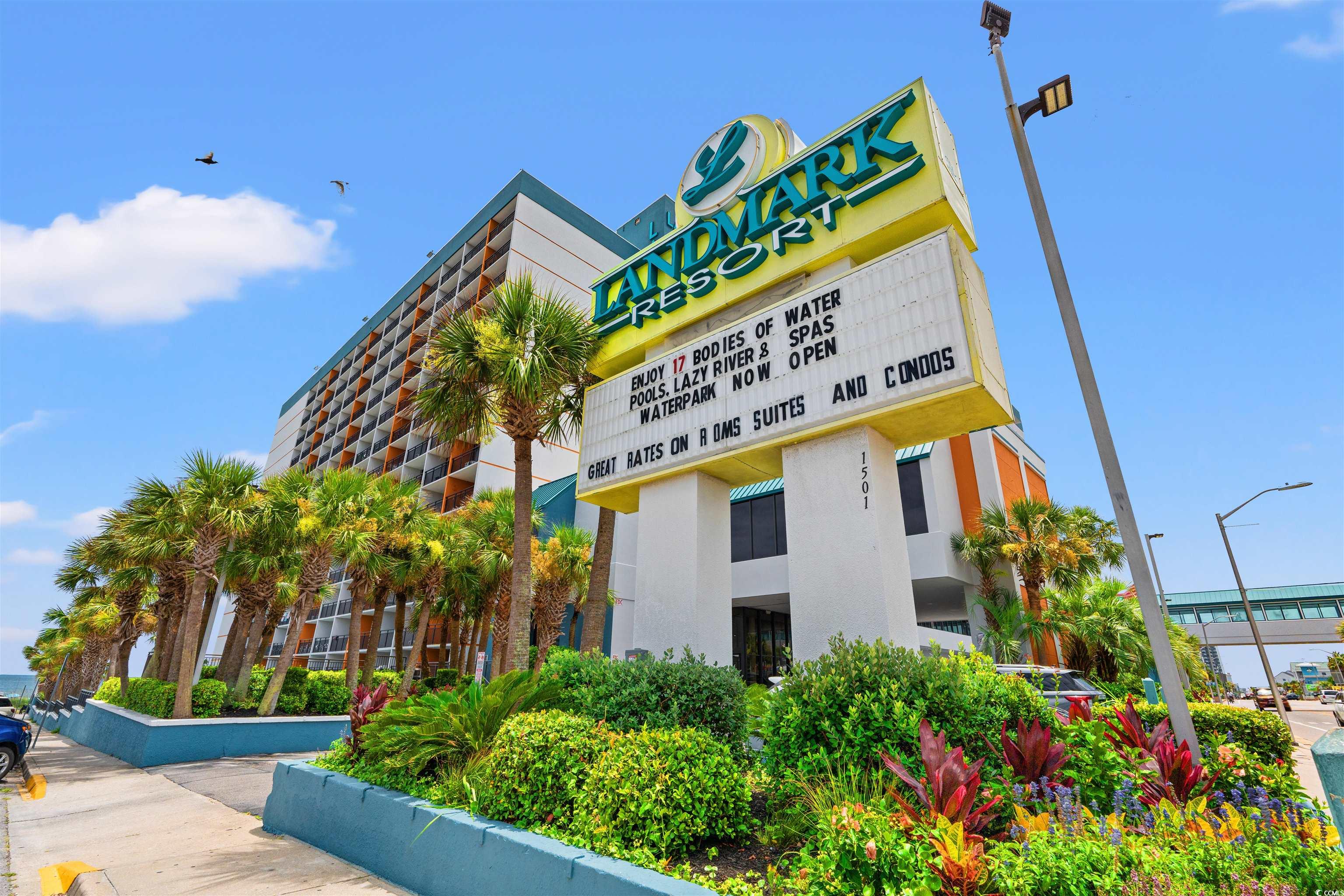 Take in the ocean view from this fully furnished condo at the Landmark Resort. The unit features two double beds, a kitchenette with granite countertops, a small dining area, laminate flooring installed in 2022, and granite countertops in the bathroom as well. Landmark Resort offers a long list of amenities including indoor and outdoor pools, a lazy river, water park, hot tubs, and a sauna. You will also find mini golf, a game room, fitness center, on-site dining, a bar, gift shop, and conference rooms, all just minutes from the airport and close to popular attractions. Whether you are looking to enjoy life by the beach or make a smart investment, this condo checks all the boxes.
