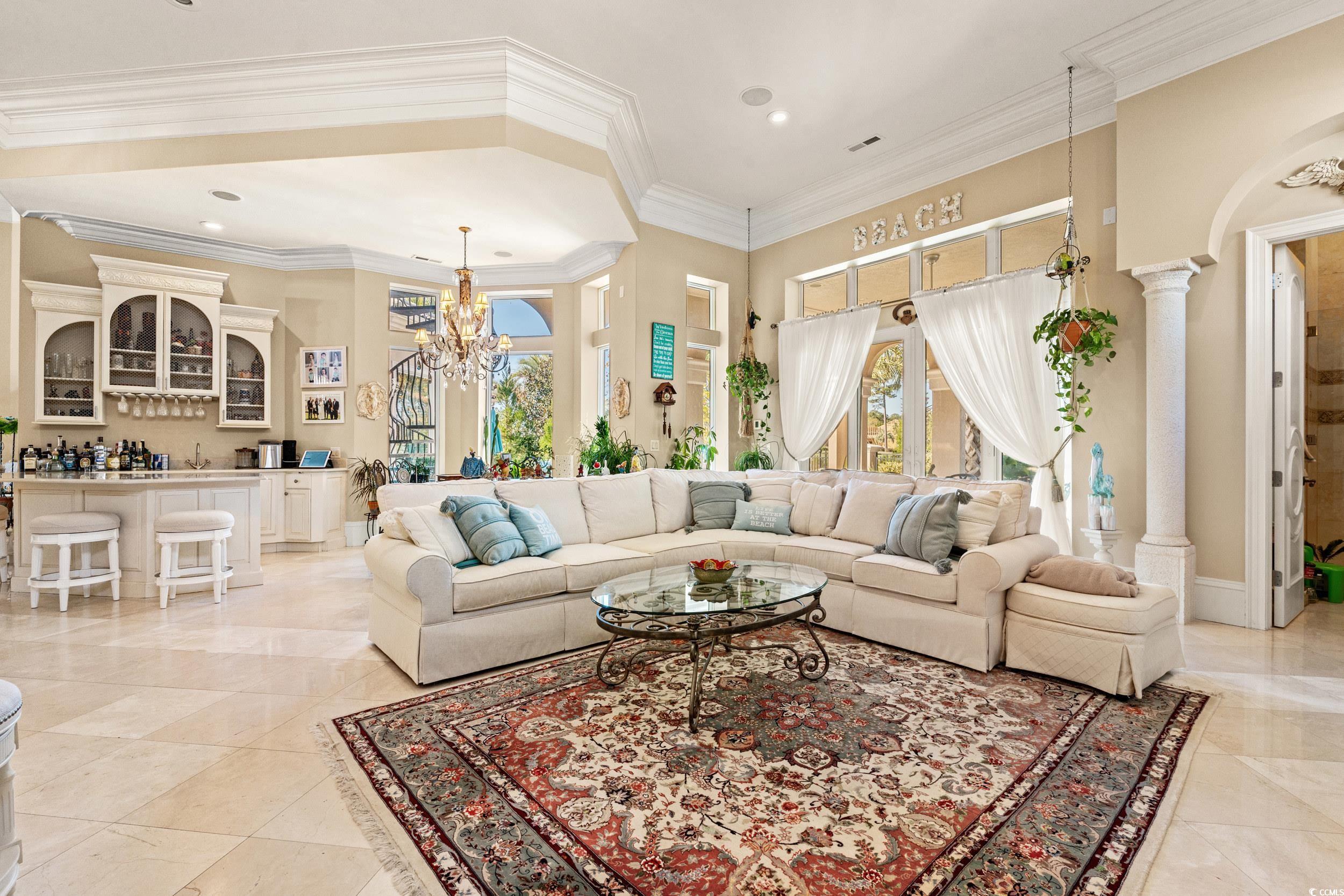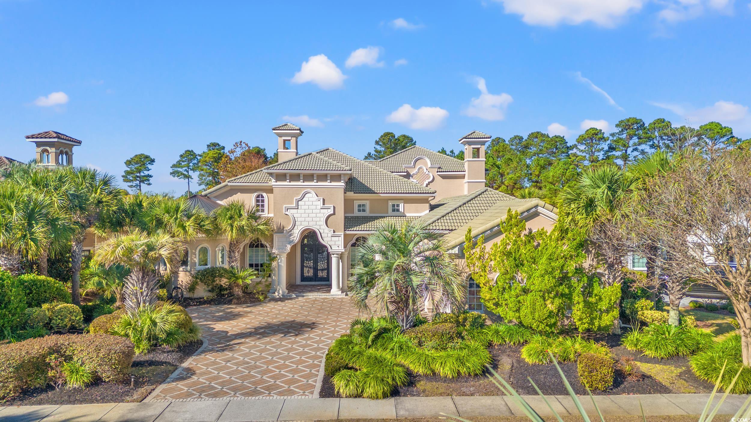 What an incredible showcase home! This former model property stands out as one of the most impressive residences in the community. Perfectly positioned on Serena Drive, just across the bridge, this stunning home sits on a premier golf course lot overlooking a serene lake and the tee box of No. 7 on the resort course. With more than 7,700 square feet under roof, it features four generous bedrooms, a two-story library, an expansive media room, and an oversized three-car garage. Crafted with superior ICF construction, this home offers soaring vaulted ceilings, detailed trim work, elegant trey ceilings, and beautiful porcelain tile in the main living spaces. The master suite boasts upgraded wood flooring, a luxurious bathroom with a whirlpool tub and spa-style shower, and custom cabinetry paired with top-tier appliances. Additional highlights include a striking stone fireplace, a gorgeous wine room, and captivating golf and water views from both the main level and the upstairs covered terrace. Step outside to enjoy lush, mature landscaping and a thoughtfully designed outdoor retreat, complete with a summer kitchen, pool, and hot tub—perfect for relaxing or entertaining after a day at the beach. Located in Grande Dunes, one of South Carolina’s most sought-after coastal communities in Myrtle Beach, this 2,600-acre development offers unmatched lifestyle amenities. Residents enjoy exclusive access to the 25,000-square-foot Ocean Club, featuring fine dining, oceanfront pools with food and beverage service, meeting spaces, and year-round activities. The community also offers two championship 18-hole golf courses, a deep-water marina, Har-Tru tennis courts, and miles of scenic biking and walking trails. This is a rare opportunity to own a true masterpiece in a premier coastal setting.