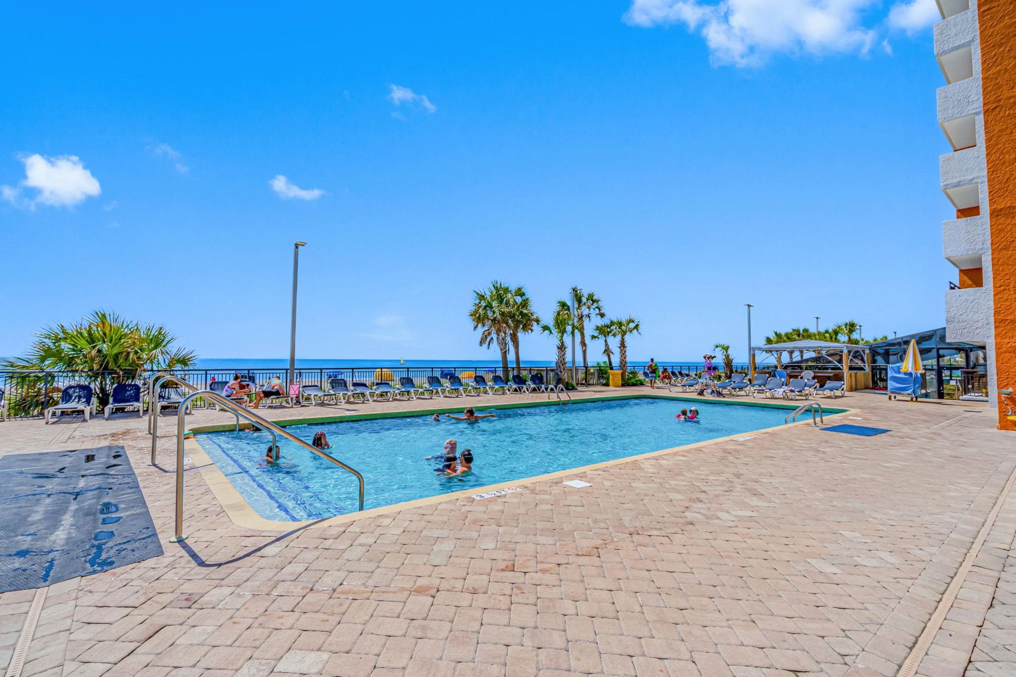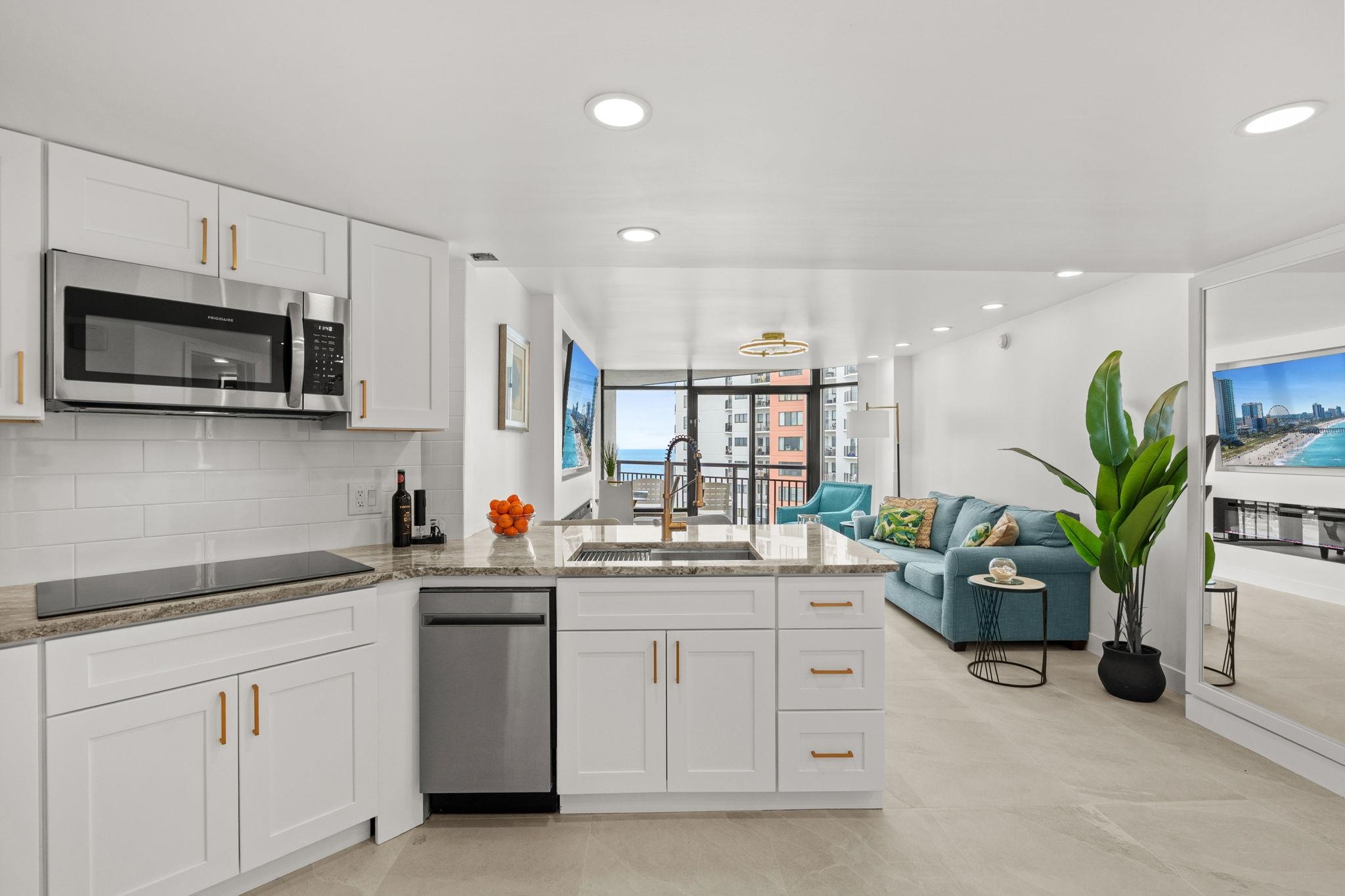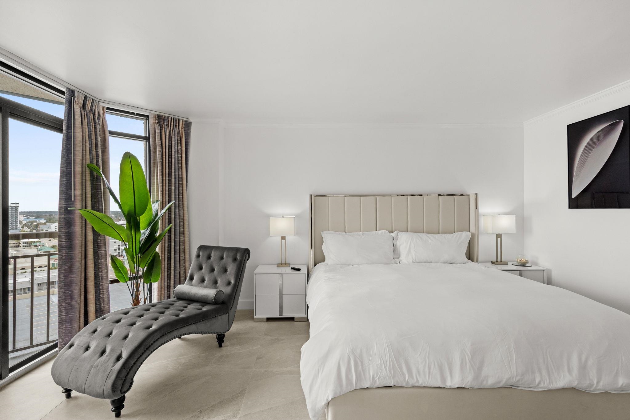 Fifteen floors above the shoreline, where the horizon stretches uninterrupted and the rhythm of the Atlantic becomes background music, this fully reimagined one-bedroom residence delivers a level of refinement rarely achieved within a resort setting. Offered fully furnished and turnkey, the interiors have been thoughtfully curated rather than simply renovated. Continuous tile flooring creates a clean architectural foundation, while layered modern lighting adds depth and warmth as day transitions to evening. A redesigned door system opens wide, allowing natural light to pour through and extending sightlines directly to the ocean beyond. The living space is both sophisticated and inviting—anchored by a 72-inch linear electric fireplace set beneath a 76-inch smart television, forming a streamlined media wall that feels intentional and balanced. From the seating area, sliding doors lead to a private balcony where morning coffee meets expansive water views and evenings close with painted sunsets. The kitchen blends form and function with contemporary cabinetry, state-of-the-art appliances, and finishes selected for both visual impact and everyday performance. Clean lines, cohesive tones, and uncluttered surfaces reflect a modern coastal aesthetic. A rare distinction: two private balconies. One extends from the main living area; the second is reserved for the bedroom suite—creating a private retreat where ocean breezes and golden-hour light filter in gently. The bedroom is arranged as a true sanctuary, complete with chaise lounge seating and its own smart television. The bath continues the design narrative with a tiled walk-in shower, upgraded vanity, and streamlined cabinetry—crisp, modern, and cohesive. Ownership offers flexibility: an onsite rental program provides a seamless, hands-off income option, while independent management allows for a more tailored investment strategy. This is not simply a resort condo—it is a carefully composed coastal residence designed for those who value privacy, finish, and the subtle luxury of elevated perspective.
