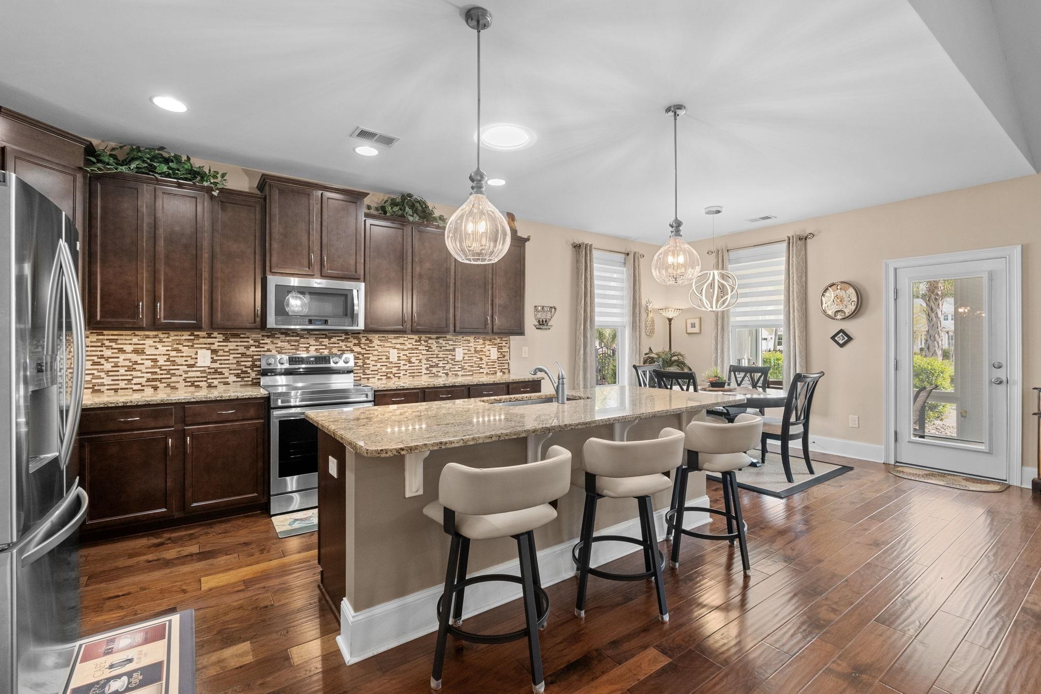 Welcome to 1512 Kensington Lane, a beautifully maintained single-level home in the highly sought-after Balmoral community of Market Common in Myrtle Beach. Offering 3 bedrooms, 2.5 baths, and approximately 2,477 heated square feet, this home blends coastal charm with modern upgrades and effortless living. This boutique and intimate setting is a natural gas and golf cart friendly community. The inviting entry features a distinctive Coastal Transformation Pineapple glass door, setting the tone for the warmth and quality found throughout. Just off the foyer, the formal dining room showcases crown molding, wainscoting, and a coffered ceiling—perfect for entertaining. The kitchen is thoughtfully designed with stainless KitchenAid appliances, granite countertops, farmhouse sink, tile backsplash, dark cabinetry, and a built-in wine rack. A natural gas line is also available behind the electric stove. The adjacent living room is bright and spacious with triple windows, vaulted ceilings, recessed lighting, ceiling fan, and hand-scraped wood flooring that extends through the main living areas. A highlight of the home is the 32’ x 8’ Carolina Room, enclosed with high-impact windows and finished with ceramic tile flooring. Equipped with a Mitsubishi mini-split system and two ceiling fans, this space is ideal for year-round enjoyment. The primary suite offers a relaxing retreat with new laminate wood-style flooring, crown molding, ceiling fan, and expanded windows. The en-suite bath features a zero-entry tiled shower with seamless glass, dual shower heads including a rain feature, double vanities with granite countertops, and a spacious walk-in closet. Two additional bedrooms include new flooring, ceiling fans, and ample closet space, with a convenient Jack-and-Jill bathroom layout. Additional features include a stylish half bath, laundry room with cabinetry and HVAC access, and a functional drop zone. The oversized 3-car garage provides ample storage and space for a golf cart, and includes a utility sink, cabinetry, attic access, and a Rinnai gas tankless water heater. The home also features tinted windows, a whole-house surge protector, and an HVAC service plan. Outside, enjoy a beautifully landscaped backyard with an expansive paver patio, mature trees, and perennials. A natural gas line is ready for a grill or fire pit. The yard offers added privacy with fencing on one side and common green space beyond the rear hedge. Located on a .22-acre lot, this home is part of Balmoral’s charming community featuring a pool, Balmoral's signature gas lanterns and paver driveways, all with a low monthly HOA. Don’t miss this opportunity to own a move-in ready home in one of Myrtle Beach’s premier communities, just minutes from Market Common shopping, dining, walking trails, parks, and of course the beautiful beaches. Medical facilities, Trader Joe's, Marshalls, Ulta, Lowes and other grocery favorites are at your fingertips. The Myrtle Beach International Airport is a 10 minute drive and a short golf cart drive delivers you to Myrtle Beach State Park for summer fun in the sun. Balmoral's HOA fee includes an attractive community pool as well. Make your appointment today to tour this beautiful property.