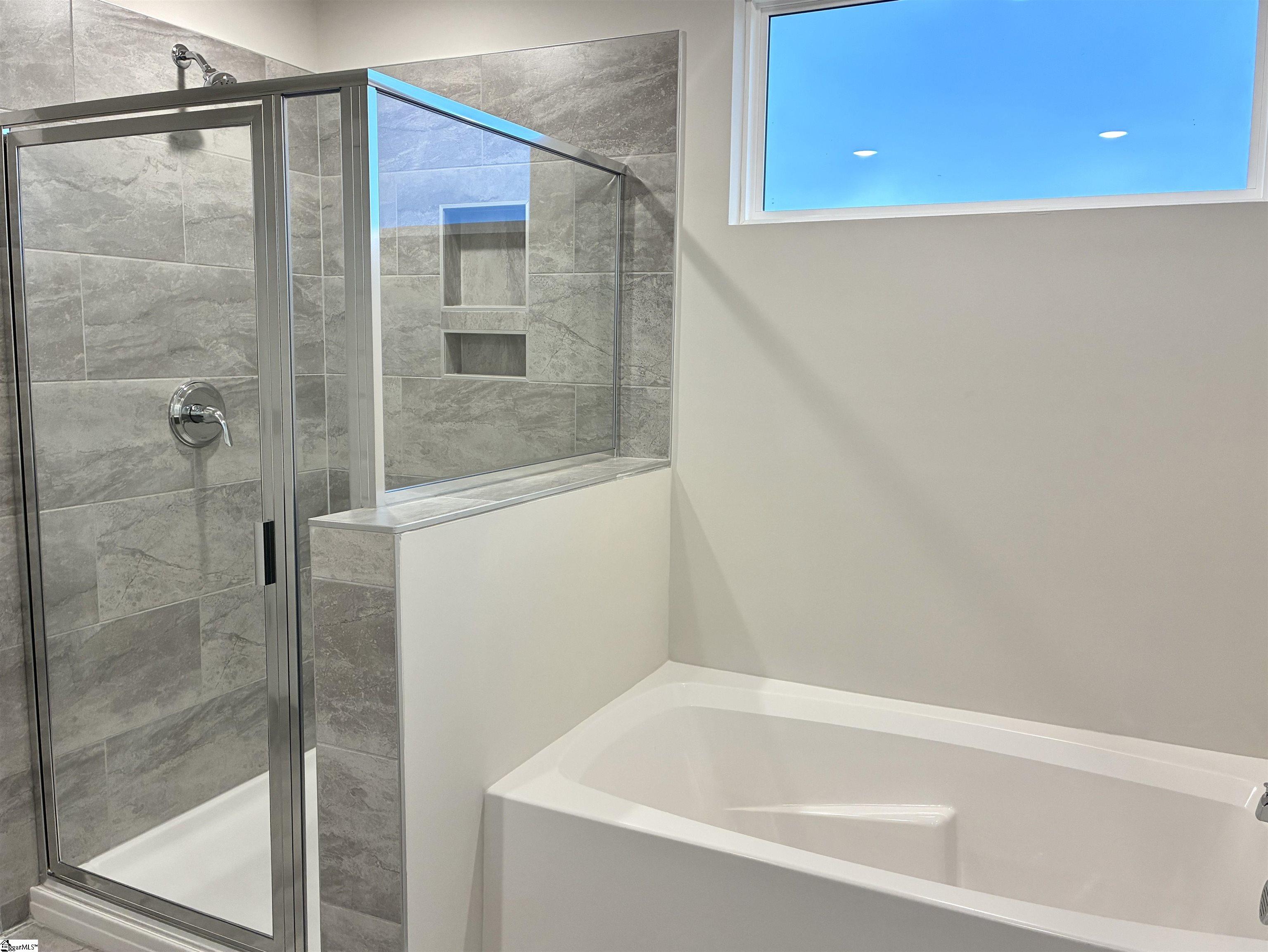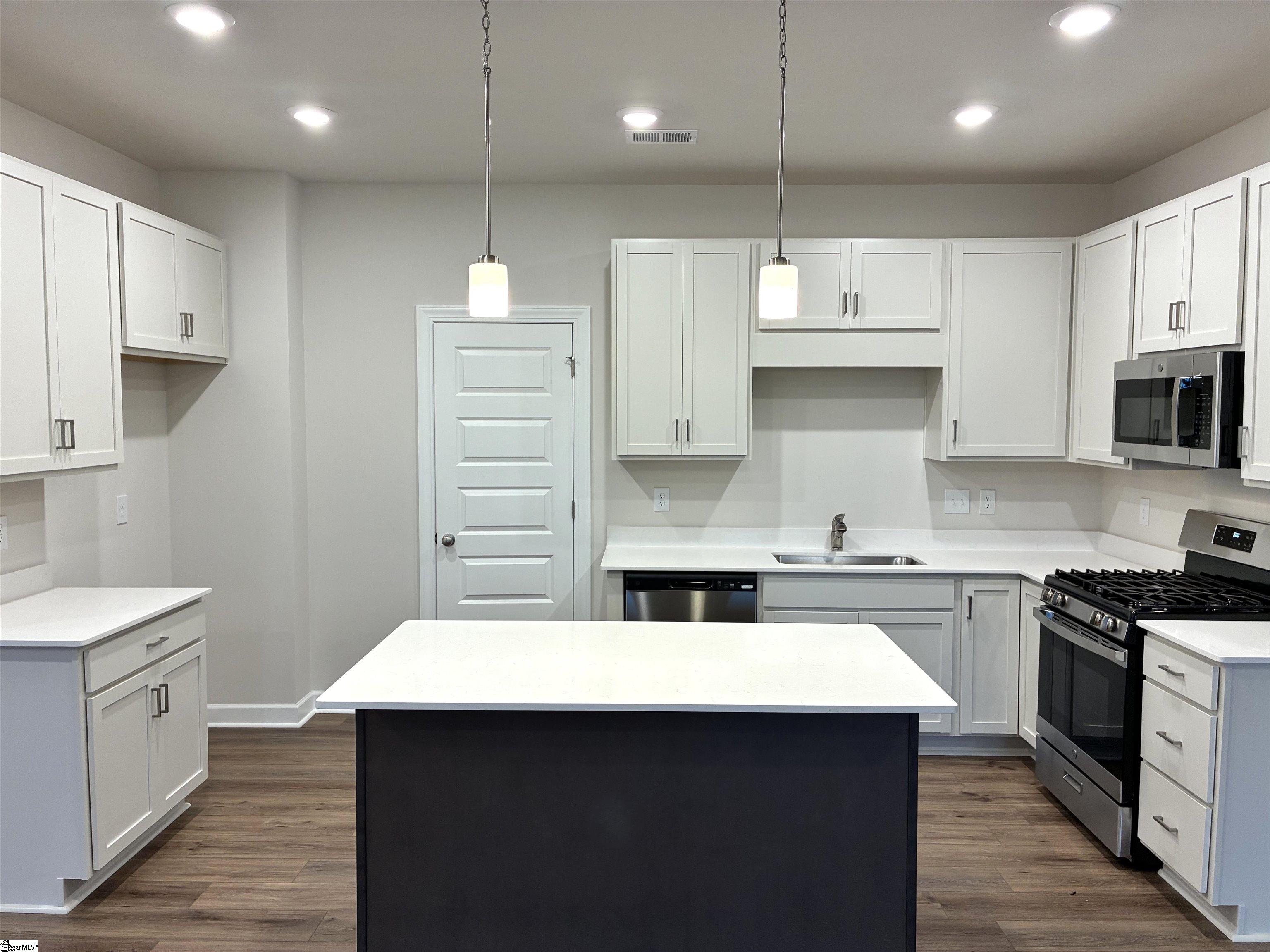 This home has a walk up to Self-Tour option. Welcome to your Manhattan style custom curated home. This spacious Kensington plan by Cothran Homes has a lovely living room with fireplace that leads right into the open concept kitchen and dining area. Fulton Shell off-white shaker style perimeter cabinets, Satin Nickel hardware, Carrara White Quartz countertops, and a spacious York Graphite-stained Island with Brushed Nickel pendant lights make this charming and inviting kitchen the place to be. Enjoy cooking on your GE Stainless gas range and whip up a meal so tasty your family will be talking about it for days. Kitchen also includes GE Stainless above-the- range microwave and dishwasher. 3 Bedrooms, 2 ½ baths, includes 5” wide Polaris Wild Dunes luxury vinyl plank flooring throughout 1st floor main living areas and Shaw Midway Plaza Pebble Creek carpet with 8lb pad in second floor bedrooms and loft. Spacious Owner’s bedroom with LED disk lights, Minka ceiling fan, tray ceiling and walk- in closet. Stunning en-suite includes Shaw Paradise White 12 x 24 tiled floors, matching tiled walk-in shower, soaking tub, York Graphite-stained double vanity with Arctic White Quartz top, white undermount sinks and linen closet. Second floor Loft is perfect to set up as a Study/Den for those cozy family movie nights. Second floor laundry room includes Washer/ Dryer hookup and shelving for all your laundry accessories. The rear covered porch is the perfect spot to do some outdoor entertaining. And last, but not least, Sherwin Williams City Loft interior wall paint, living room LED disk lights and Minka ceiling fan add the perfect final touches to complete this move-in -ready home.