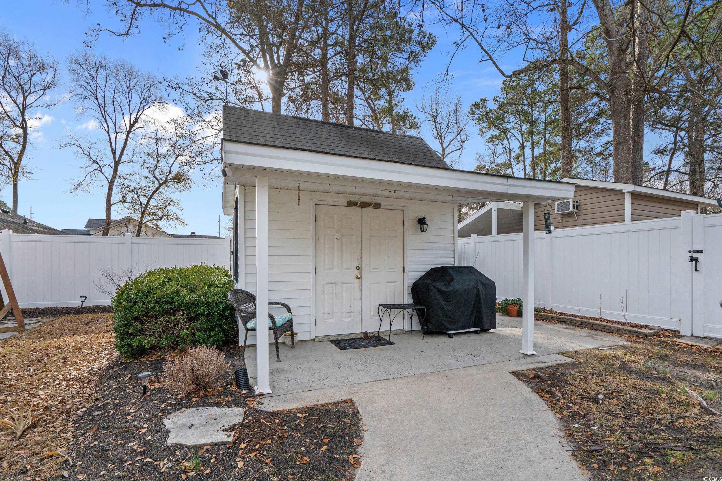 Spacious traditional ranch style home with discriminating attention to detail in every update this owner has thoughtfully done since 2002. Large 19x21 great room located at front left of home welcomes friends & family from the covered entry porch at driveway/patio at left of home. Natural light from windows, triple crown molding, smooth ceilings, LVP flooring, multiple storage closets enhance this room. From there you enter into the kitchen updated with granite, stainless steel appliances, nooks for books & countertop appliances, laundry room & large pantry. Solid Maple cabinetry with under cabinetry lighting, adds to the charm of the kitchen. Breakfast bar divides the kitchen & dining area. Living-dining area offers a gas log fireplace with granite surround & vaulted ceilings. This area is also accessible from the updated front porch. Lovely Plantation Shutters are installed throughout the home along with crown molding, oversized baseboards, & smooth ceilings. Engineered wood flooring is installed in kitchen, living-dining area, hallway, primary bedroom & bath. Primary bedroom has trey ceiling and ensuite bathroom with double sinks featuring a ship lap accent wall. Pocket door in bathroom accesses walk-in closet. Split bedroom design offers two additional carpeted bedrooms with hall bathroom. Large screened porch has cathedral ceiling & aluminum wrapped wood beams for preservation & added appeal. This owner thought of everything utilizing design appeal & quality workmanship when updating. The shed/workshop in the large fenced back yard is 10x15 & heated & cooled with electricity & plumbed for sink & outside shower. Landscaped yard also includes a waterfall Koi pond feature. This exceptional home is located in the Riverside subdivision, with NO HOA, and less than 1 mile from the ocean and a few blocks to the Intracoastal Waterway at the end of the street. Johnny Causey Boat ramp is a short distance away under the bridge. All the features & appeal that North Myrtle Beach has to offer are conveniently just a short drive from this gem of a home.