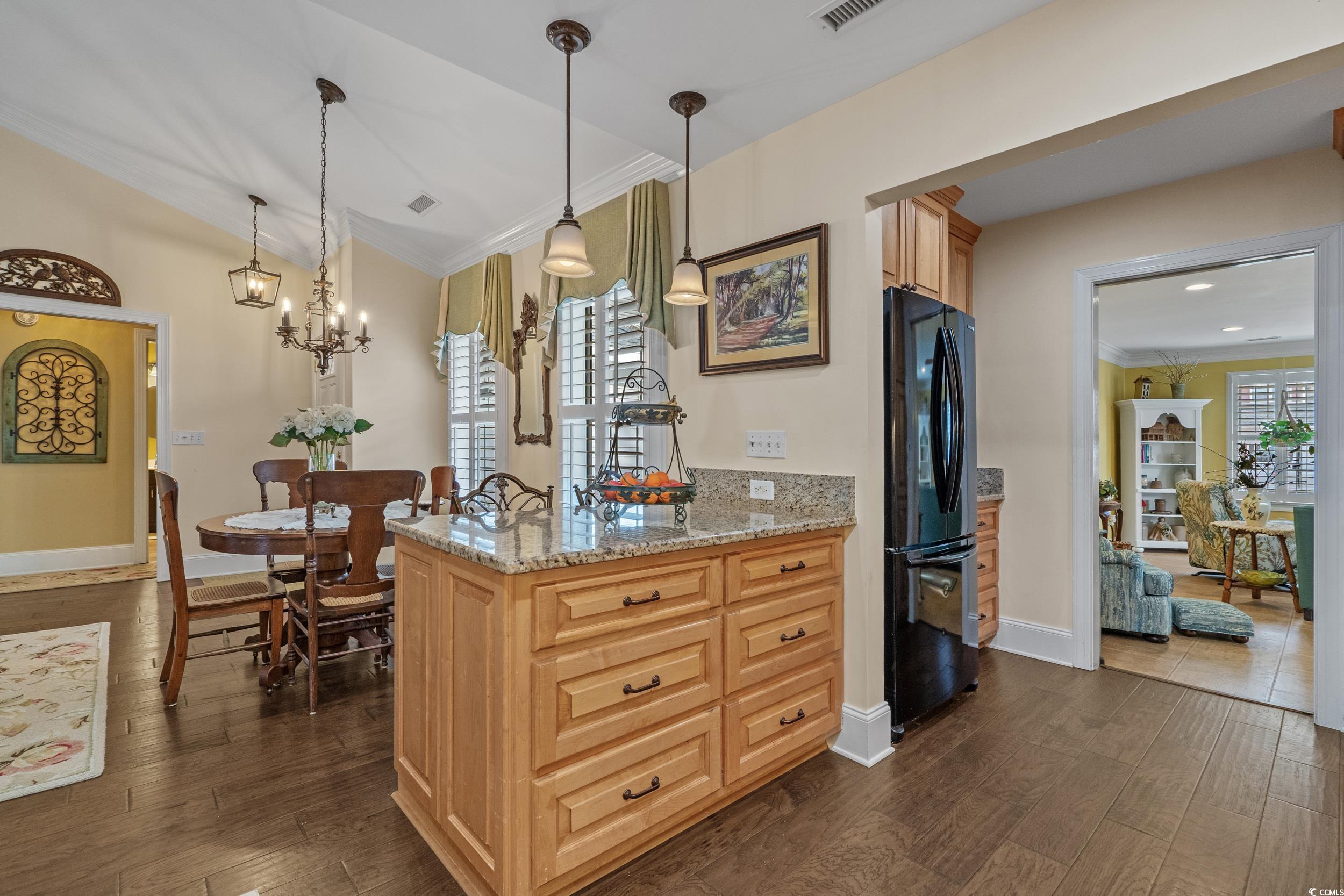 Spacious traditional ranch style home with discriminating attention to detail in every update this owner has thoughtfully done since 2002. Large 19x21 great room located at front left of home welcomes friends & family from the covered entry porch at driveway/patio at left of home. Natural light from windows, triple crown molding, smooth ceilings, LVP flooring, multiple storage closets enhance this room. From there you enter into the kitchen updated with granite, stainless steel appliances, nooks for books & countertop appliances, laundry room & large pantry. Solid Maple cabinetry with under cabinetry lighting, adds to the charm of the kitchen. Breakfast bar divides the kitchen & dining area. Living-dining area offers a gas log fireplace with granite surround & vaulted ceilings. This area is also accessible from the updated front porch. Lovely Plantation Shutters are installed throughout the home along with crown molding, oversized baseboards, & smooth ceilings. Engineered wood flooring is installed in kitchen, living-dining area, hallway, primary bedroom & bath. Primary bedroom has trey ceiling and ensuite bathroom with double sinks featuring a ship lap accent wall. Pocket door in bathroom accesses walk-in closet. Split bedroom design offers two additional carpeted bedrooms with hall bathroom. Large screened porch has cathedral ceiling & aluminum wrapped wood beams for preservation & added appeal. This owner thought of everything utilizing design appeal & quality workmanship when updating. The shed/workshop in the large fenced back yard is 10x15 & heated & cooled with electricity & plumbed for sink & outside shower. Landscaped yard also includes a waterfall Koi pond feature. This exceptional home is located in the Riverside subdivision, with NO HOA, and less than 1 mile from the ocean and a few blocks to the Intracoastal Waterway at the end of the street. Johnny Causey Boat ramp is a short distance away under the bridge. All the features & appeal that North Myrtle Beach has to offer are conveniently just a short drive from this gem of a home.