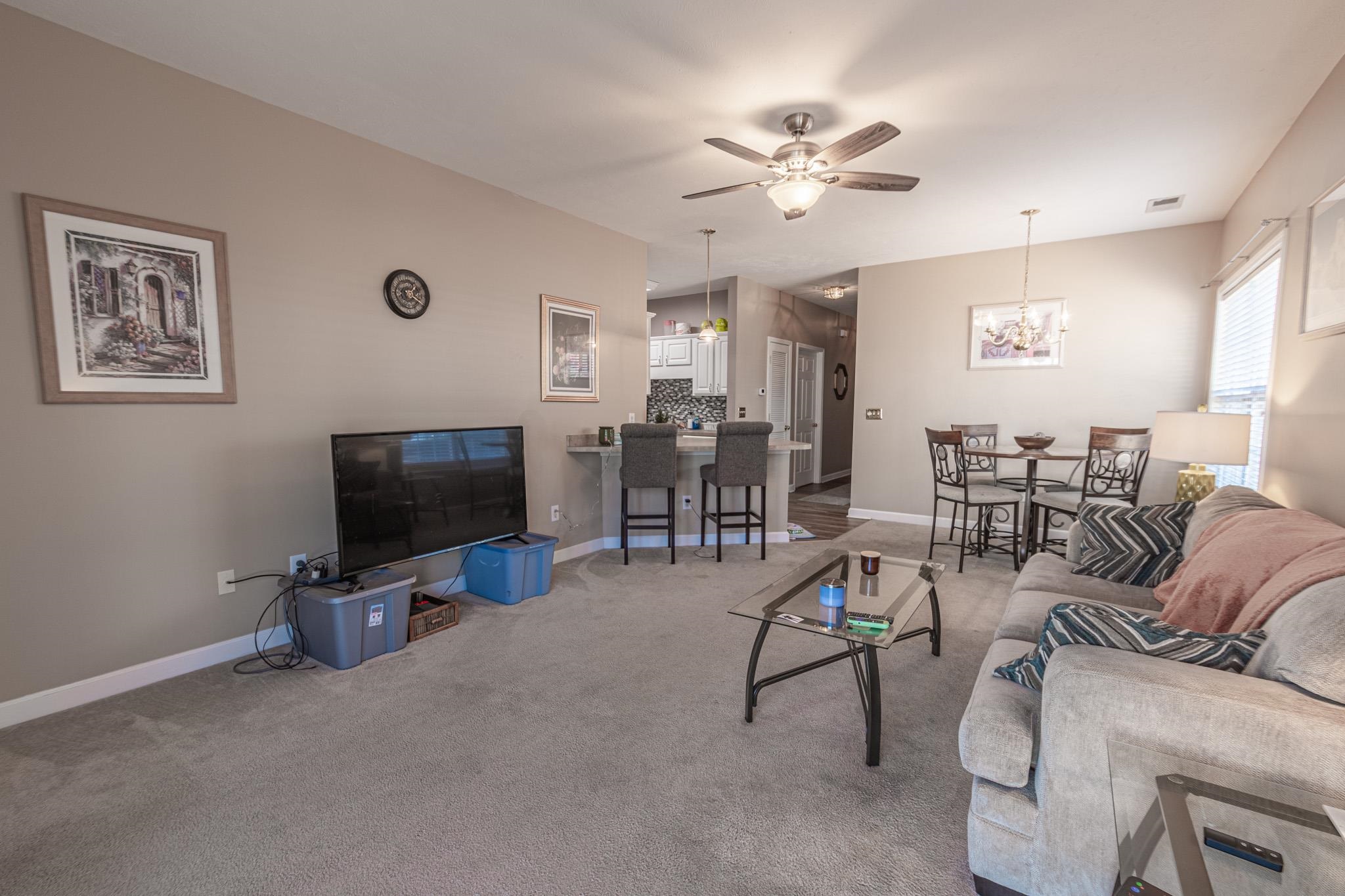First-floor three bedroom, two bath condo located in Carolina Willows featuring a desirable split-bedroom floor plan. Enter through the foyer to a thoughtfully designed interior offering a blend of carpet, tile, and LVP flooring throughout. The kitchen includes white cabinetry, a stylish backsplash, ample counter space, and a breakfast bar, with the laundry room conveniently located just off the kitchen. The living room features a ceiling fan and flows seamlessly into the dining area, with sliding glass doors leading to a screened-in back porch—perfect for relaxing. The primary suite offers a ceiling fan and private bath with dual closets, vanity, garden tub/shower combo. Two additional bedrooms, each with ceiling fans, share a hall bath with vanity and tub/shower combination. Additional highlights include attached exterior storage. Carolina Willows is a gated community with outdoor pool, grilling areas, ponds, and is located near shopping, dining, and entertainment. Square footage is approximate and not guaranteed, buyer is responsible for verification.