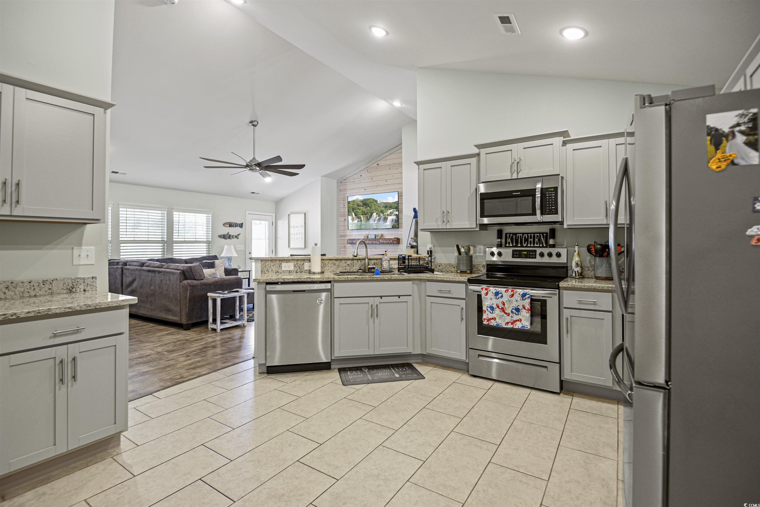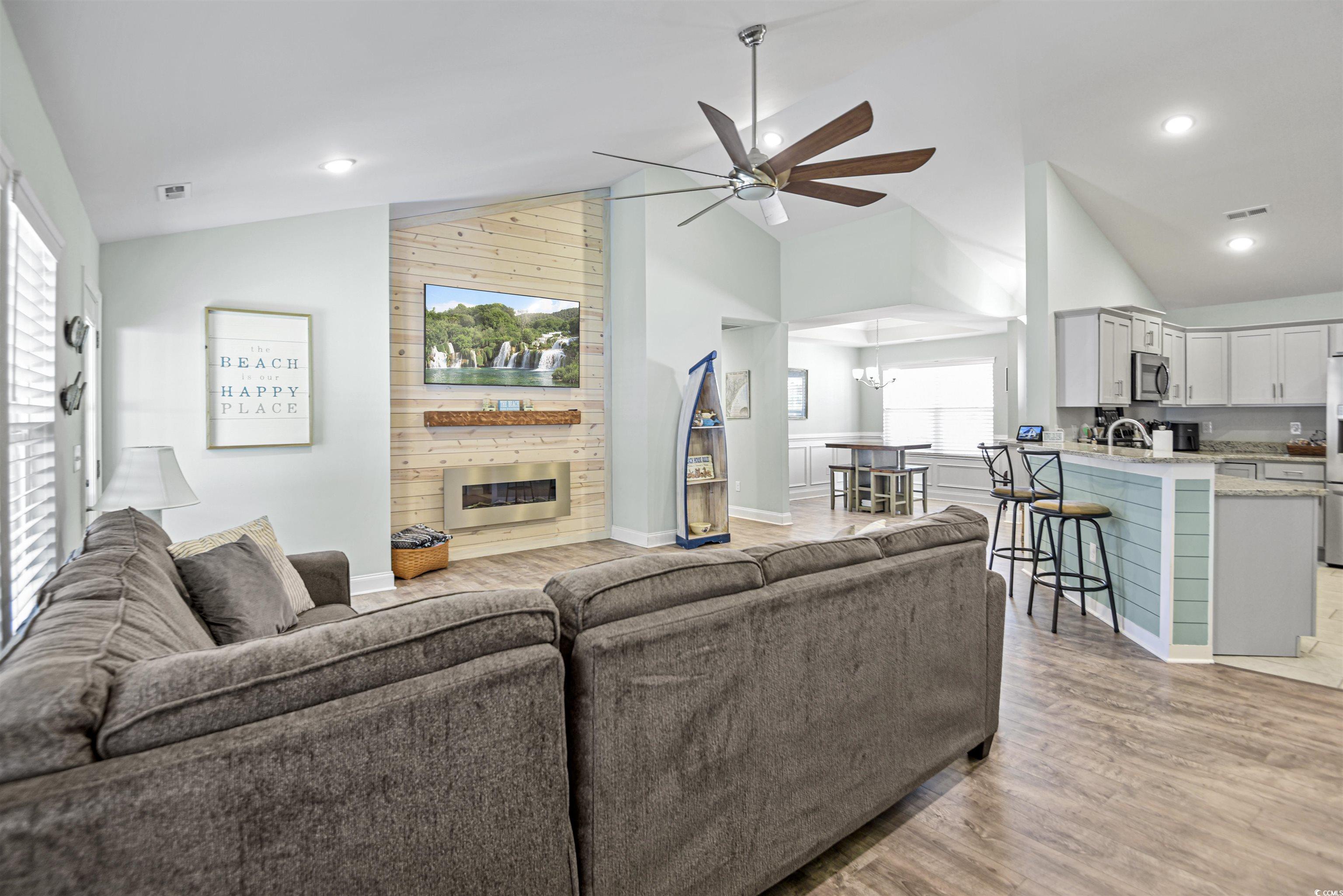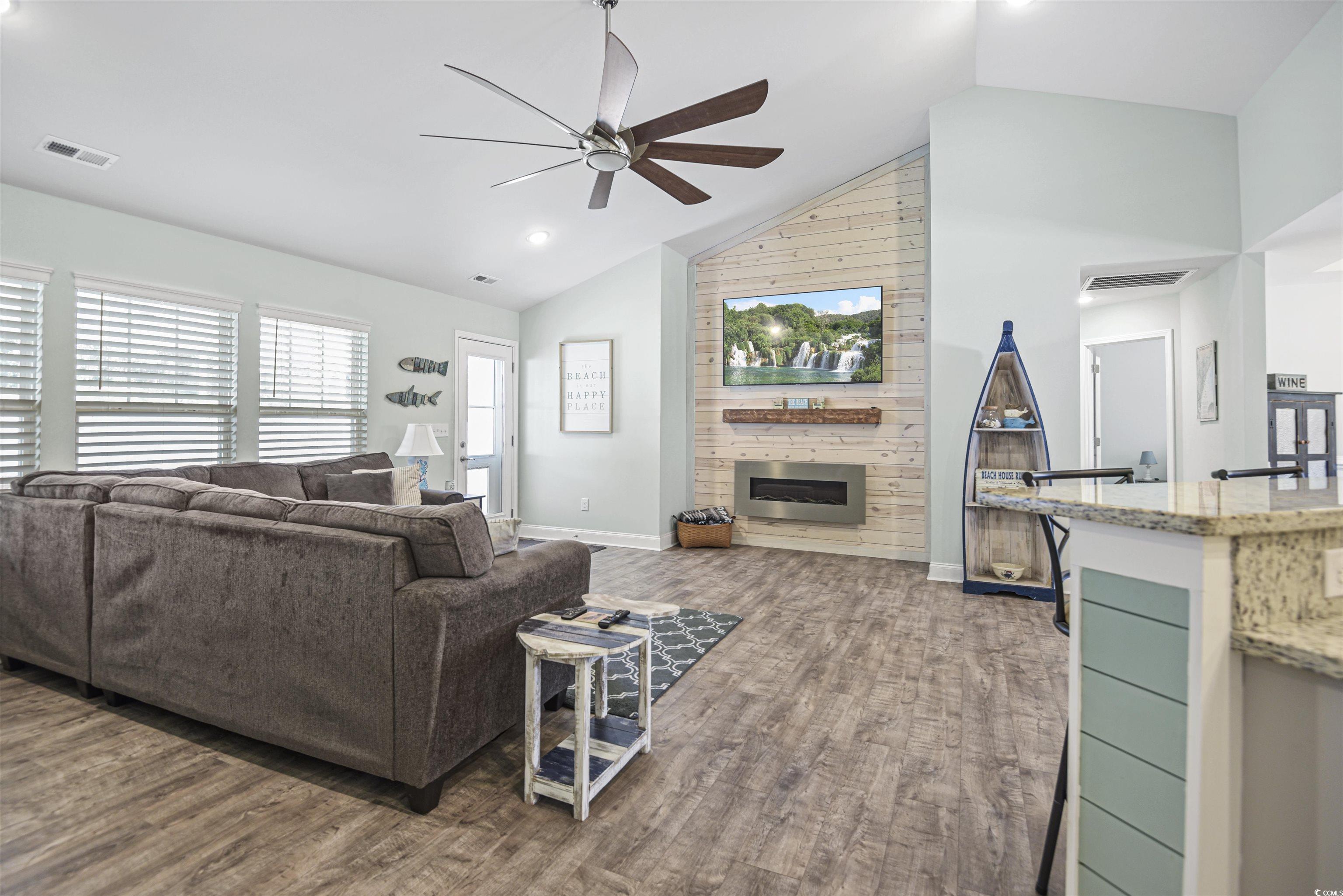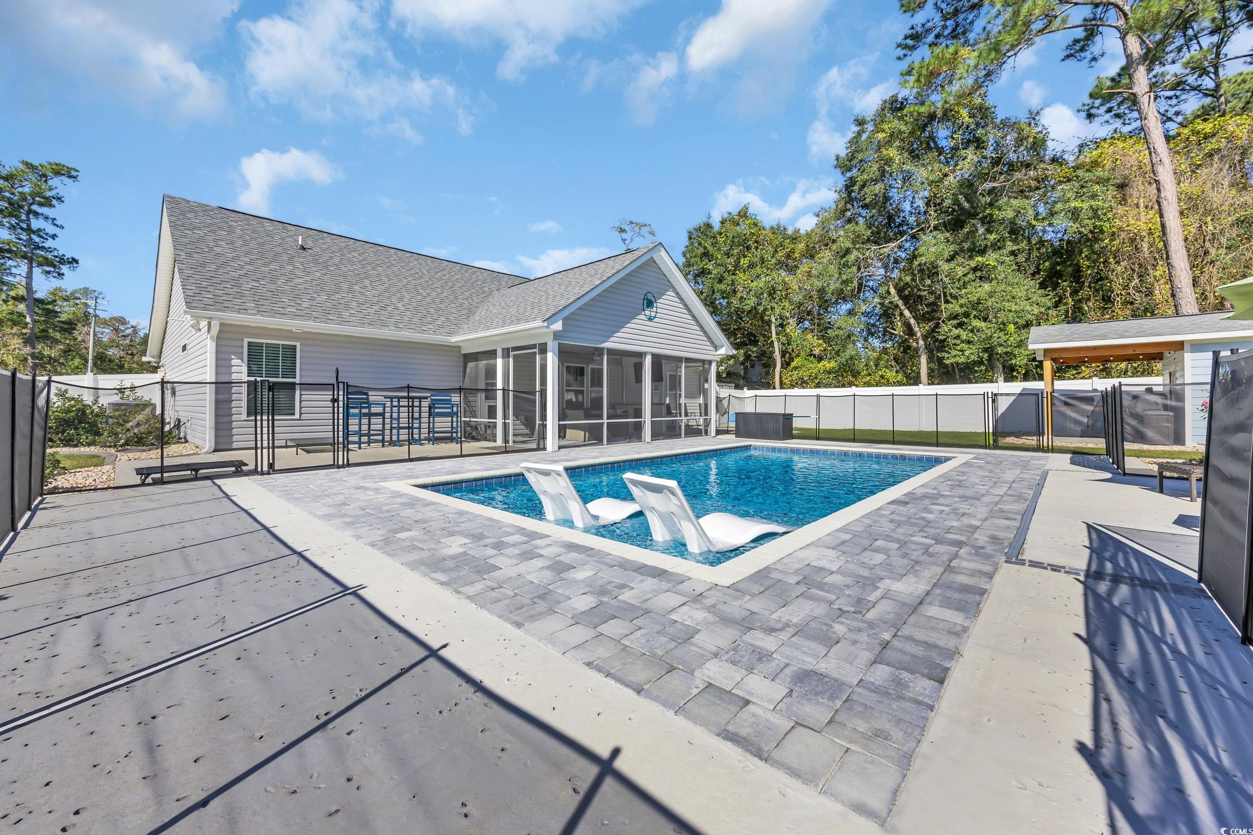 Live the good life in this coastal retreat! Picture yourself spending sunny afternoons lounging by your brand new pool with tanning ledge, hosting backyard cookouts on the extended patio, and winding down under the Carolina sky in your private fenced oasis. Situated on a spacious lot with no HOA, this property gives you the freedom to truly enjoy the coastal lifestyle. Bring your boat, RV, camper, or trailer as there is plenty of room to store it right at home. Step inside to discover an inviting open floor plan with LVP flooring throughout the main areas, vaulted ceilings, and a cozy electric fireplace that instantly feels like home. The kitchen is equipped with granite countertops, ample cabinet space, and a layout perfect for entertaining. The first floor master suite offers both comfort and style, featuring a large walk-in closet and a beautifully designed bath with double vanities. Two additional bedrooms and a full bath are also located on the main level, while a private guest suite upstairs provides a bedroom and bath, perfect for visitors or family. Additional highlights include a laundry room with a convenient drop zone, an irrigation system to keep your lawn lush, a Hardie wrapped storage building, covered grilling area, and kayak storage. Ideally located just minutes from the charm of Little River and the sandy shores of Cherry Grove in North Myrtle Beach, this home delivers the ultimate blend of relaxation, recreation, and coastal freedom.
