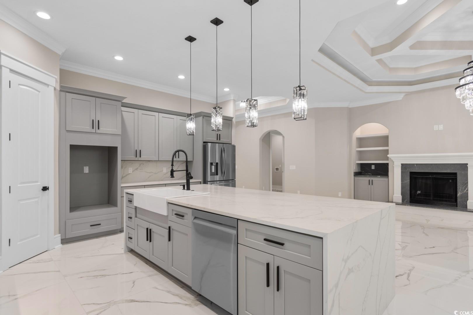 *BACK ON THE MARKET DUE TO NO FAULT OF THE SELLER* Welcome to this stunning Mediterranean style newly built 4 bedroom, 3 bathroom home in the heart of Little River, blending modern style, everyday comfort, and thoughtful design. From the moment you walk in, you're greeted by a spacious foyer that welcomes you to the open-concept living area featuring 12-foot ceilings, a cozy fireplace with built in , porcelain tile through, and custom tray & coffered ceilings that elevate the space with a touch of luxury. This expansive chef's kitchen showcases, custom cabinetry, stunning quartz countertops with a full-height backsplash that matches the countertops, a large waterfall island , high-end stainless steel appliances, and a generous pantry. Designed perfectly for everyday function with upscale style for effortless entertaining. Retreat to the spacious master suite, boasting elegant tray ceilings, two walk-in closets with custom shelving, and a spa-inspired bathroom with an oversized slab walk-in shower, double vanities, and a relaxing jetted tub. Two of the additional bedrooms are joined by a Jack-and-Jill bathroom with a double vanity, tray ceilings, and large custom closets. The fourth bedroom has an en-suite bathroom which is perfect for guests or a home office. The roomy laundry room has plenty of cabinets for storage, counterspace for laundry days and a sink. Step outside to the spacious covered back porch, which features an outdoor kitchen area with granite countertops and a built-in stainless steel refrigerator sets the stage for unforgettable gatherings and weekend cookouts! This home features a spacious three-car side garage with epoxied flooring. Additionally, this breathtaking home offers all high end chandeliers, the guest bedroom ceilings fans have speakers and multicolor lights, LED vanity mirrors, built in exterior light surround the home and so much more! Located within a short to the beach and all that the Grand Strand has to offer! Don't miss out on this exceptional property, schedule your showing today!