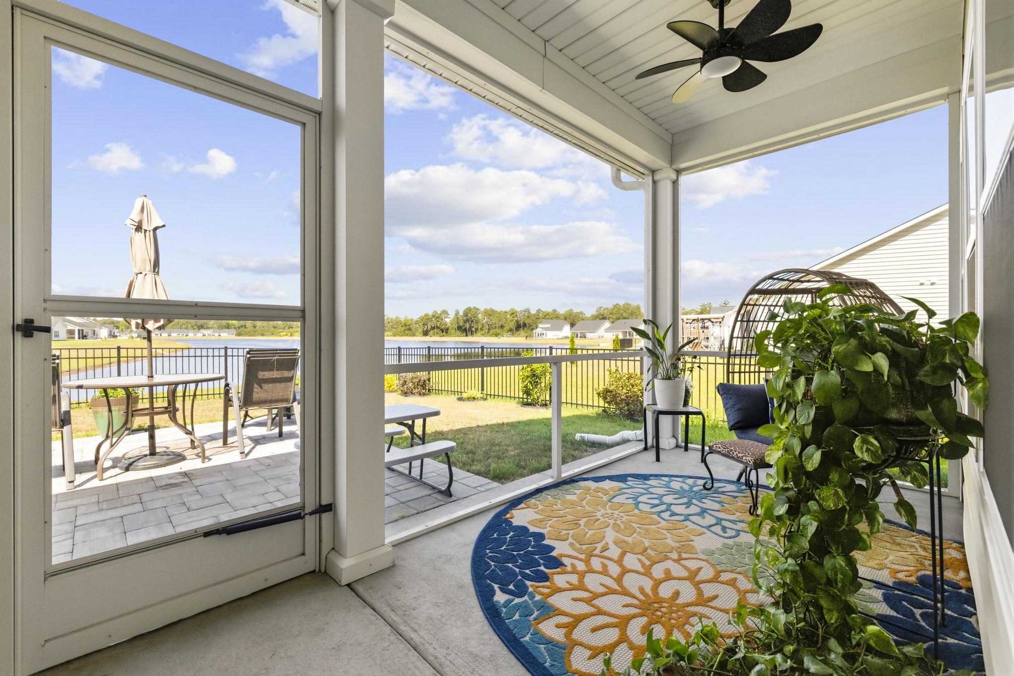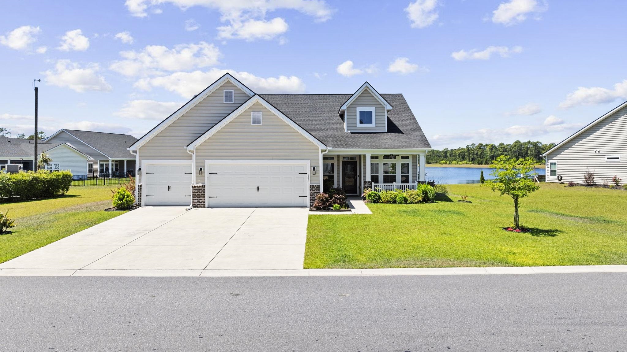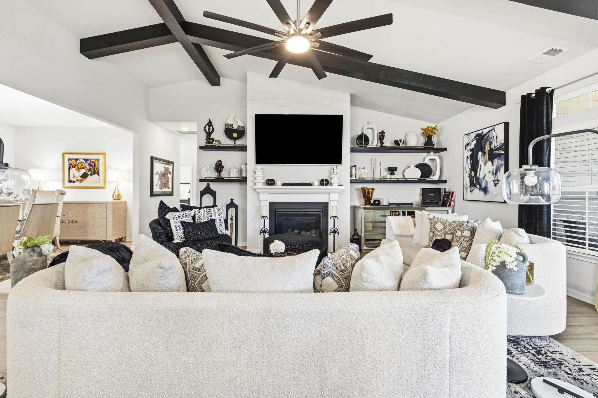 OPEN HOUSE- Saturday and Sunday 12pm-2pm - Welcome home to one of the most coveted lots in the entire neighborhood — with generous space on both sides and breathtaking, unobstructed lake views, this property is a rare find. This beautifully designed single-story home offers 3 bedrooms and 2 bathrooms, and what sets it apart is the care and vision the owner brought to every detail. Be sure to note the Ring Doorbell to convey. Starting with a builder-grade foundation, they transformed this home into something that feels entirely custom and it shows from the moment you arrive. Transom windows at both the front and rear of the home flood the interior with natural light and add an architectural elegance that immediately elevates the space. Every builder-grade light fixture has been replaced with carefully chosen, upscale alternatives, lending a warm and refined ambiance throughout. The living room is a showstopper, featuring custom wood beams overhead and a built-in fireplace that anchors the space with warmth and character. A versatile front room is currently styled as a lounge and flows beautifully, but can easily be converted into a private home office to suit your needs. The gourmet kitchen is a chef's dream, outfitted with a gas cooktop, built-in oven and microwave, a dedicated pantry, and an abundance of storage throughout. A large quartz island takes center stage, complemented by a stylish tile backsplash, pull-out trash and recycling drawers, and luxury vinyl plank flooring that flows seamlessly through all main living areas. A formal dining room provides an elegant space for hosting. The primary suite is a true retreat, boasting two walk-in closets with custom storage solutions and a spa-like en suite bathroom with a double sink vanity. Two additional bedrooms offer flexibility for family, guests, or additional workspace. Outdoor living is where this home truly shines. Enjoy your morning coffee on the covered front porch, relax in the spacious screened-in back porch, or host friends on the elegant paver patio — all within the privacy of a fully fenced backyard with serene lake views as your backdrop. Completing this exceptional home is an attached 3-car garage, providing ample storage and parking for the whole household. And the lifestyle extends beyond your front door, the community offers a pool, playground, and a community garden, making this a wonderful place to put down roots. Homes like this — on a lot this special, with this level of finish — don't come along often. Don't miss your opportunity to make it yours.