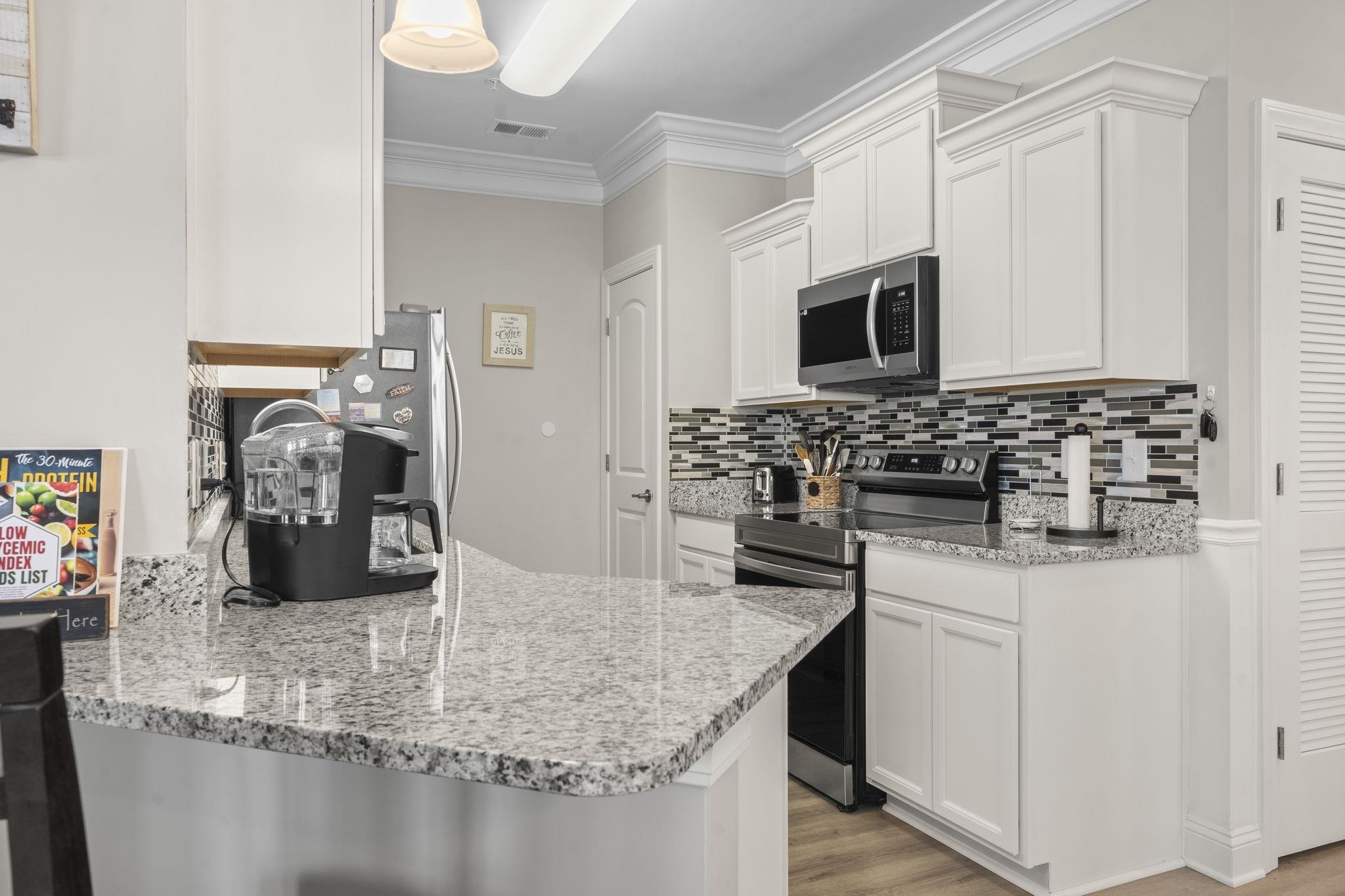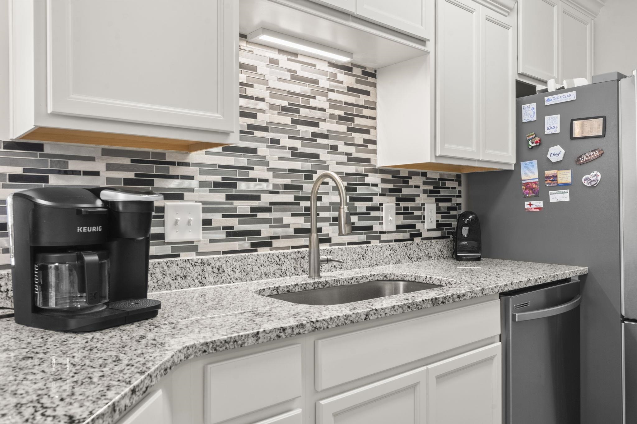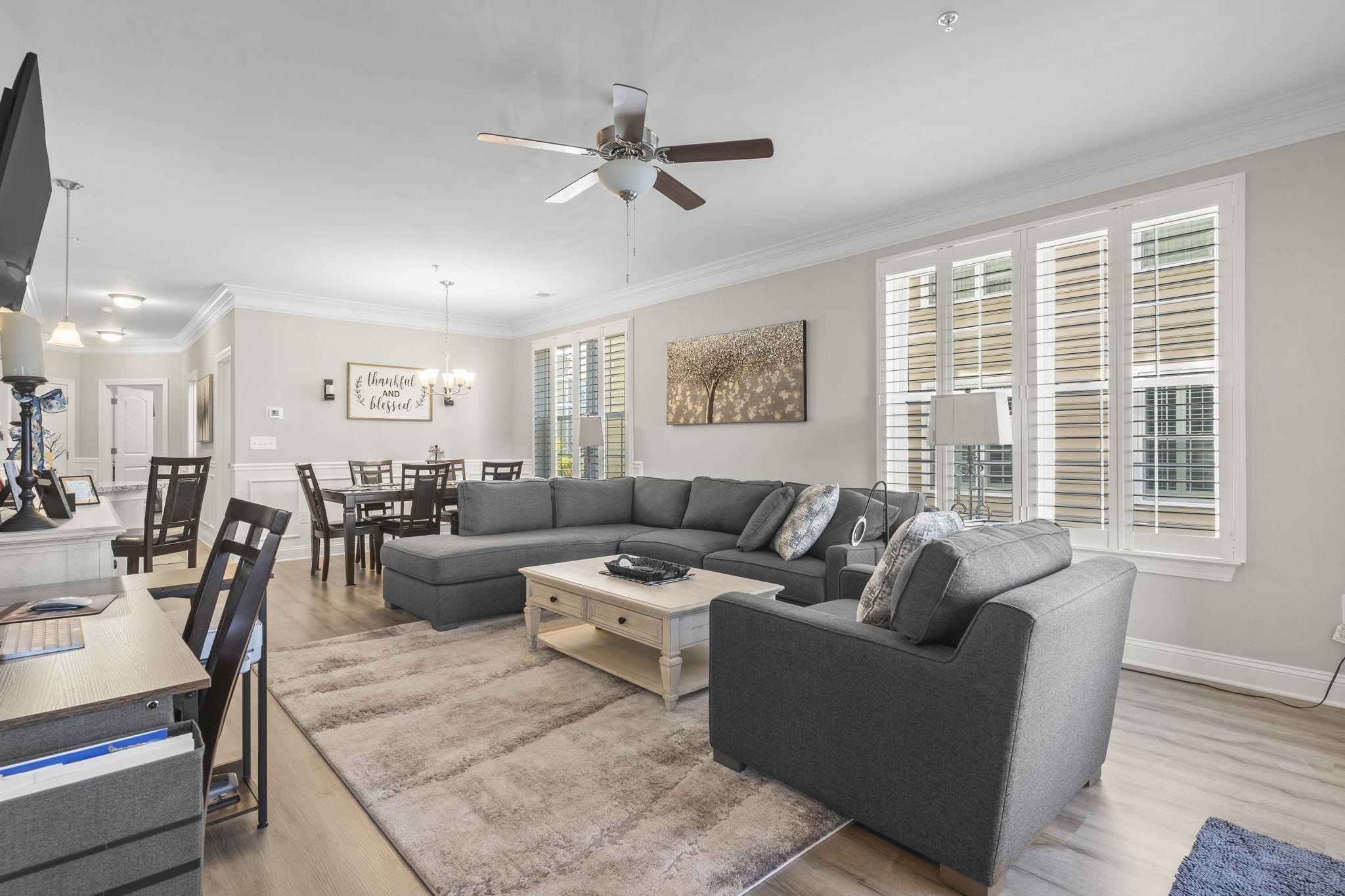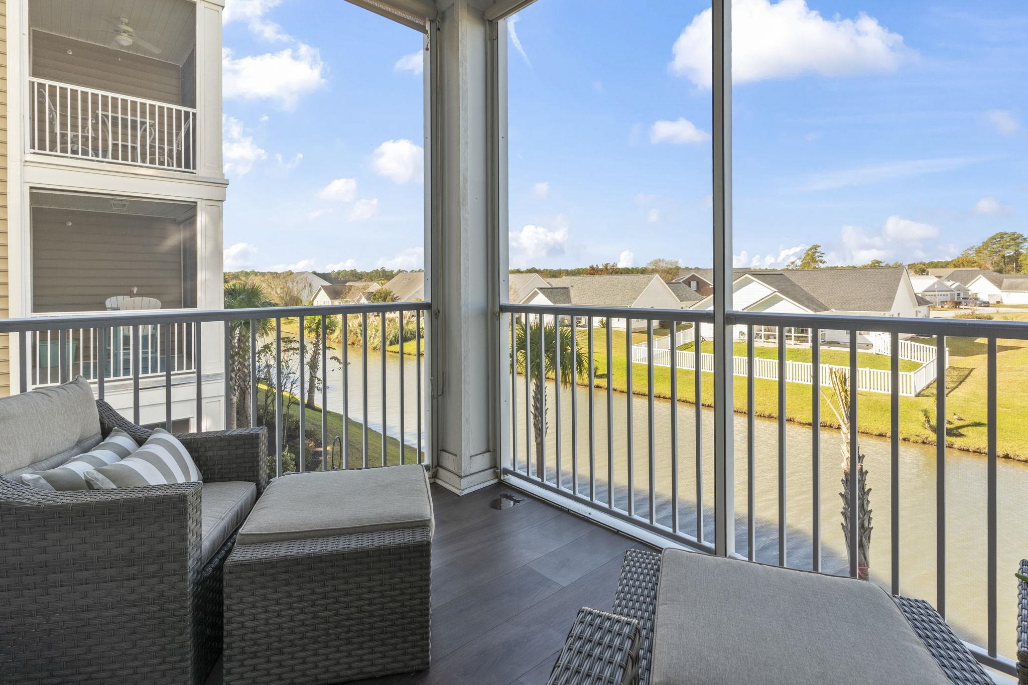 UPGRADES include: Vinyl Flooring and Roller Shades on the balcony, Shower Door in Primary Bathroom, Wainscoting in Dining Area, Recessed Lighting in Primary Bathroom, 2 TV mounts in the Primary Bedroom and Living Room, Cabinets in the Laundry Room, Backsplash in the Kitchen, Ceiling Fans in both Guest Bedrooms and Balcony, Double Crown Molding in all Bedrooms, Storm Door in Entrance, Plantation Shutters on all windows and Roller Shades on the Balcony Doors, added additional Shelving in Guest Bedroom closet. Built in 2024, this exquisite second-floor, end unit combines comfort, style, and convenience, offering an inviting home that feels both sophisticated and warm, and has the benefits from elevator access. Perfectly designed for those who appreciate thoughtful details and a tranquil ambiance, this lovely home features stunning pond views visible from the screened-in porch, making it a serene retreat for relaxation or entertaining. The vinyl flooring and roller shades let you control sunlight and breeze. The spacious living areas are adorned with LVP flooring, while the bedrooms provide plush carpeting for cozy comfort. Every bedroom is detailed with elegant double crown molding, adding a refined touch that elevates the overall aesthetic. The kitchen has modern stainless-steel appliances, paired with a beautiful backsplash that adds texture and visual interest. Whether preparing casual meals or hosting dinner, this area invites culinary creativity within a polished environment. Wainscoting in the dining area adds architectural charm and warmth. The primary bathroom features recessed lighting that creates a clean, inviting atmosphere, and the shower is enclosed with a sleek glass door. Plantation shutters on all windows offers both privacy and a classic style. And an extra bonus, the HOA pays for Internet and Cable! The Village of Queens Harbour II is conveniently close to dining, shopping; Market Common and the Marsh Walk, with the sandy beach just a short drive away.