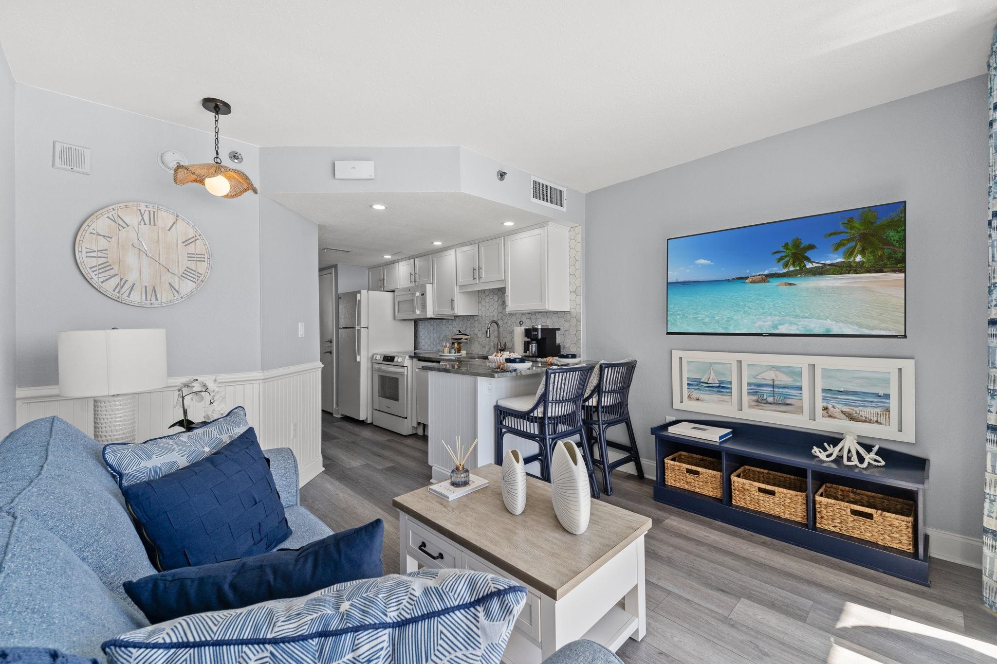 Welcome to Unit 1010 in the Ocean Front South Tower of the prestigious Seawatch Resort, where breathtaking views and effortless coastal living await. Nestled in the highly desirable Arcadian Shores, this beautifully renovated 1-bedroom, 1-bath direct oceanfront residence offers the ultimate resort-style lifestyle... perfect as a vacation retreat, investment property, or personal beach home. Step inside to discover a fully furnished and thoughtfully decorated space designed for comfort and style. The stunning kitchen features crisp white custom-built cabinetry, Level 5 exotic quartz countertops, recessed LED lighting, and a striking marble opalescent hexagon backsplash that adds a unique designer touch. Expansive floor-to-ceiling windows and a sliding glass door framed with custom curtains flood the living area with natural light while showcasing incredible views of the Atlantic.The bathroom offers granite countertops, a charming tongue-and-groove wood ceiling, and a tub/shower combination- ideal for unwinding after a day spent enjoying the surf, sun, and sand. The primary bedroom is beautifully styled with custom draperies, playful artwork, and a stylish sliding barn door for added character. Step out onto the large private balcony from the living room and take in unforgettable panoramic views of the sparkling Atlantic Ocean, where you can enjoy abundant wildlife and spectacular sunrises each morning. Residents and guests of Seawatch Resort enjoy an impressive array of amenities, including six indoor and outdoor swimming pools, two lazy rivers, ten hot tubs, a fitness center, arcade, poolside tiki bar, on-site restaurant, and coffee shop. The HOA fee is all-inclusive and even covers building insurance, offering exceptional value and convenience. Ideally located in North Myrtle Beach, this property is just minutes from shopping, dining, outlet malls, entertainment, golf courses, fishing, boating, water parks, and the pristine white-sand beaches of the famous Grand Strand. Turnkey, beautifully updated, and perfectly positioned on the oceanfront—Unit 1010 is the coastal escape you’ve been waiting for. Contact us today to schedule your private showing.