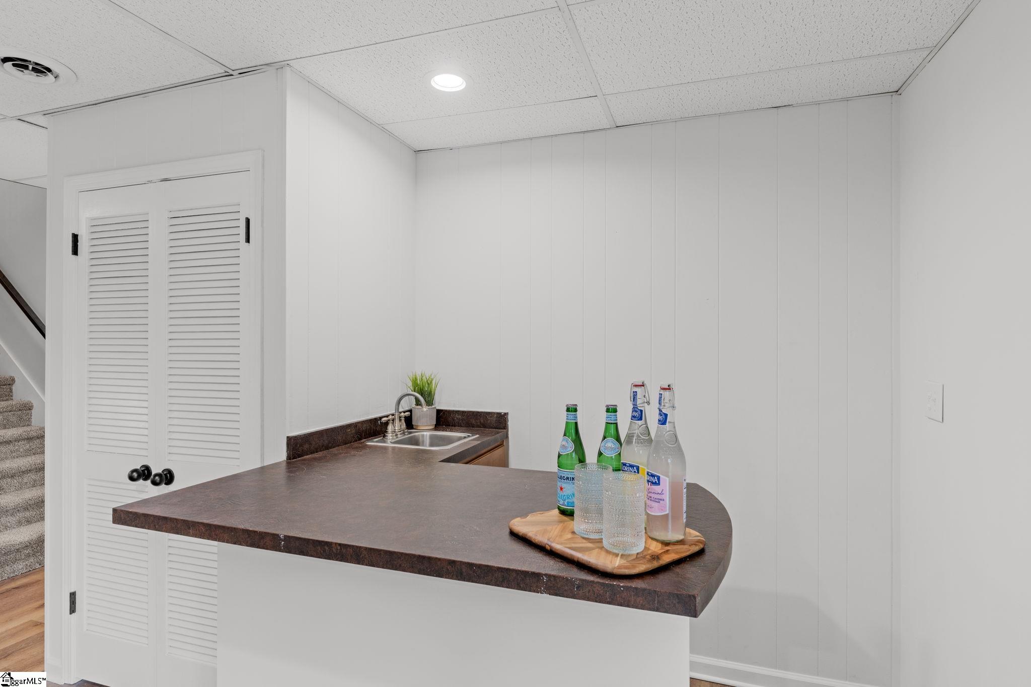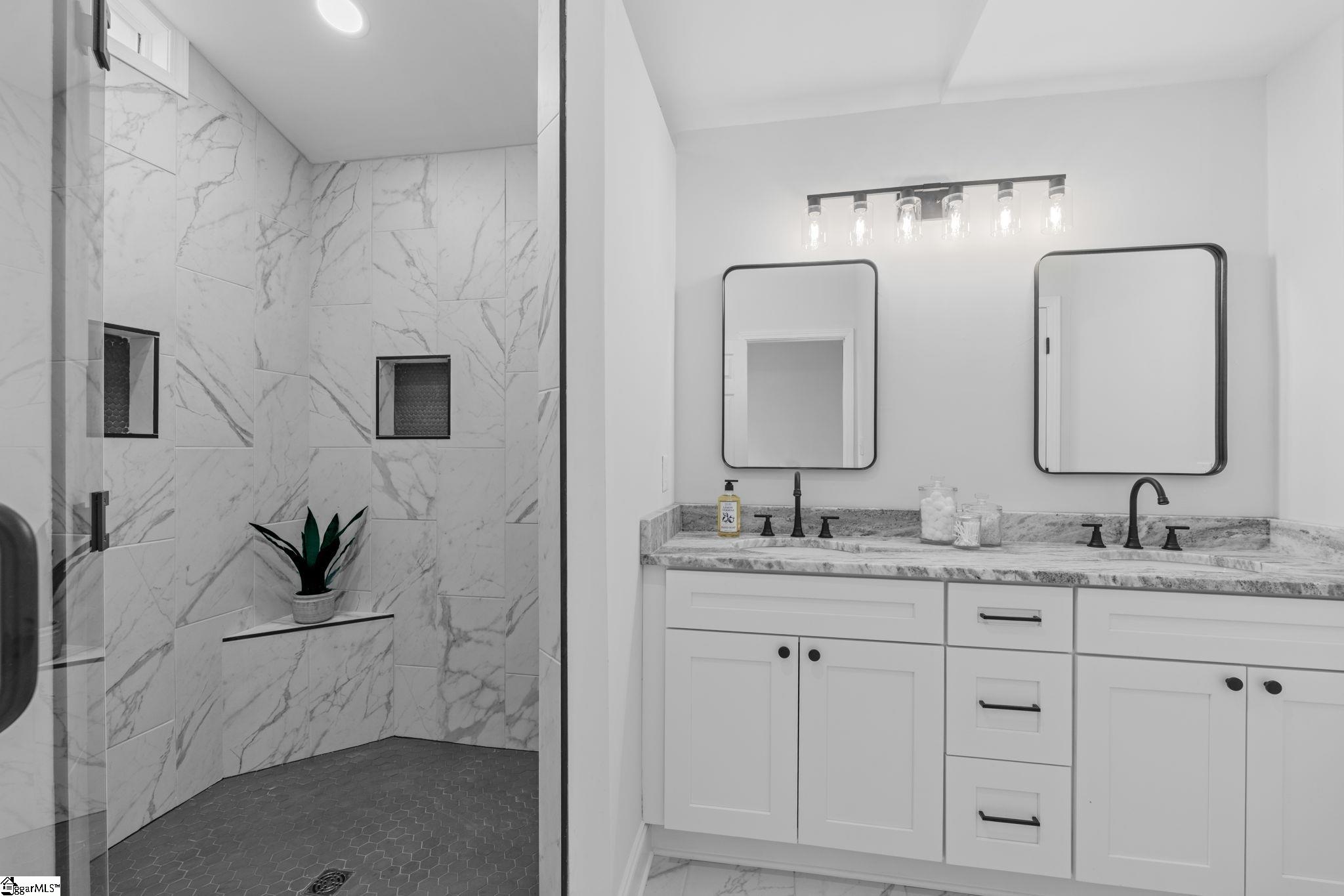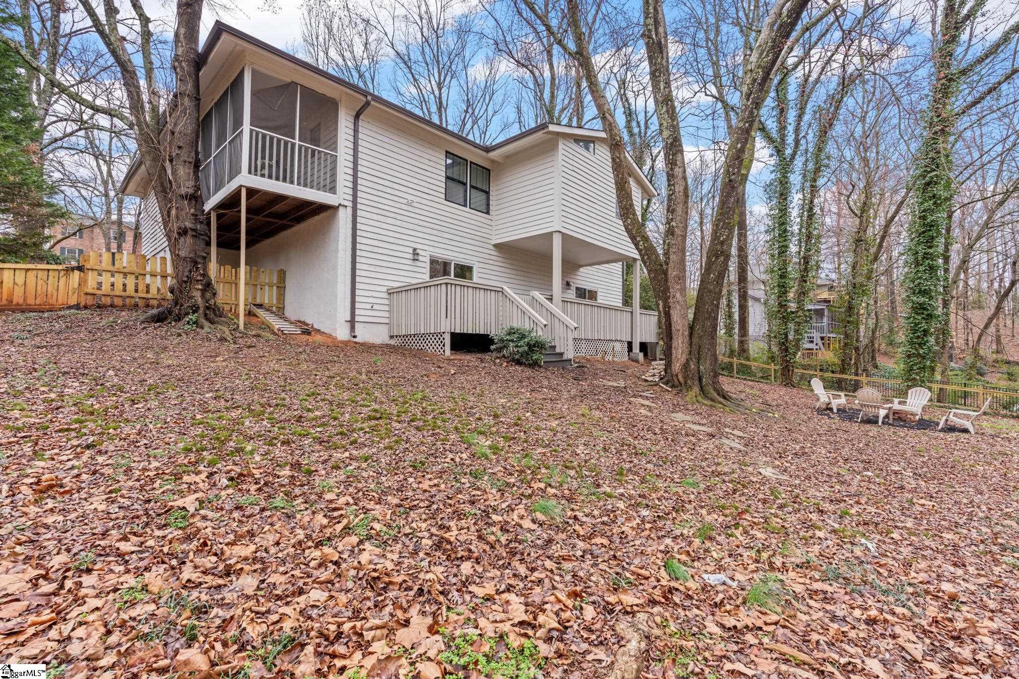 Welcome home to this four bedroom, three bathroom home in the sought after Pebble Creek community, offering a functional layout, updated finishes, and a convenient location. The main level features an open living room with vaulted ceilings, large windows that provide abundant natural light, hardwood flooring, and a modern fireplace. The living space flows seamlessly into the dining area with direct access to a screened porch. The fully remodeled kitchen includes quartz countertops, new stainless steel appliances, updated cabinetry, and ample workspace with a clean, modern design. The primary suite is located on the main level and features a double sink vanity with granite countertops, a spacious linen closet, and a walk in tile shower. An additional bedroom and a full bathroom with modern tile and a tub shower combination complete the main floor. The walk out basement provides additional living space with two bedrooms, a full bathroom, and a bonus room with a built in bar. Sliding glass doors lead to the back deck and fenced backyard with a fire pit, mature trees, and a small creek located behind the property. Conveniently located approximately 15 minutes to downtown Greenville, downtown Greer, and downtown Travelers Rest, with easy access to shopping, dining, and everything the Upstate has to offer.